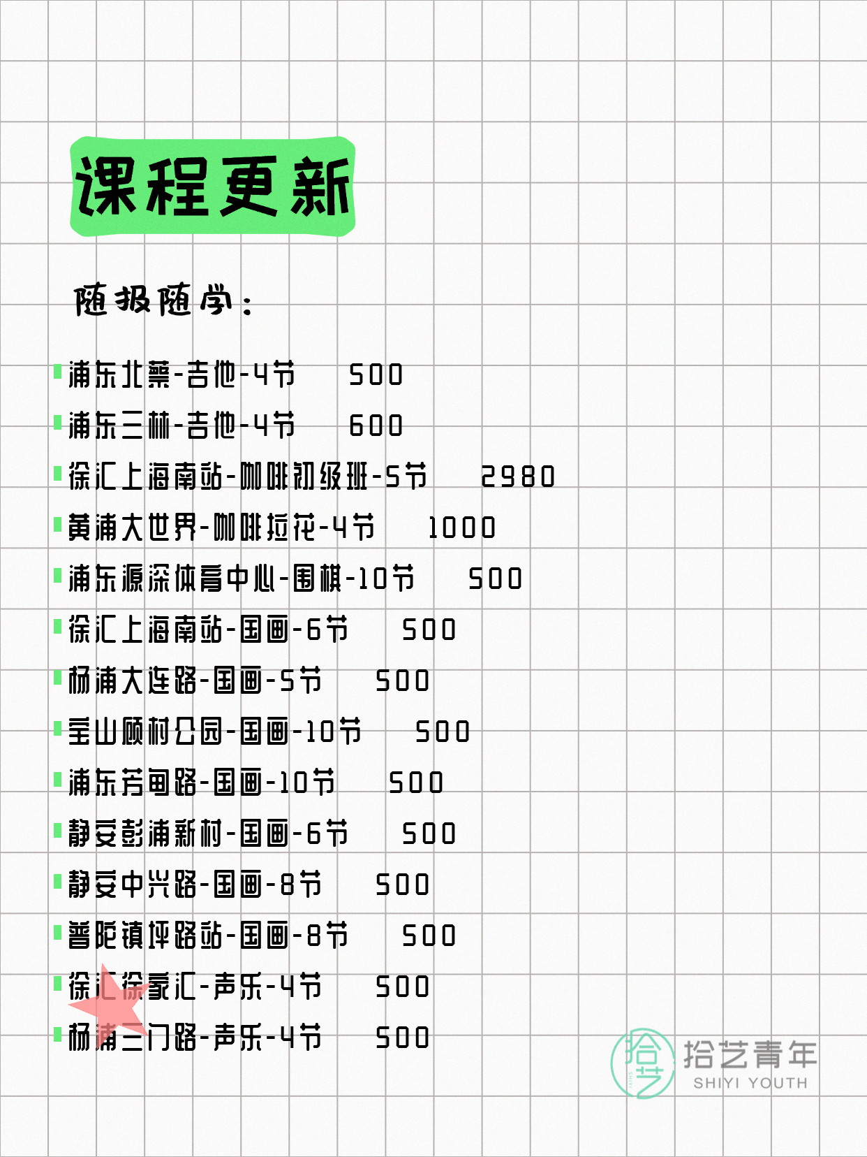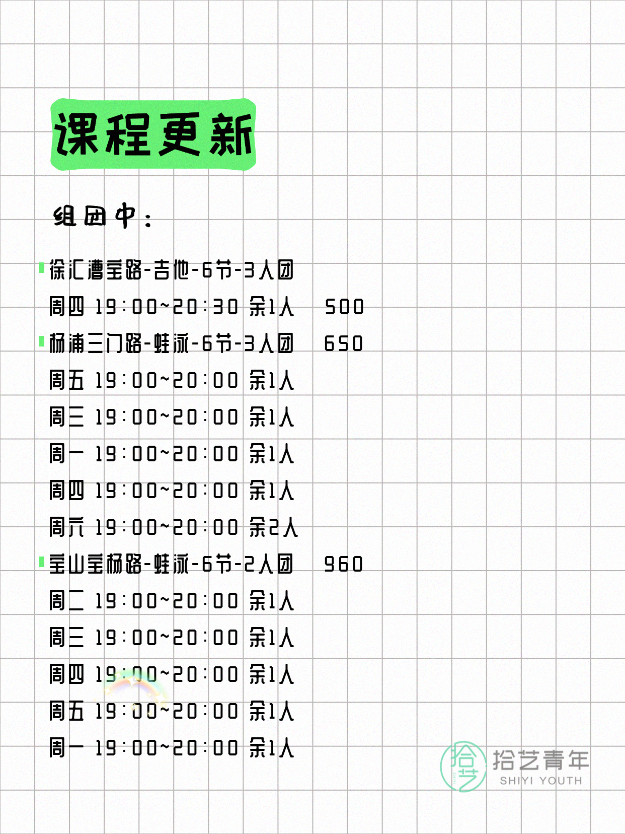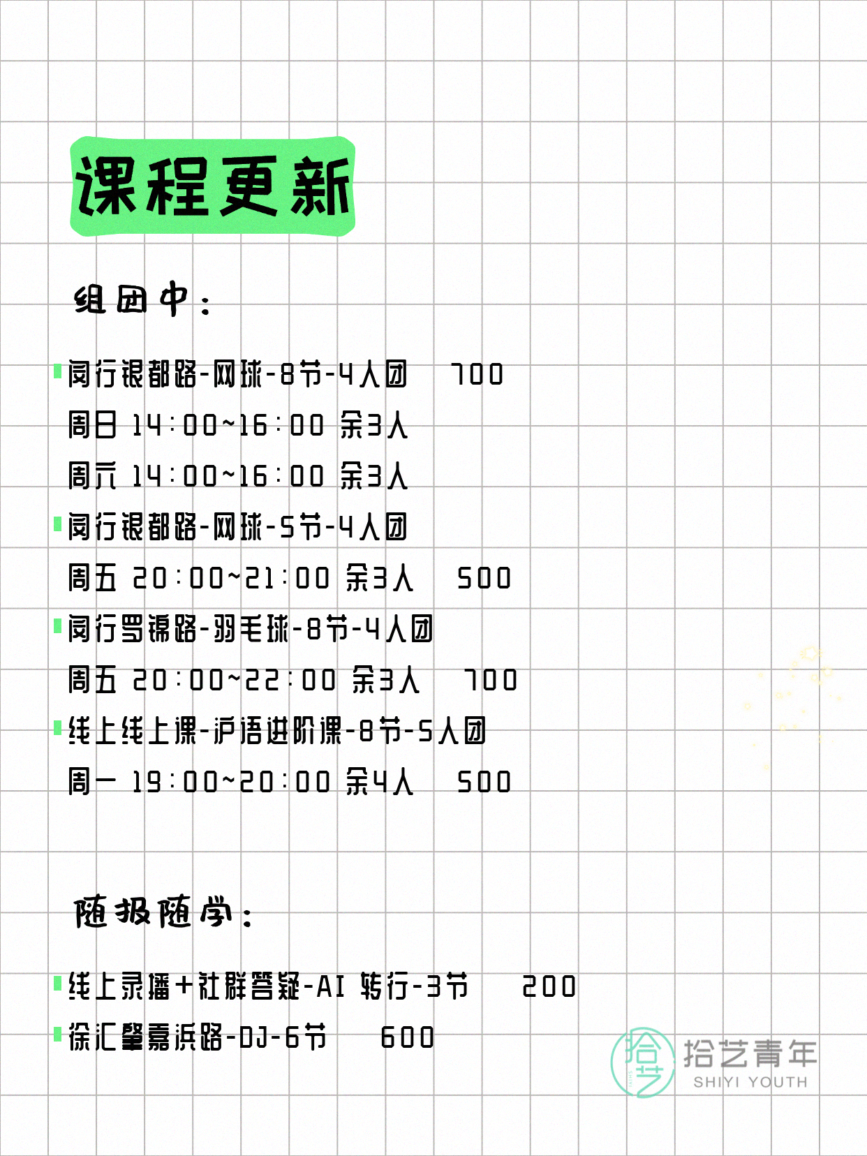 资讯>综合>正文4月29日上海夜校课程合集拾艺青年2026-04-291 / 17📊 本期课程概况• 总课程数:664门• 组团中课程:71门• 覆盖区域:15个区详见图片,欢迎报名咨询。💡 提示:以上课程信息来自拾艺青年小程序,课程可能随报名动态变化,具体以小程序实时信息为准。👉 微信小程序链接:#小程序://拾艺青年/WmfwH22mnQUxZwb