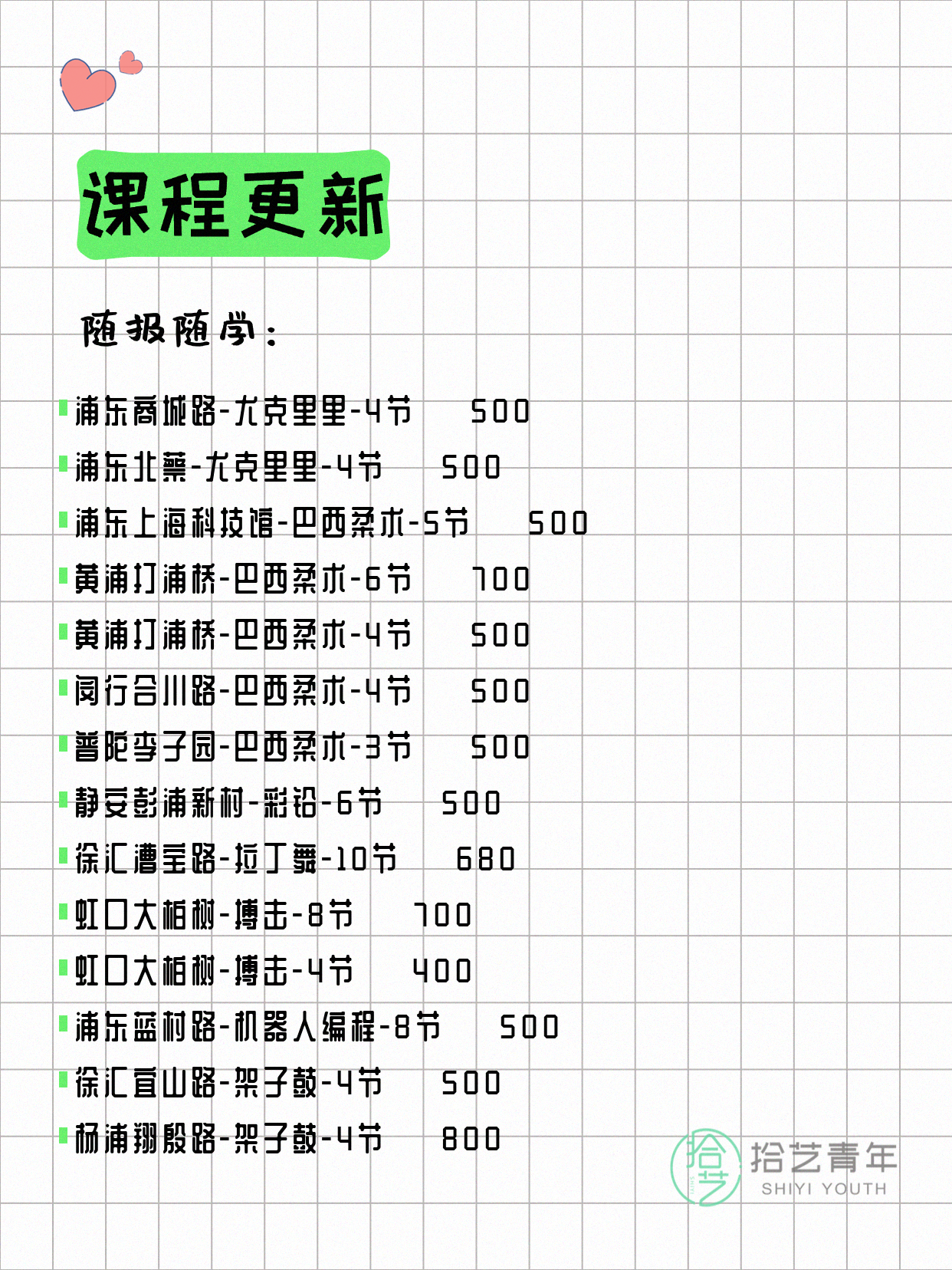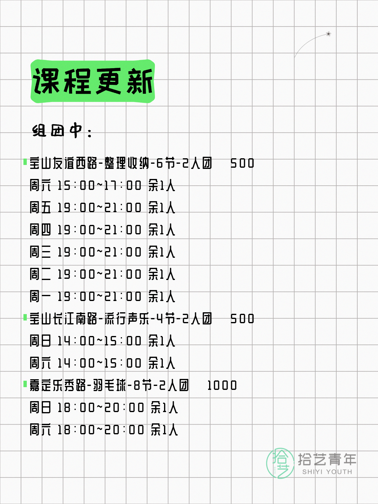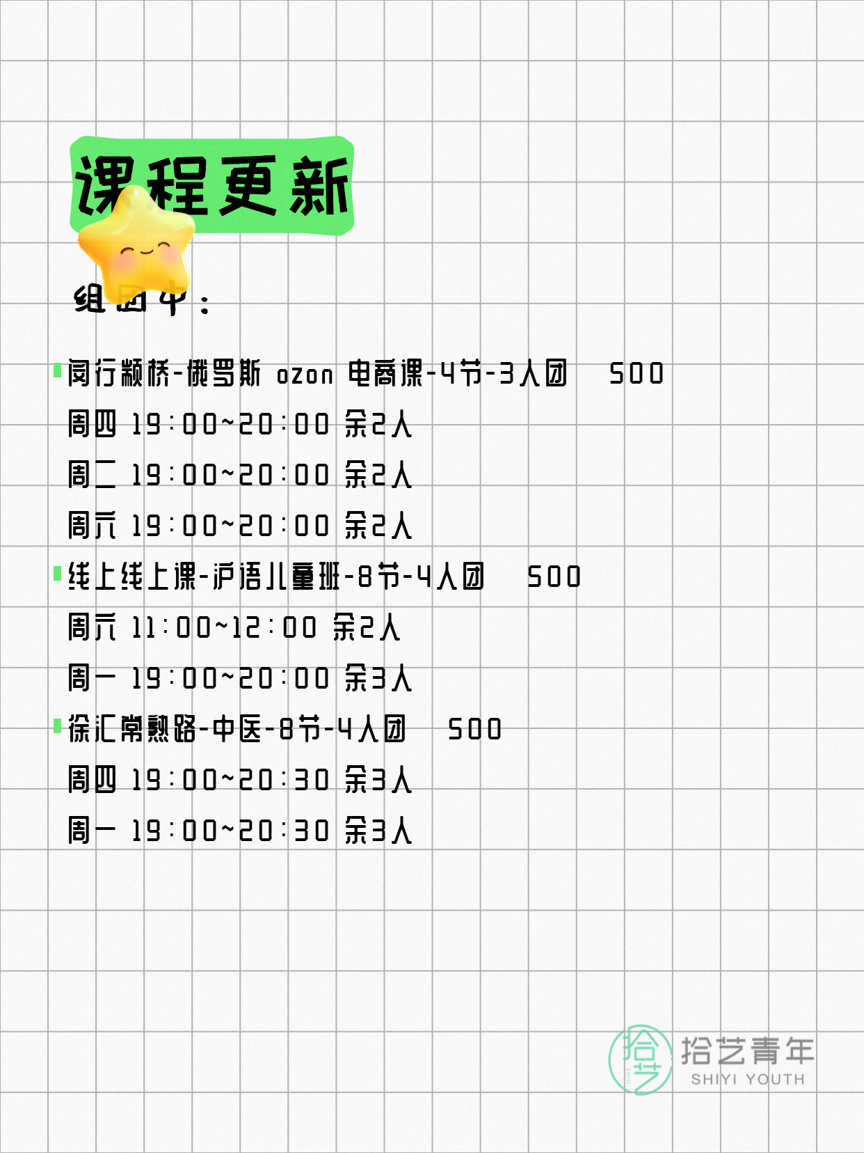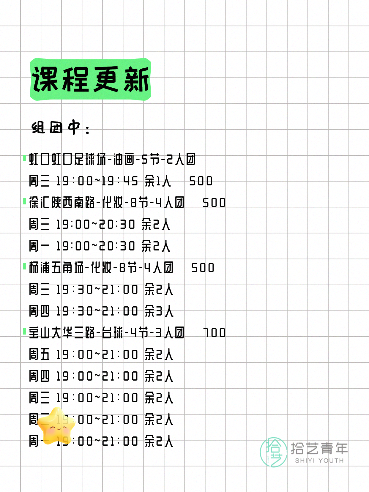 资讯>综合>正文4月29日上海夜校课程合集拾艺青年2026-04-291 / 17📊 本期课程概况• 总课程数:664门• 组团中课程:71门• 覆盖区域:15个区详见图片,欢迎报名咨询。💡 提示:以上课程信息来自拾艺青年小程序,课程可能随报名动态变化,具体以小程序实时信息为准。👉 微信小程序链接:#小程序://拾艺青年/WmfwH22mnQUxZwb