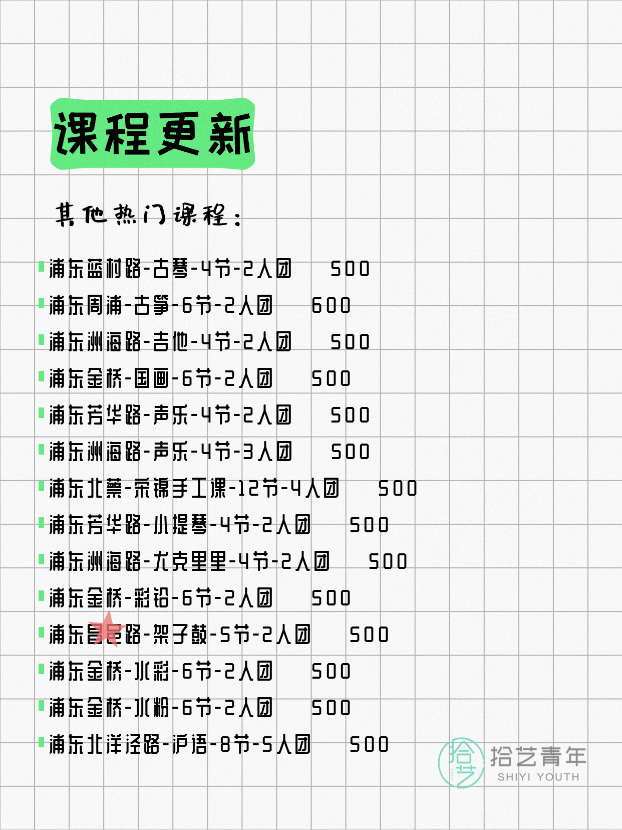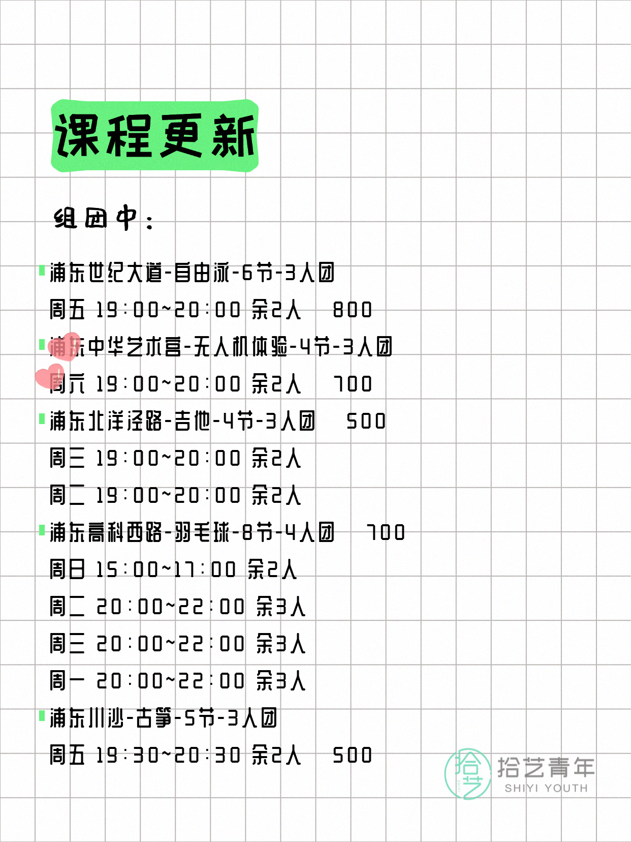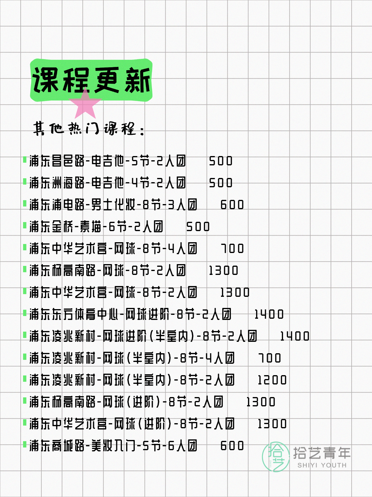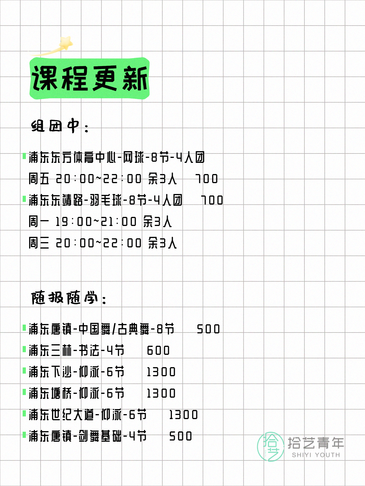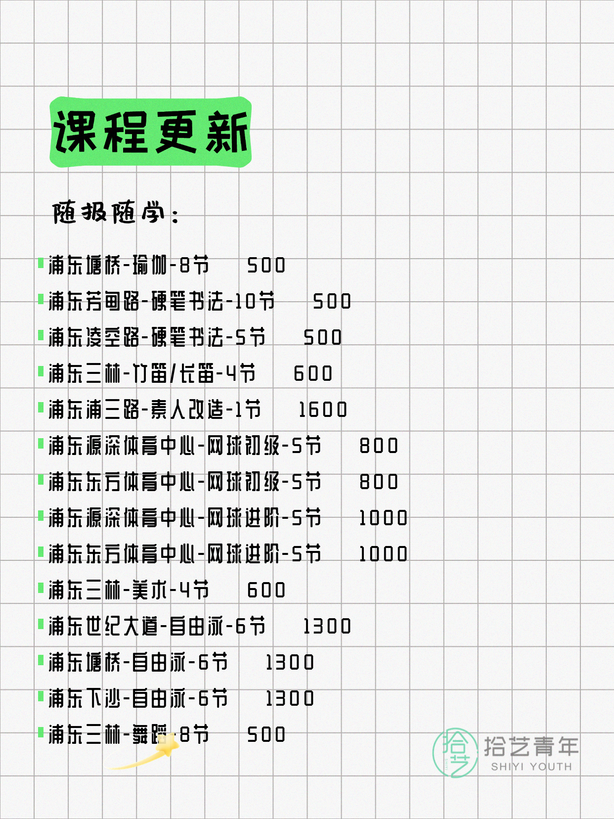 💡 提示:以上课程信息来自拾艺青年小程序,课程可能随报名动态变化,具体以小程序实时信息为准。