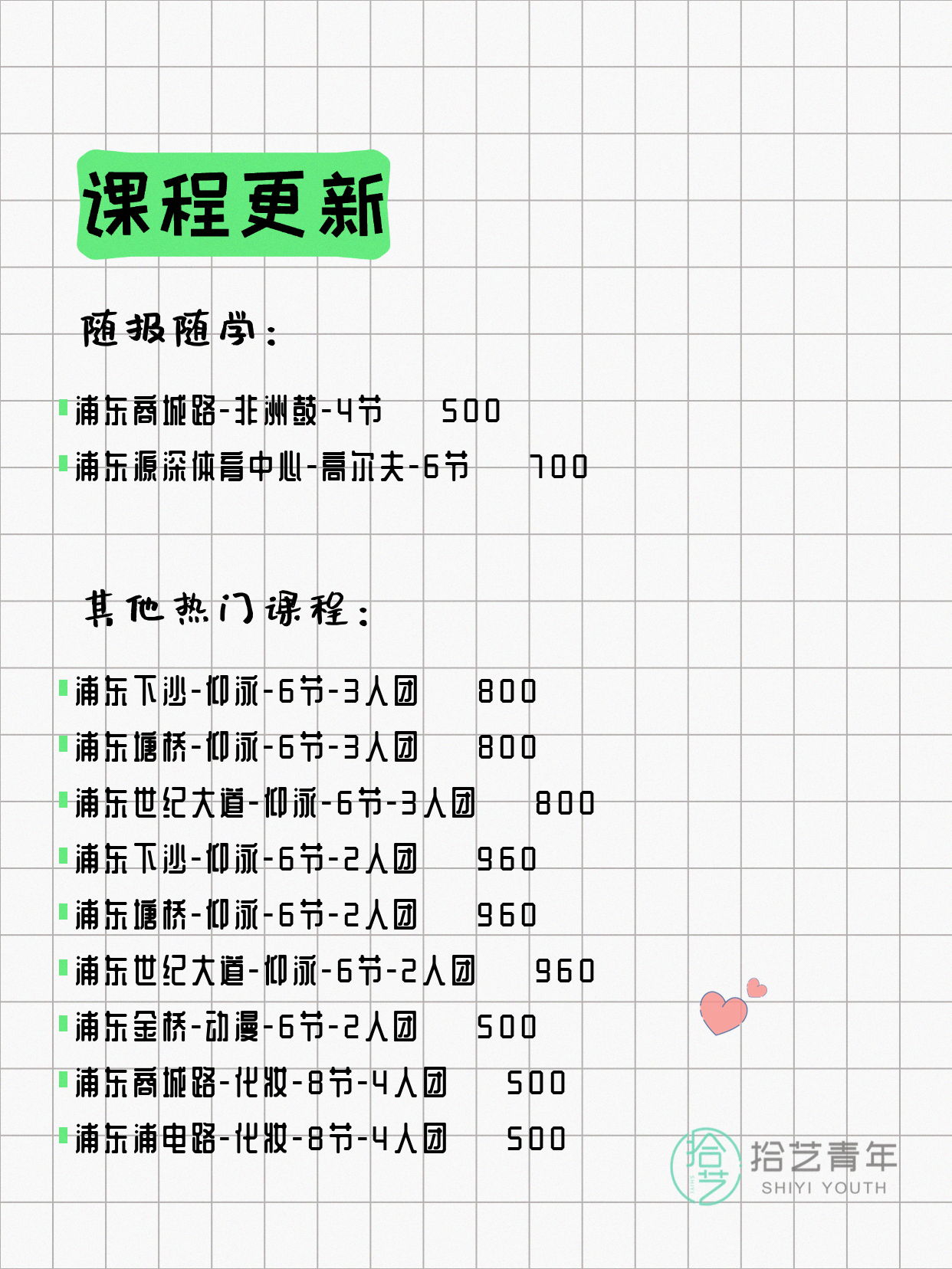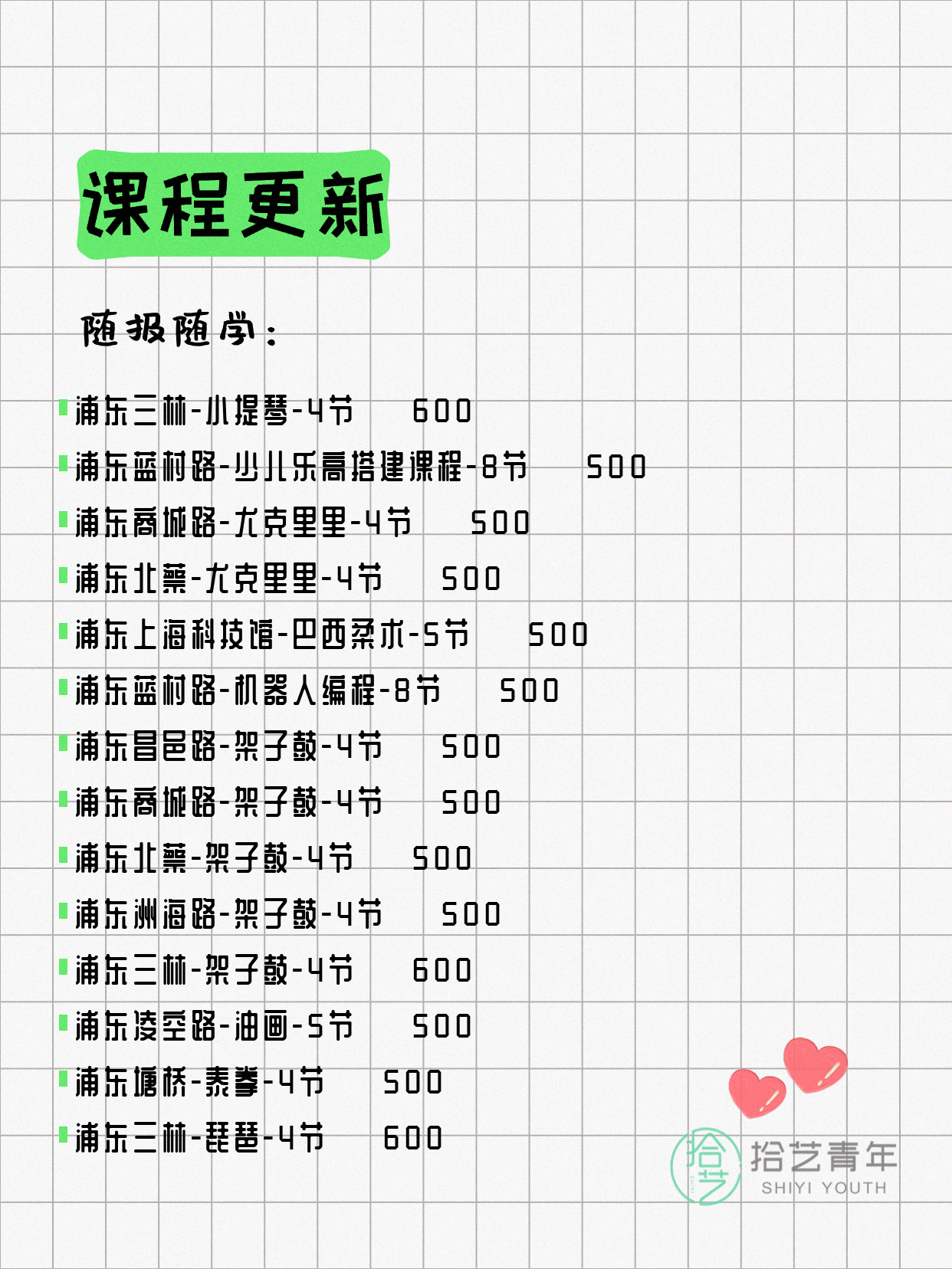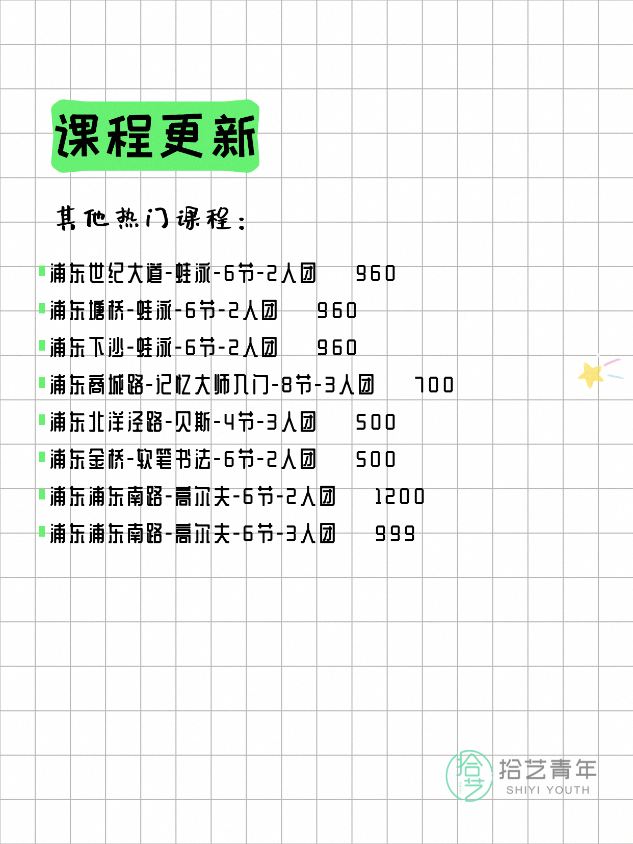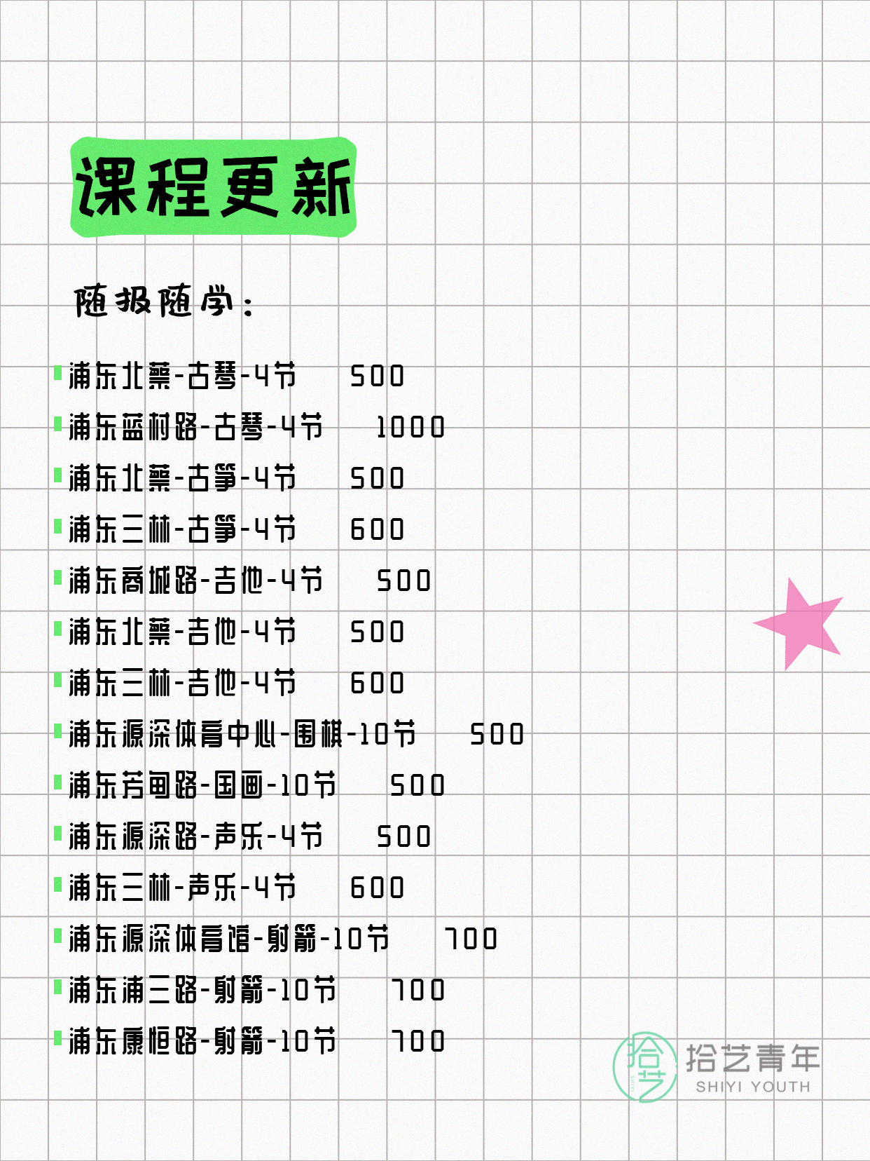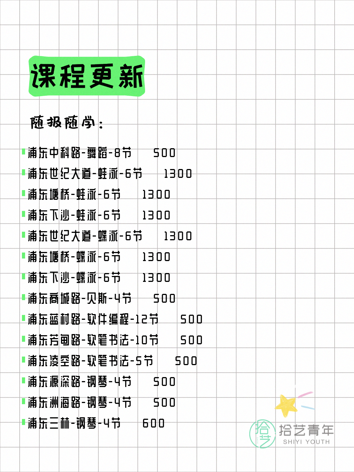💡 提示:以上课程信息来自拾艺青年小程序,课程可能随报名动态变化,具体以小程序实时信息为准。