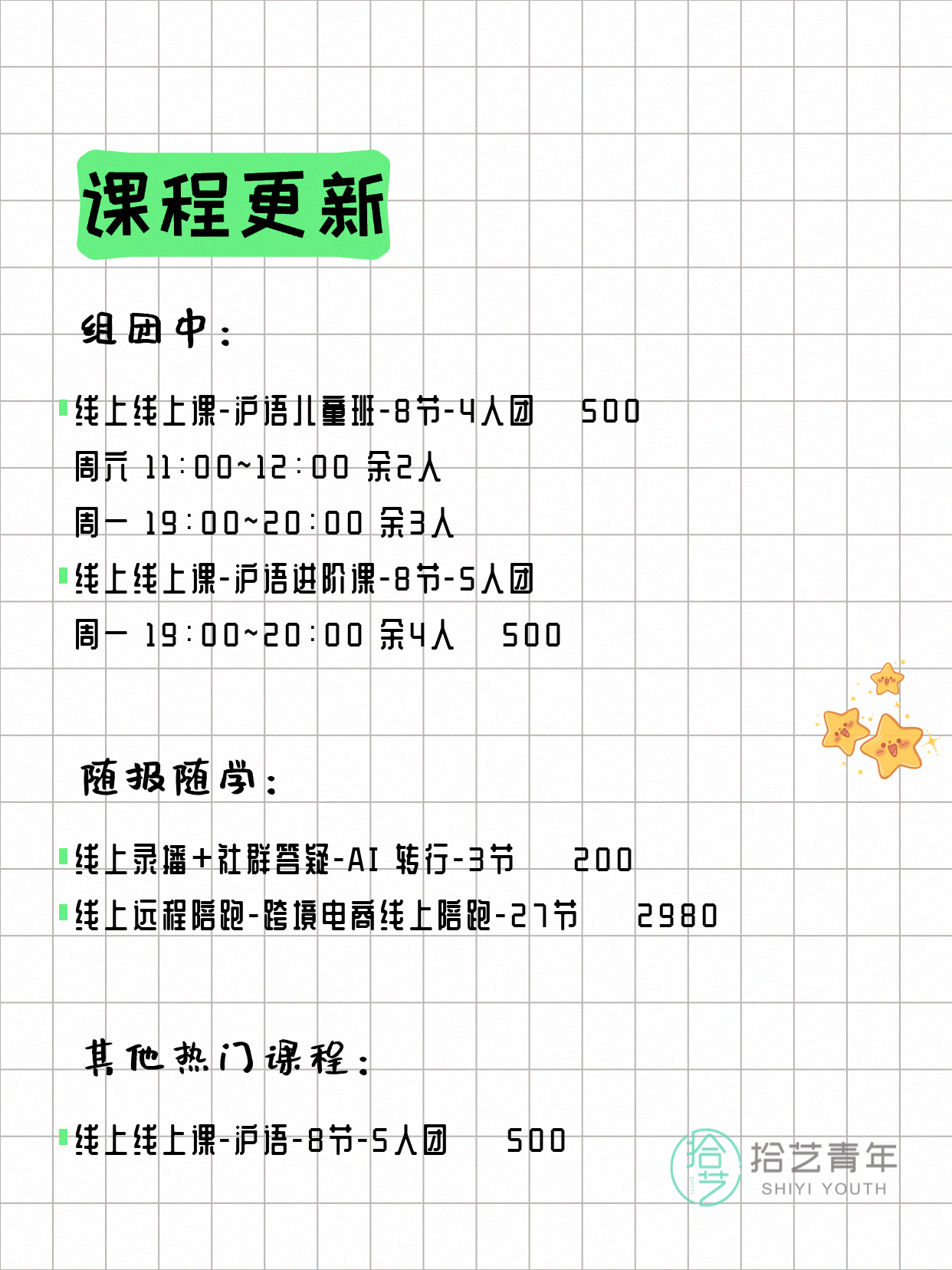 💡 提示:以上课程信息来自拾艺青年小程序,课程可能随报名动态变化,具体以小程序实时信息为准。