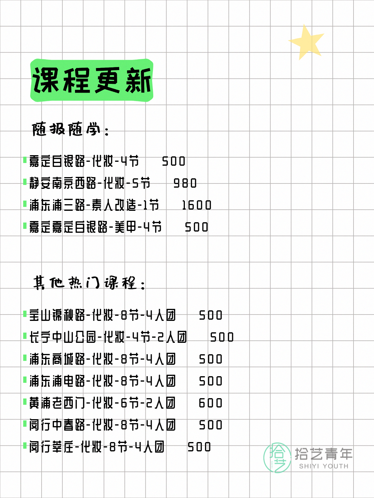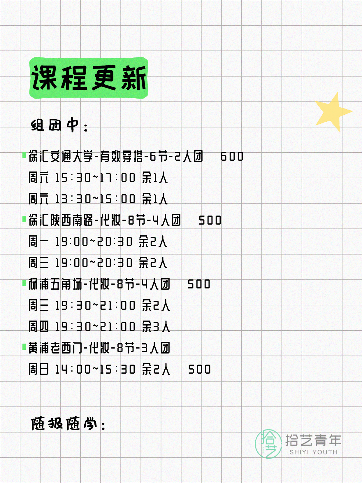 💡 提示:以上课程信息来自拾艺青年小程序,课程可能随报名动态变化,具体以小程序实时信息为准。