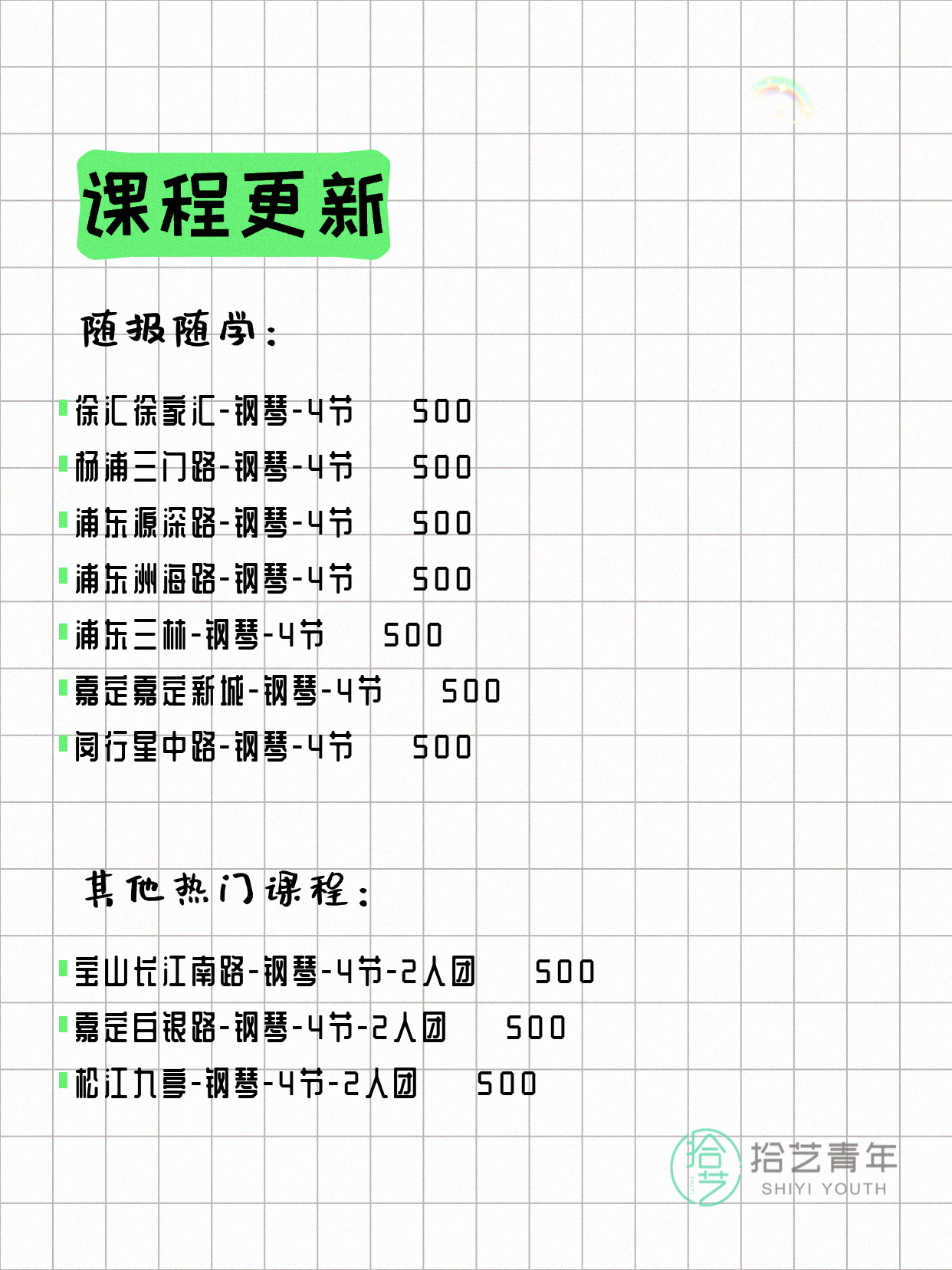 💡 提示:以上课程信息来自拾艺青年小程序,课程可能随报名动态变化,具体以小程序实时信息为准。