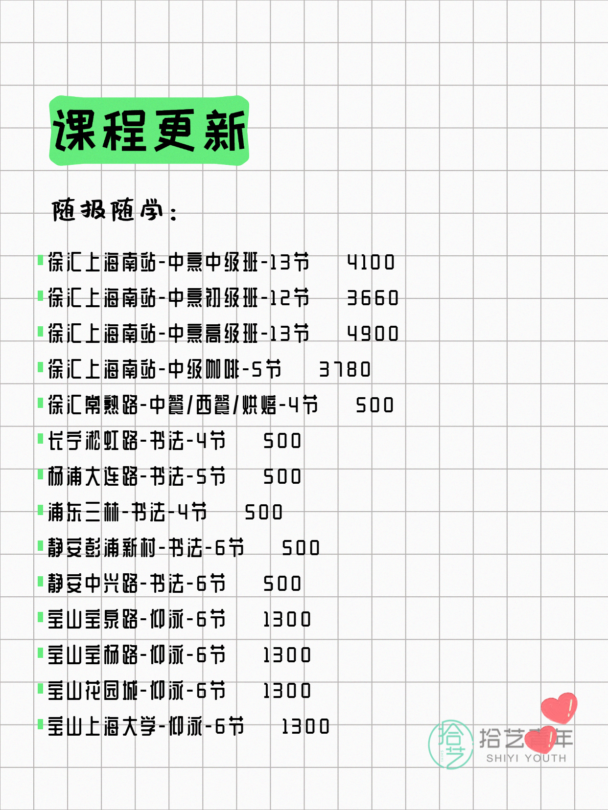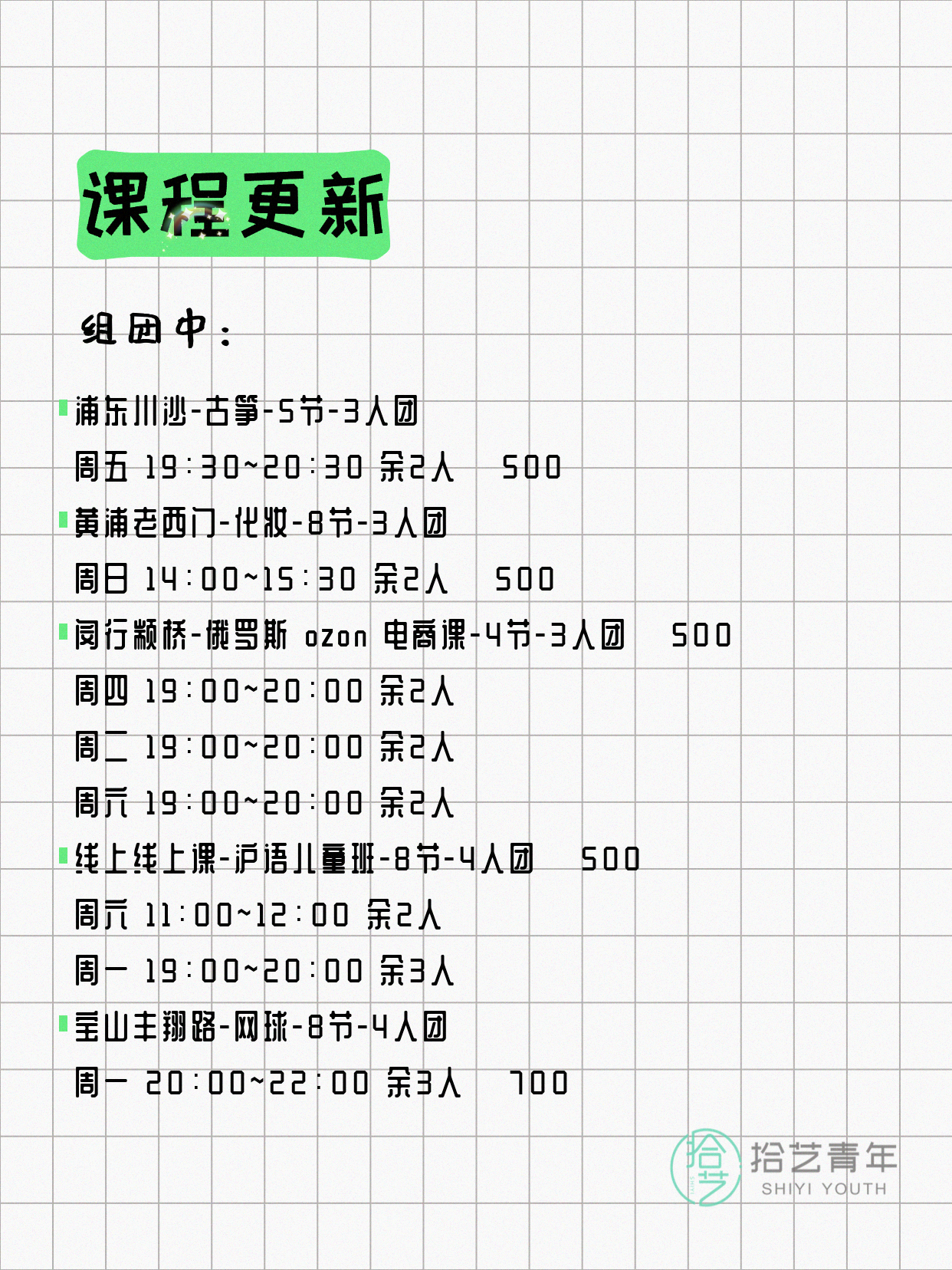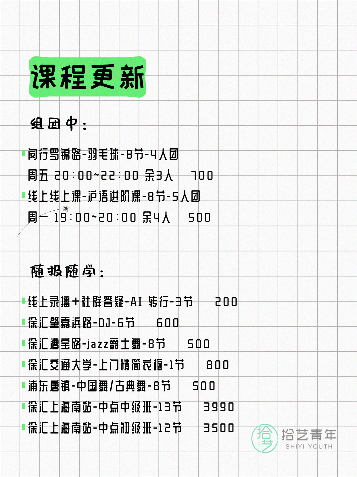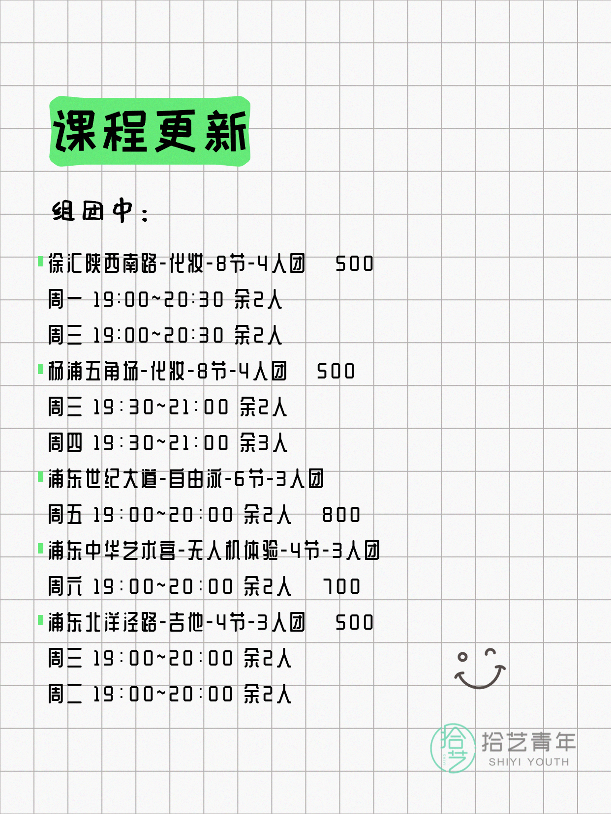 资讯>综合>正文4月30日上海夜校课程合集拾艺青年2026-04-301 / 17📊 本期课程概况• 总课程数:681门• 组团中课程:83门• 覆盖区域:15个区详见图片,欢迎报名咨询。💡 提示:以上课程信息来自拾艺青年小程序,课程可能随报名动态变化,具体以小程序实时信息为准。👉 微信小程序链接:#小程序://拾艺青年/WmfwH22mnQUxZwb
