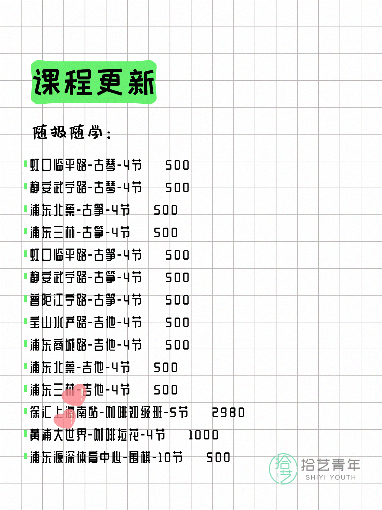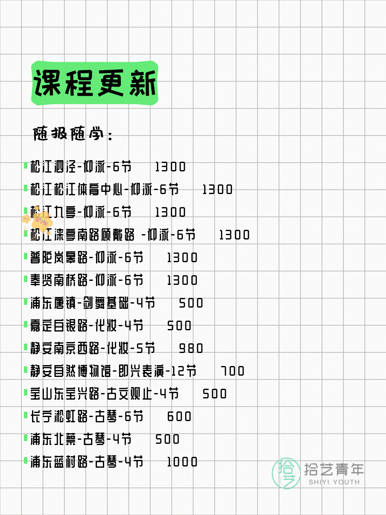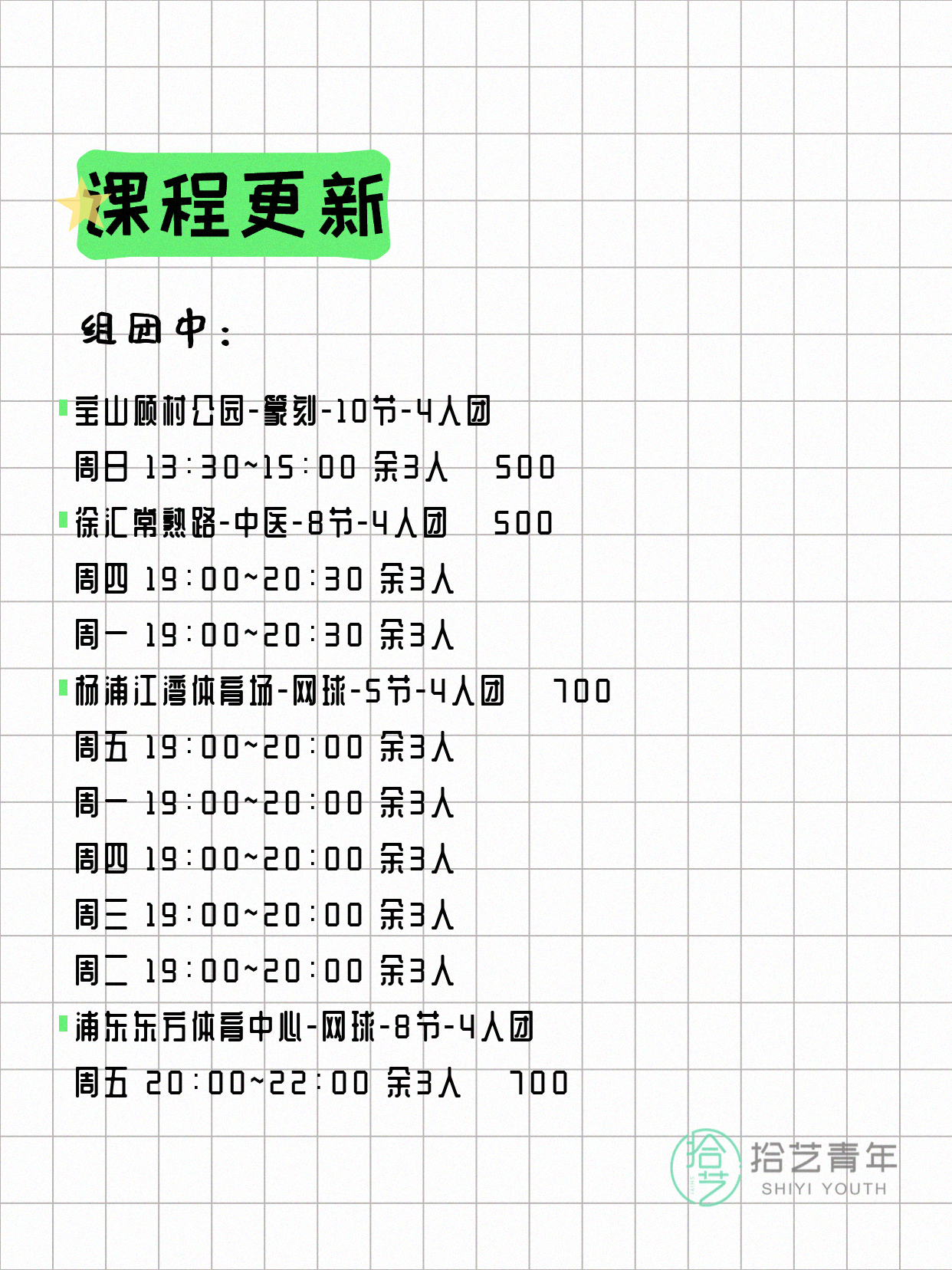 资讯>综合>正文4月30日上海夜校课程合集拾艺青年2026-04-301 / 17📊 本期课程概况• 总课程数:681门• 组团中课程:83门• 覆盖区域:15个区详见图片,欢迎报名咨询。💡 提示:以上课程信息来自拾艺青年小程序,课程可能随报名动态变化,具体以小程序实时信息为准。👉 微信小程序链接:#小程序://拾艺青年/WmfwH22mnQUxZwb