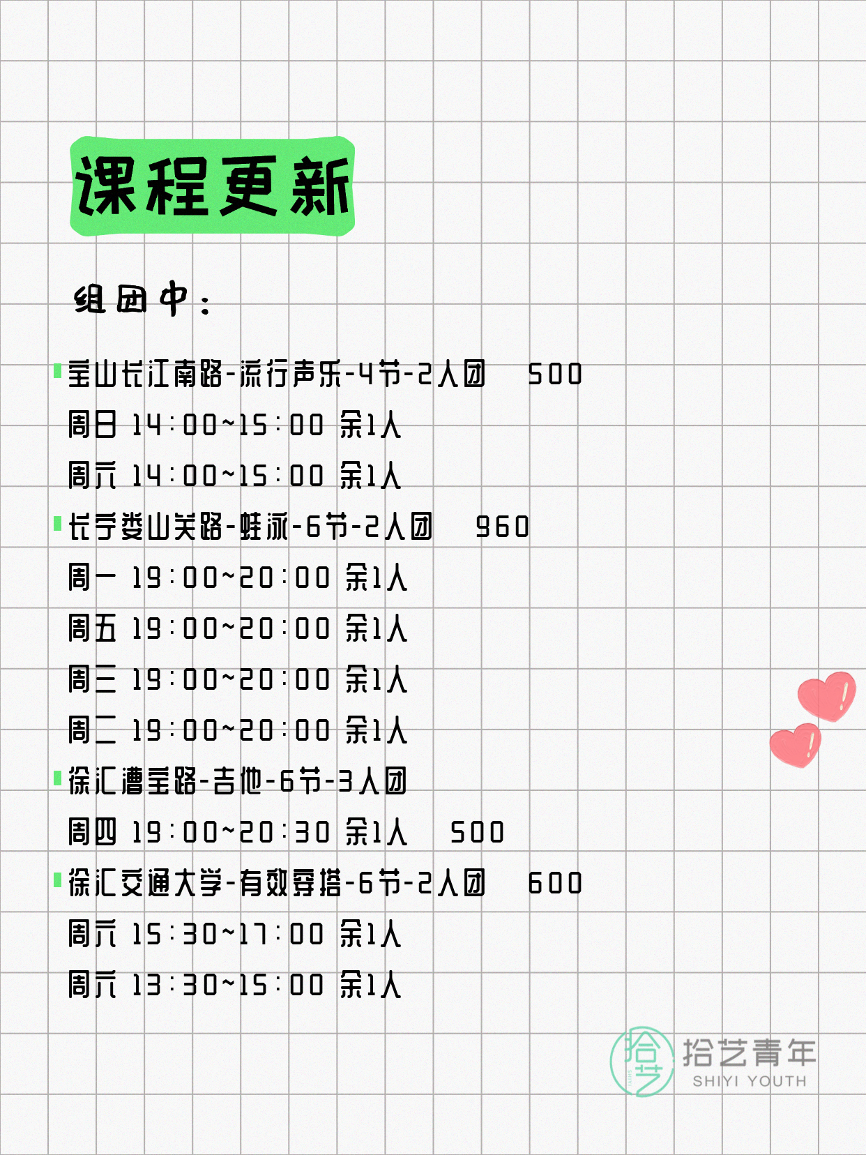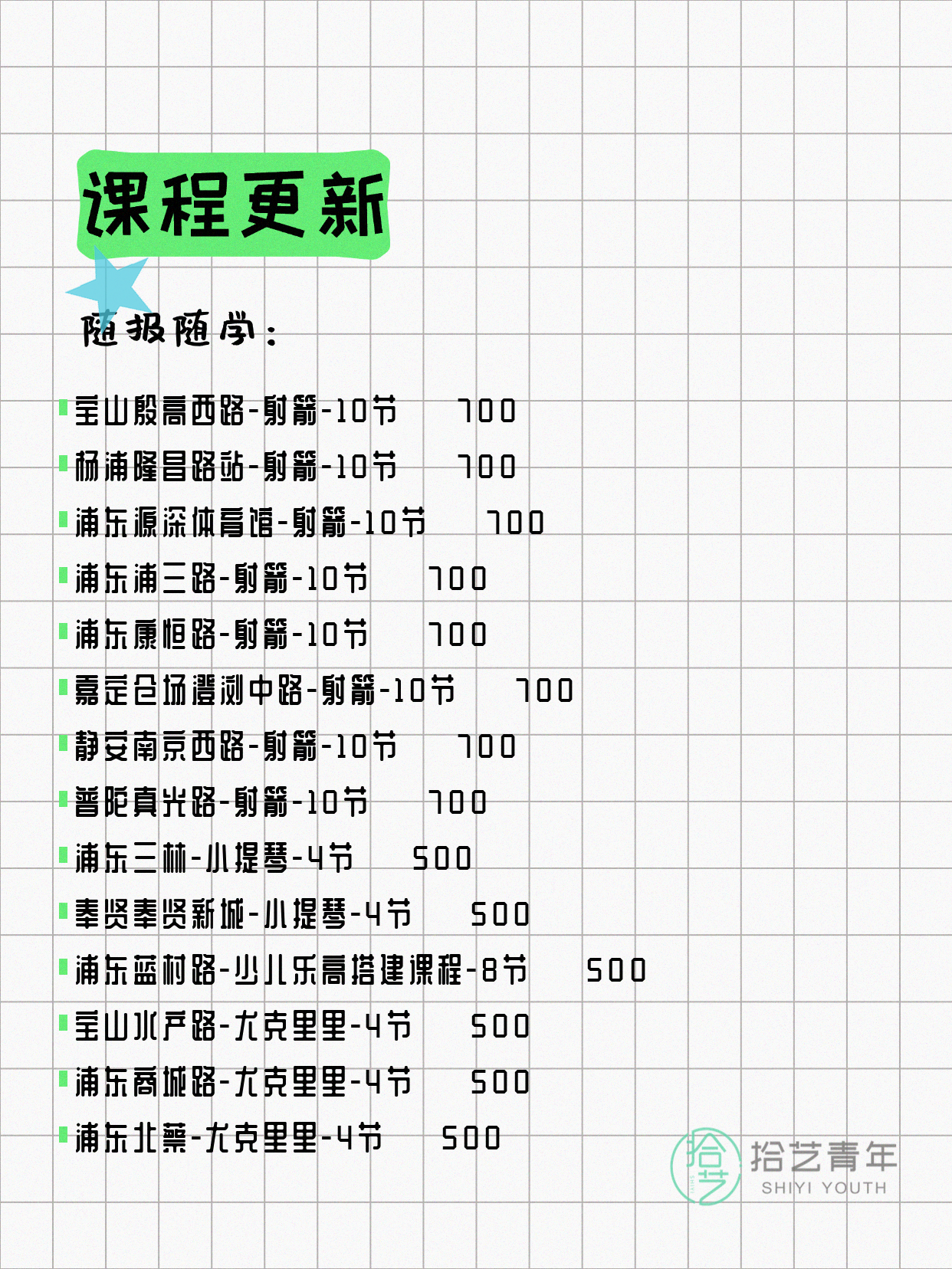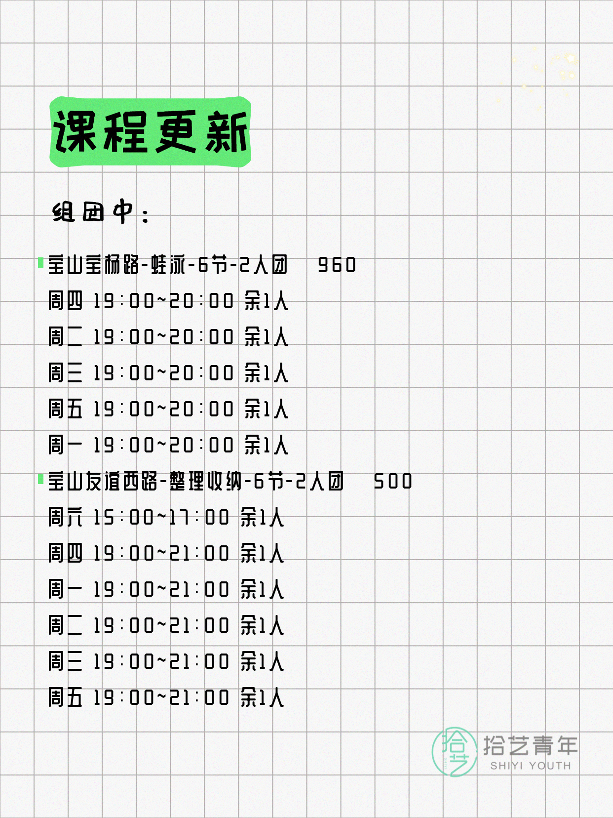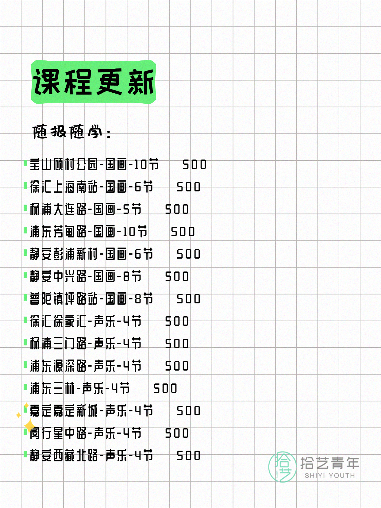 资讯>综合>正文4月30日上海夜校课程合集拾艺青年2026-04-301 / 17📊 本期课程概况• 总课程数:681门• 组团中课程:83门• 覆盖区域:15个区详见图片,欢迎报名咨询。💡 提示:以上课程信息来自拾艺青年小程序,课程可能随报名动态变化,具体以小程序实时信息为准。👉 微信小程序链接:#小程序://拾艺青年/WmfwH22mnQUxZwb