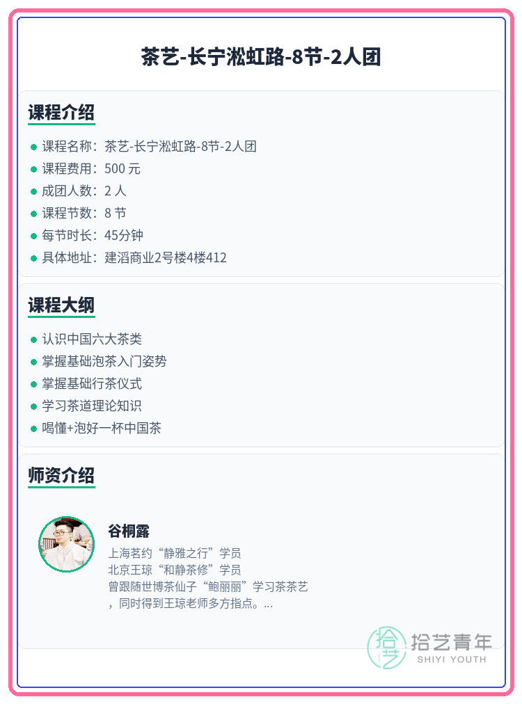 资讯>综合>正文长宁茶艺差1人就开课|淞虹路拾艺青年2026-03-081 / 2还差1人就开课啦!茶艺的小伙伴们速来~🙋🏫 上课地点:建滔商业2号楼4楼412📅 课程安排:共8节 | 周日 16:30-18:00📖 课程大纲:认识中国六大茶类掌握基础泡茶入门姿势掌握基础行茶仪式学习茶道理论知识喝懂+泡好一杯中国茶👥 2人团 | 已报1人 | 还差1人开课#上海夜校 #长宁夜校 #茶艺课程 #夜校拼团 #上海线下课相关标签#上海夜校#长宁夜校#茶艺课程#夜校拼团#上海线下课