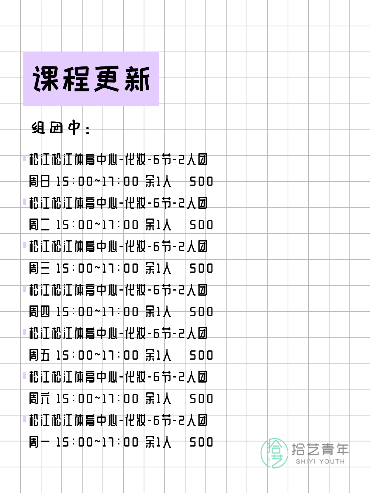 - 松江松江体育中心-化妆-6节-2人团 周二 15:00-17:00 余1人 💰 500