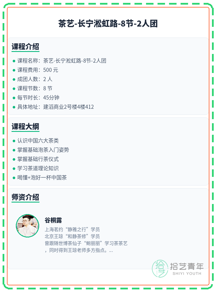 资讯>综合>正文淞虹路茶艺课差1人就能开课啦拾艺青年2026-03-101 / 2长宁淞虹路的茶艺搭子快冲!就差你1个就能上课啦🍵🏫 上课地点:建滔商业2号楼4楼412📅 课程安排:共8节 | 周日 16:30-18:00📖 课程大纲:认识中国六大茶类掌握基础泡茶入门姿势掌握基础行茶仪式学习茶道理论知识喝懂+泡好一杯中国茶👥 2人团 | 已报1人 | 还差1人开课#上海夜校 #长宁夜校 #茶艺课程 #夜校拼团 #上海线下课相关标签#上海夜校#长宁夜校#茶艺课程#夜校拼团#上海线下课