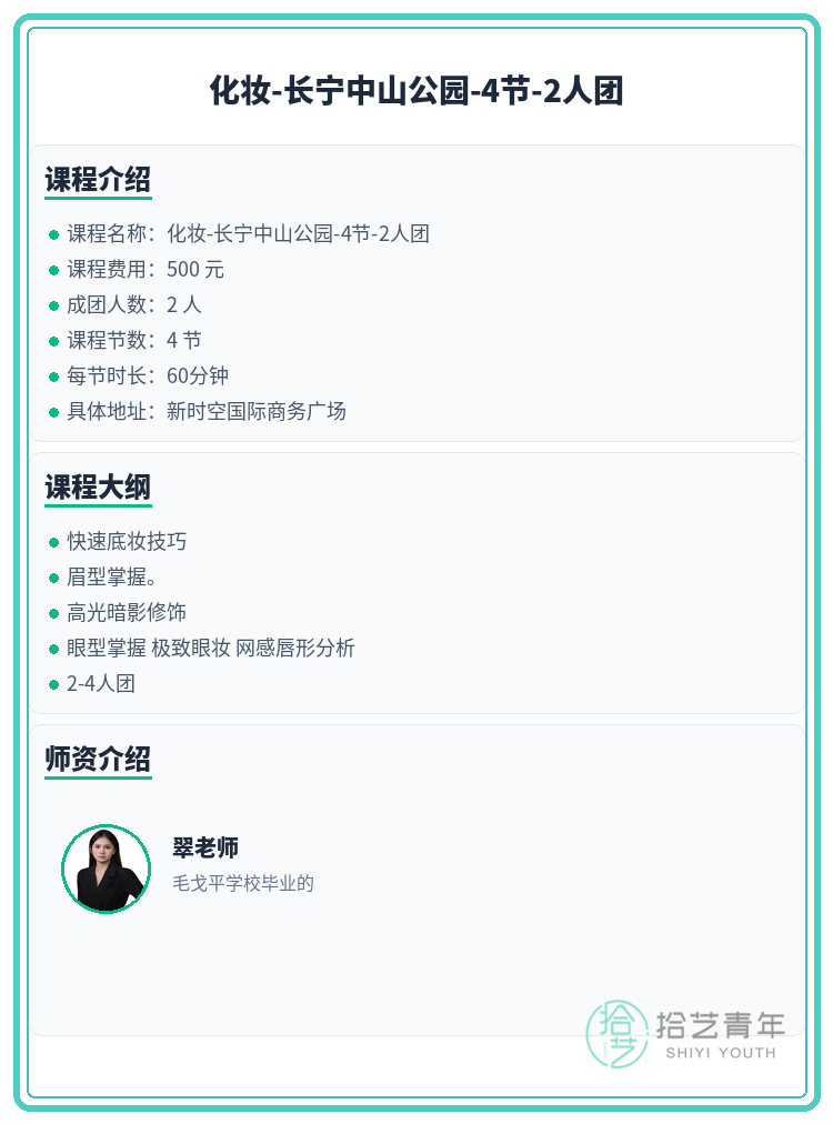 资讯>综合>正文长宁化妆课差1人 速来凑局拾艺青年2026-03-111 / 2中山公园旁化妆课就差最后1个你!快冲✨🏫 上课地点:新时空国际商务广场📅 课程安排:共4节 | 周五 19:30-20:30📖 课程大纲:快速底妆技巧眉型掌握。高光暗影修饰眼型掌握 极致眼妆 网感唇形分析2-4人团👥 2人团 | 已报1人 | 还差1人开课#上海夜校 #长宁夜校 #化妆课程 #夜校拼团 #上海线下课相关标签#上海夜校#长宁夜校#化妆课程#夜校拼团#上海线下课