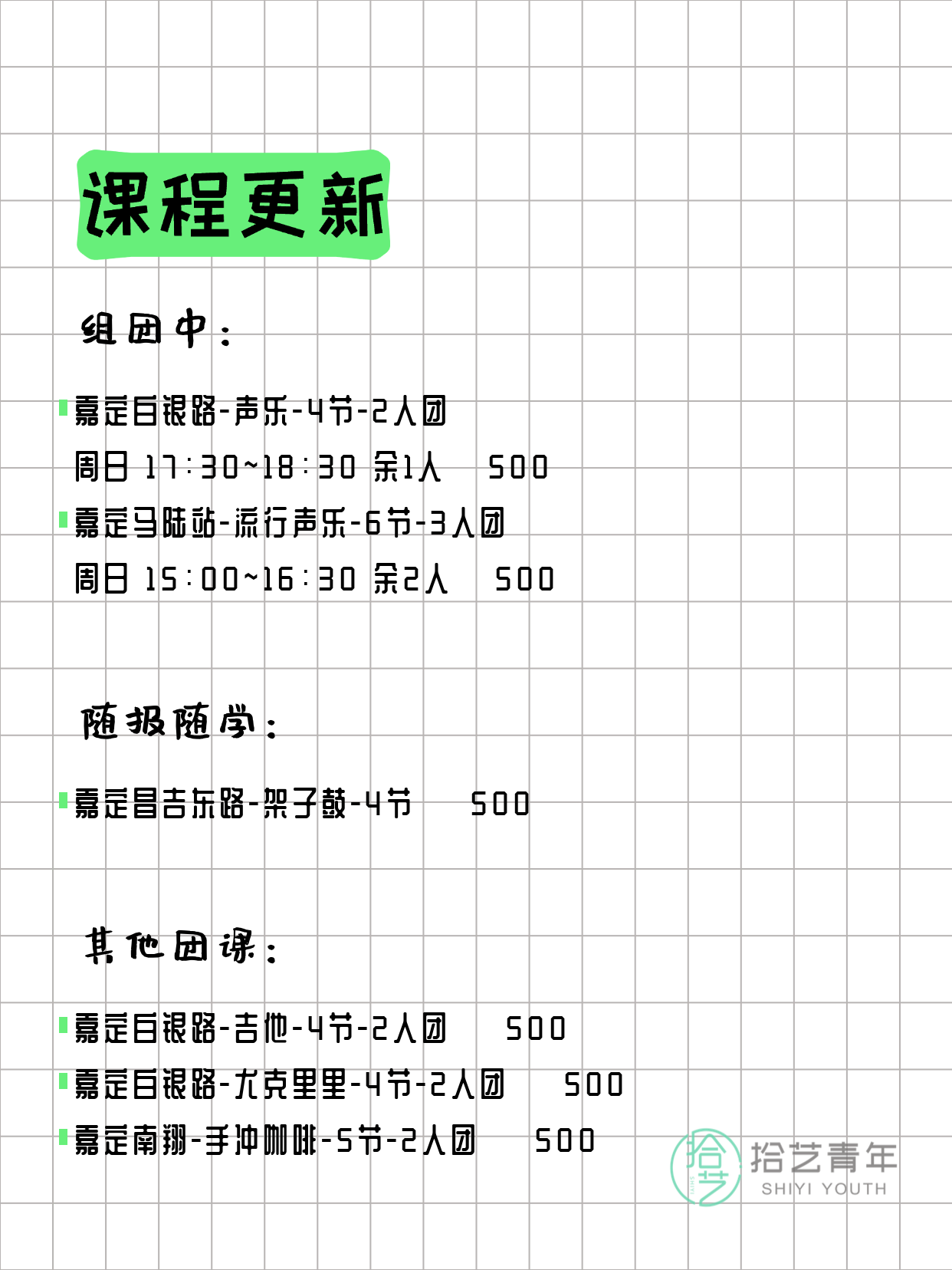 - 嘉定白银路-声乐-4节-2人团 周日 17:30-18:30 余1人 💰 500