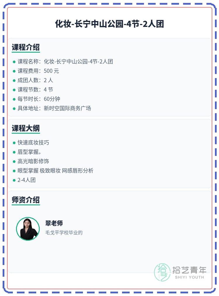 资讯>综合>正文长宁中山公园化妆课 差1人开课拾艺青年2026-03-111 / 2中山公园附近的化妆搭子快冲!差你1个就能开班啦 💄🏫 上课地点:新时空国际商务广场📅 课程安排:共4节 | 周五 19:30-20:30📖 课程大纲:快速底妆技巧眉型掌握。高光暗影修饰眼型掌握 极致眼妆 网感唇形分析2-4人团👥 2人团 | 已报1人 | 还差1人开课#上海夜校 #长宁夜校 #化妆课程 #夜校拼团 #上海线下课相关标签#上海夜校#长宁夜校#化妆课程#夜校拼团#上海线下课