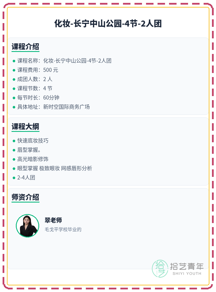 资讯>综合>正文中山公园化妆课差1人就开课拾艺青年2026-03-121 / 2长宁中山公园的化妆搭子!就差你最后1位开课啦💄🏫 上课地点:新时空国际商务广场📅 课程安排:共4节 | 周六 19:30-20:30📖 课程大纲:快速底妆技巧眉型掌握。高光暗影修饰眼型掌握 极致眼妆 网感唇形分析2-4人团👥 2人团 | 已报1人 | 还差1人开课#上海夜校 #长宁夜校 #化妆课程 #夜校拼团 #上海线下课相关标签#上海夜校#长宁夜校#化妆课程#夜校拼团#上海线下课