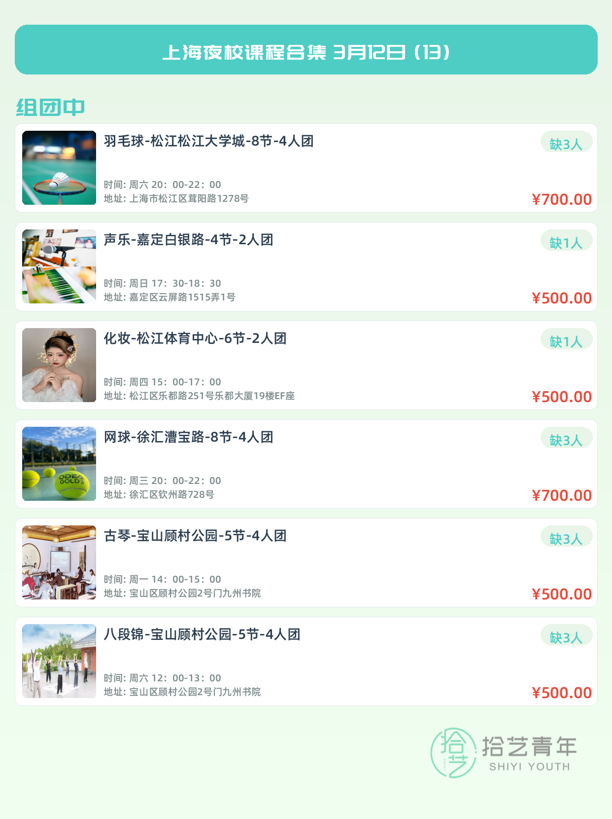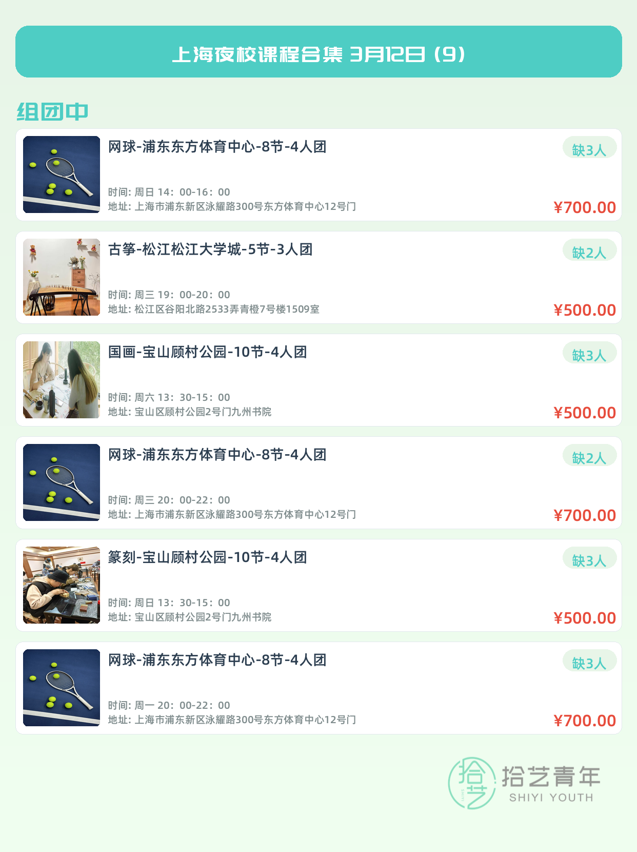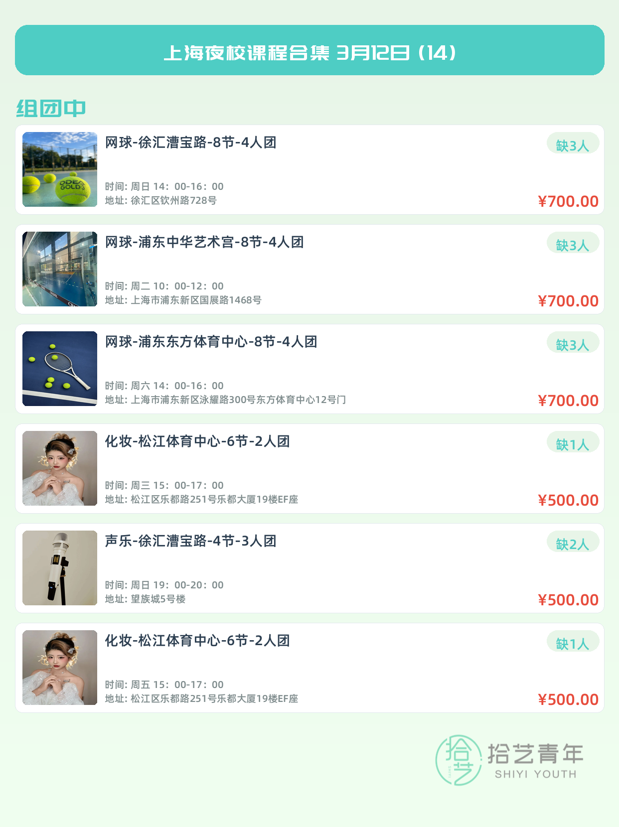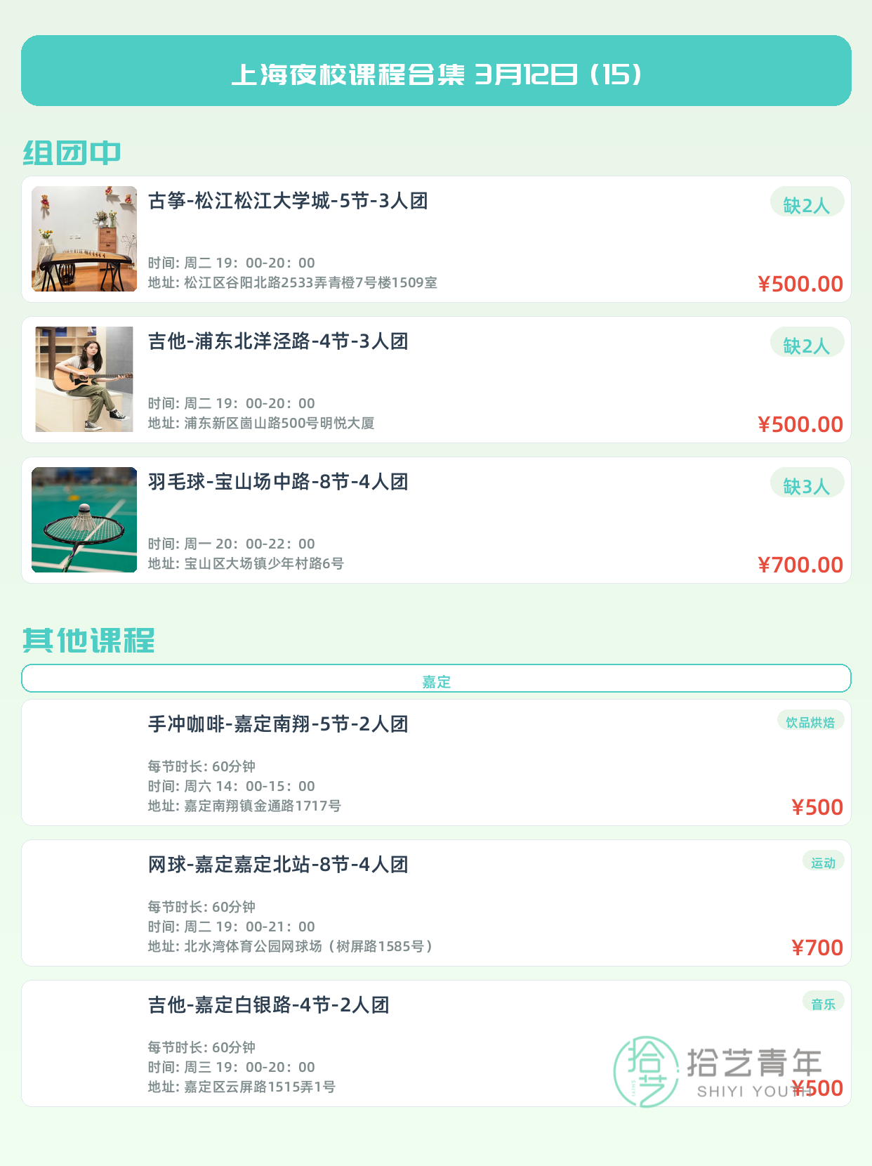 💡 提示:以上课程信息来自拾艺青年小程序,课程可能随报名动态变化,具体以小程序实时信息为准。