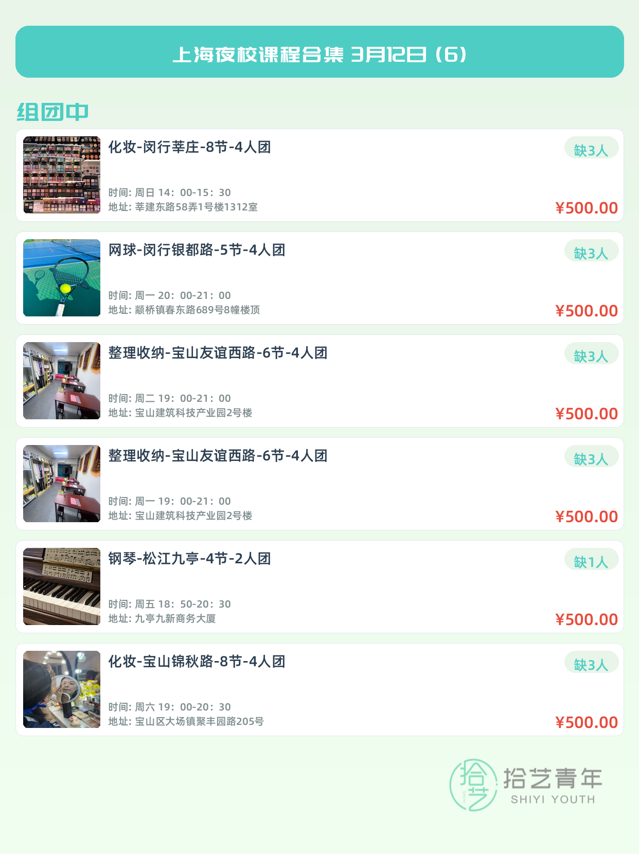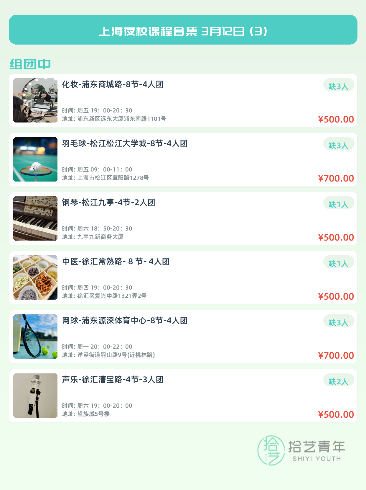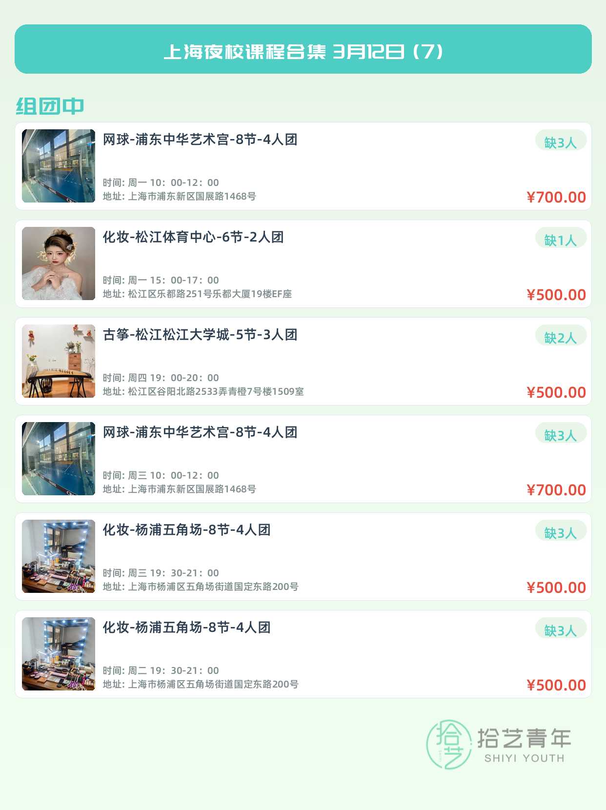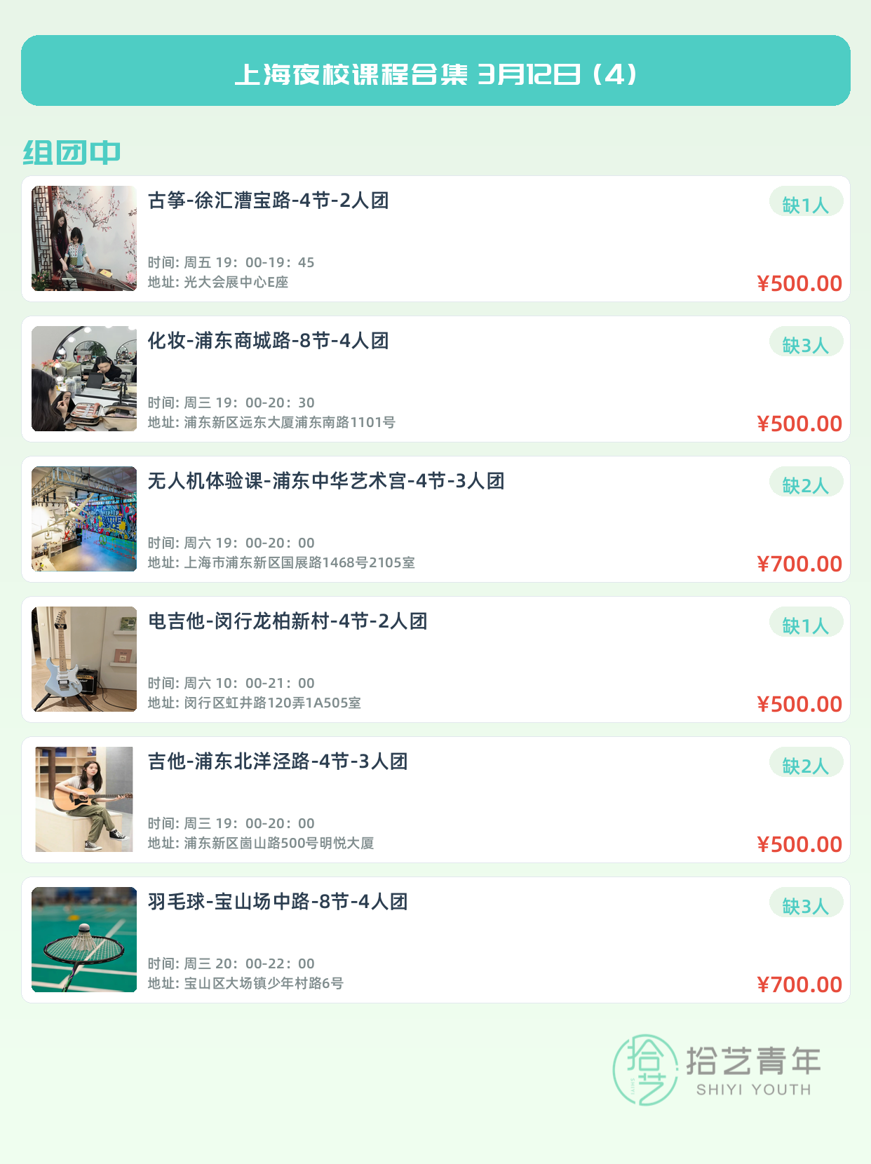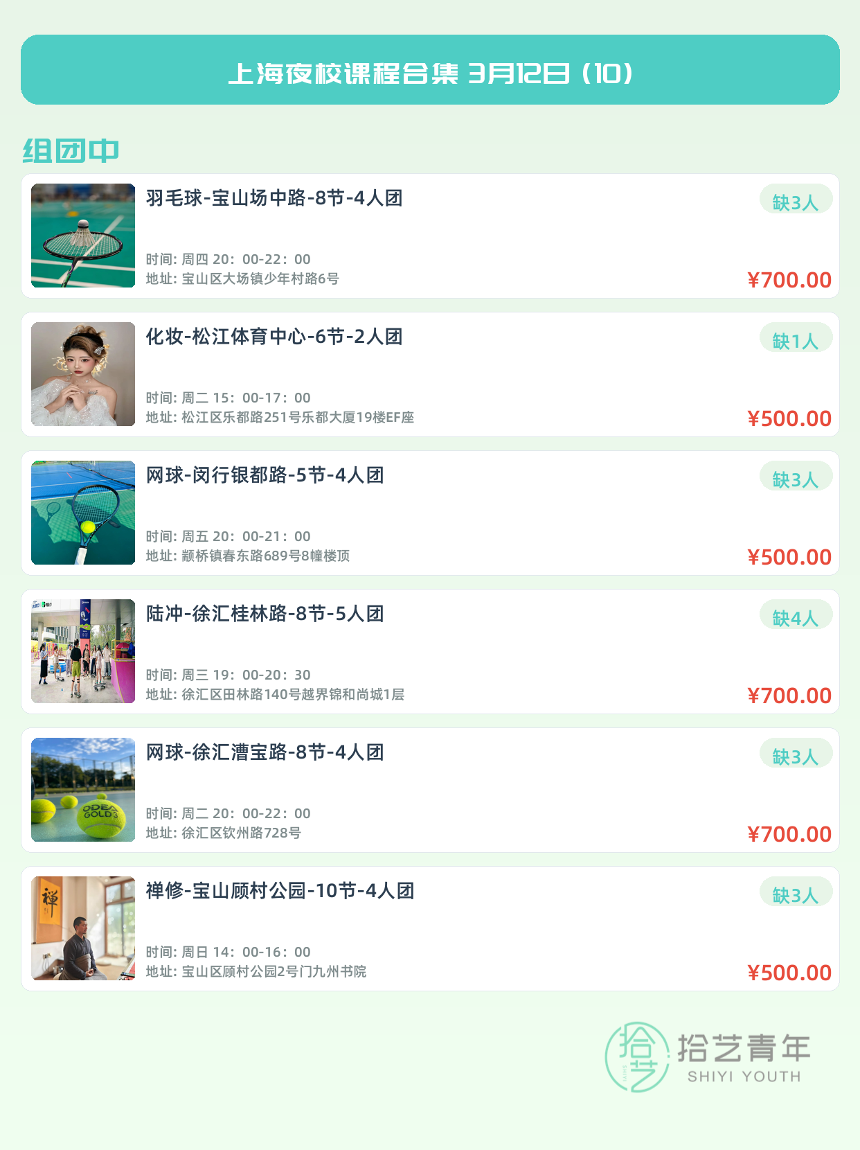 💡 提示:以上课程信息来自拾艺青年小程序,课程可能随报名动态变化,具体以小程序实时信息为准。