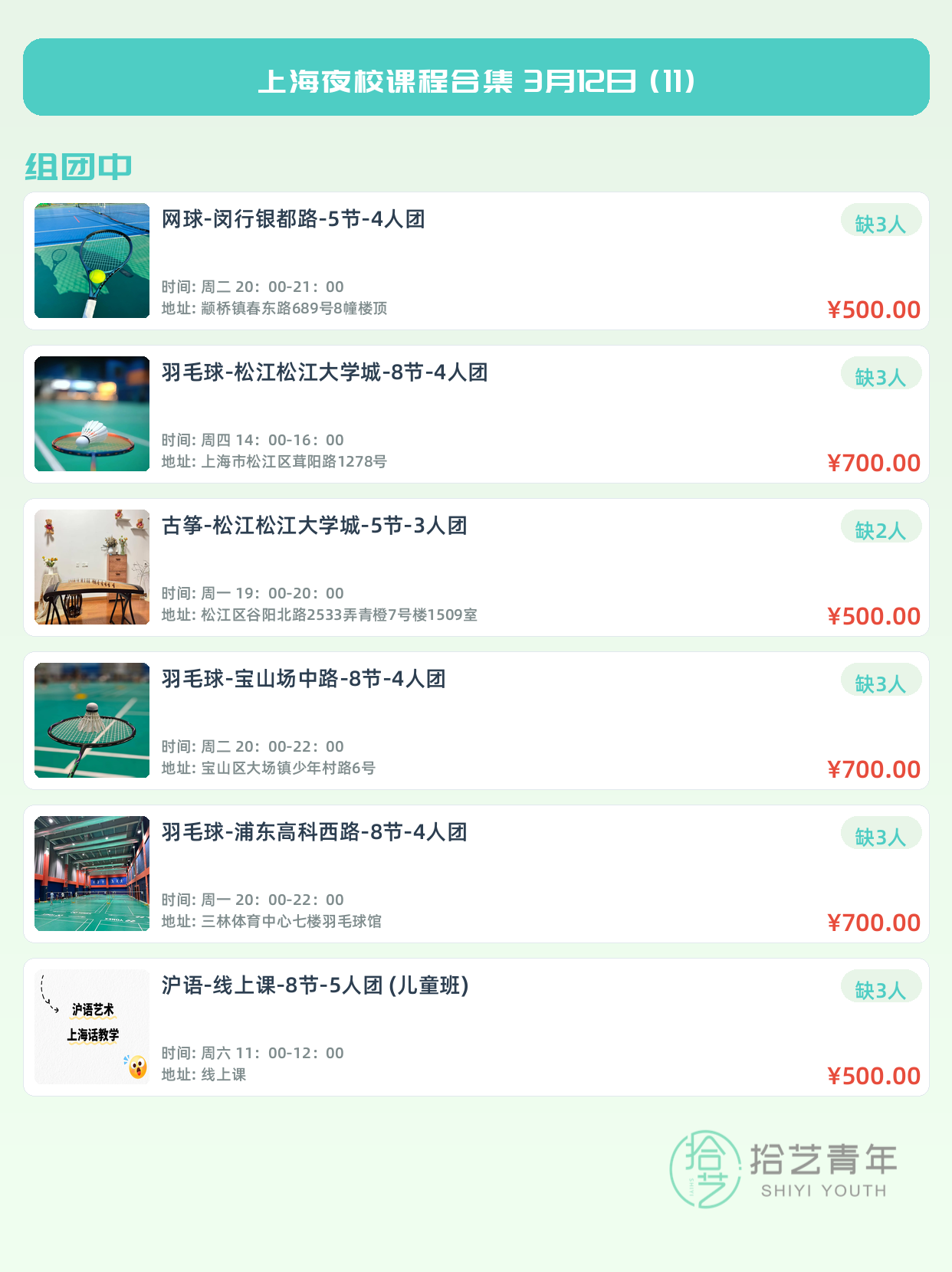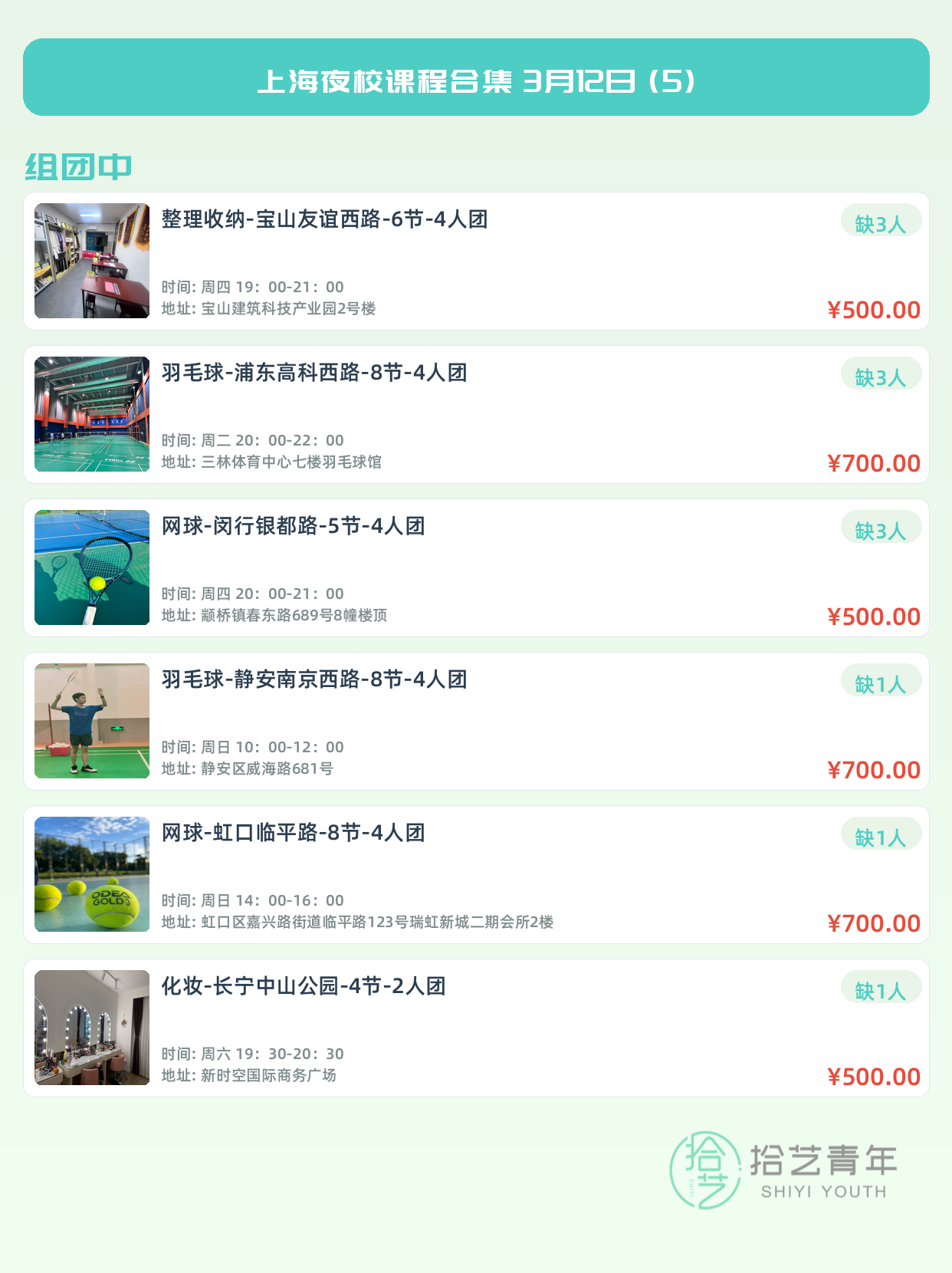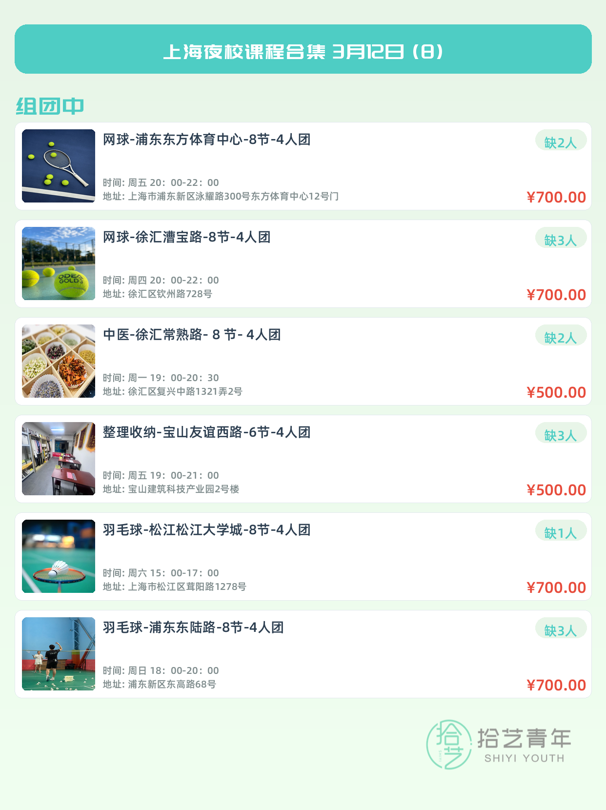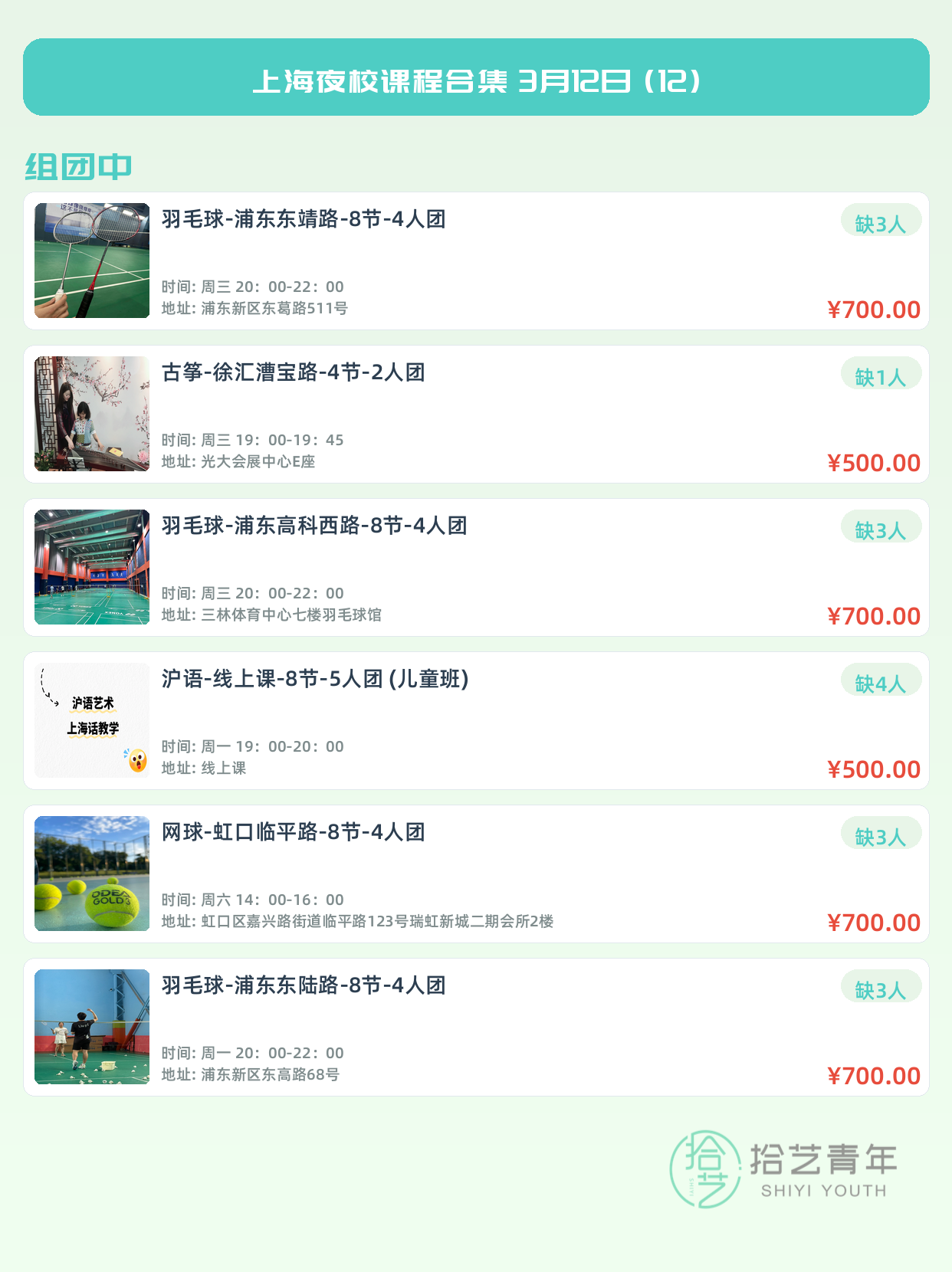 💡 提示:以上课程信息来自拾艺青年小程序,课程可能随报名动态变化,具体以小程序实时信息为准。