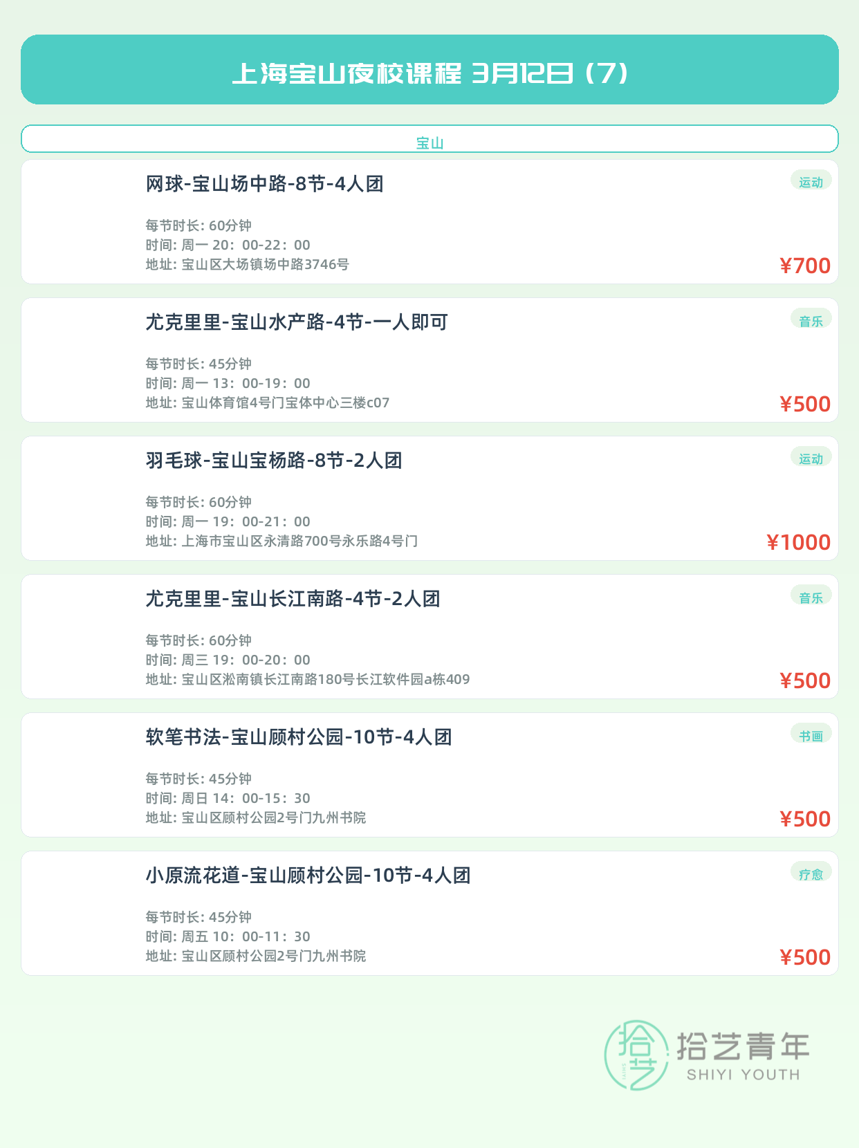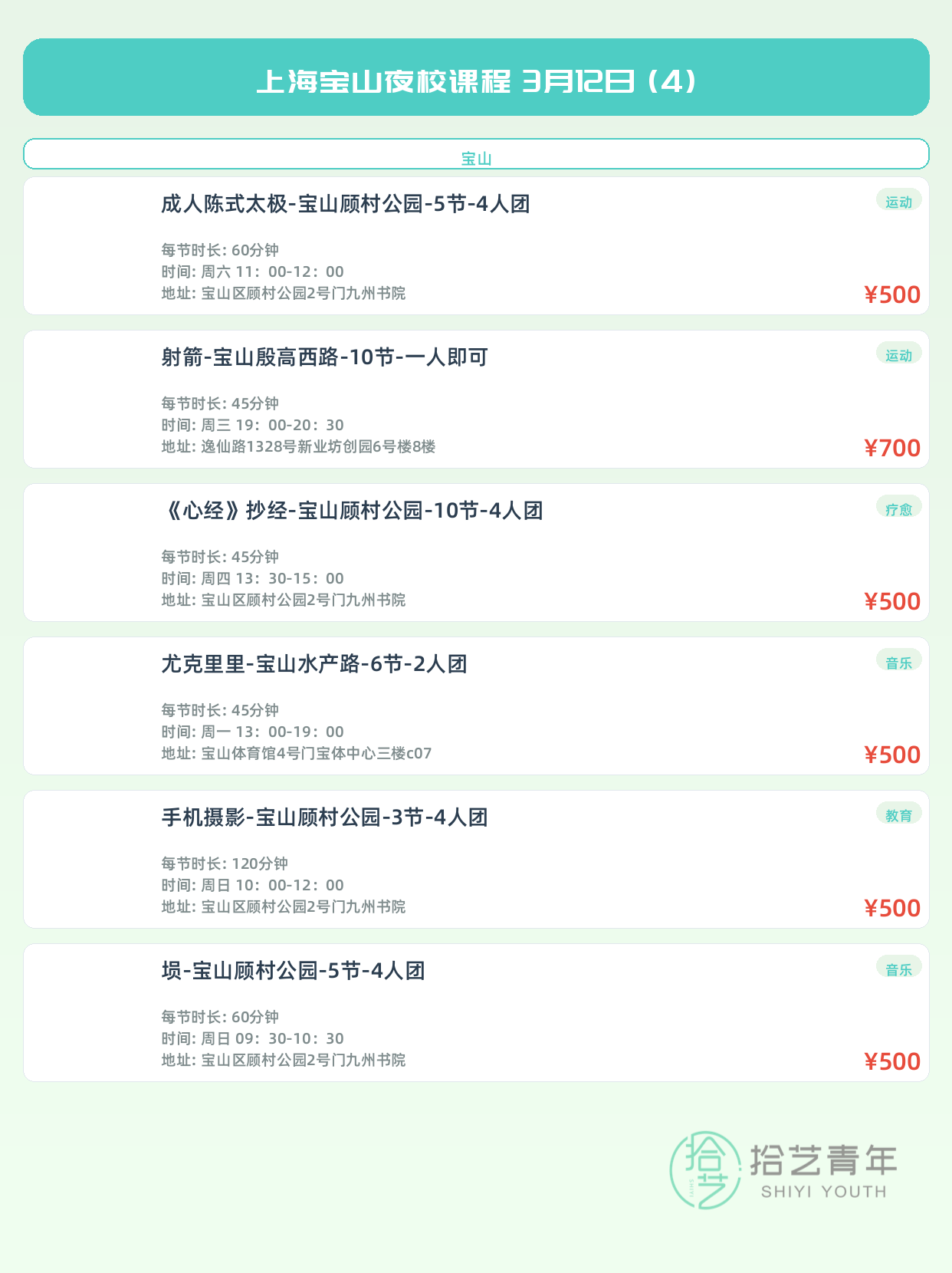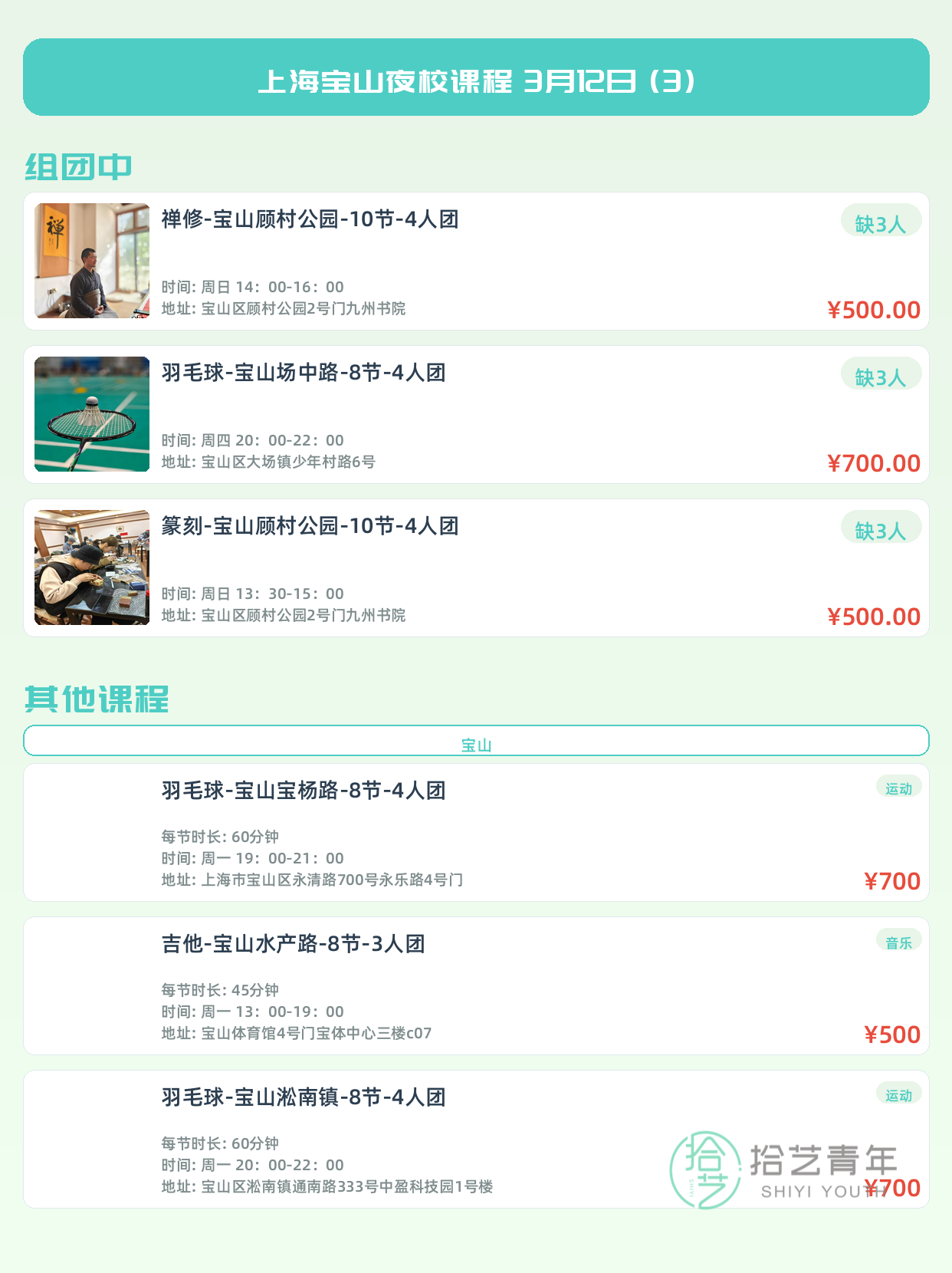 💡 提示:以上课程信息来自拾艺青年小程序,课程可能随报名动态变化,具体以小程序实时信息为准。