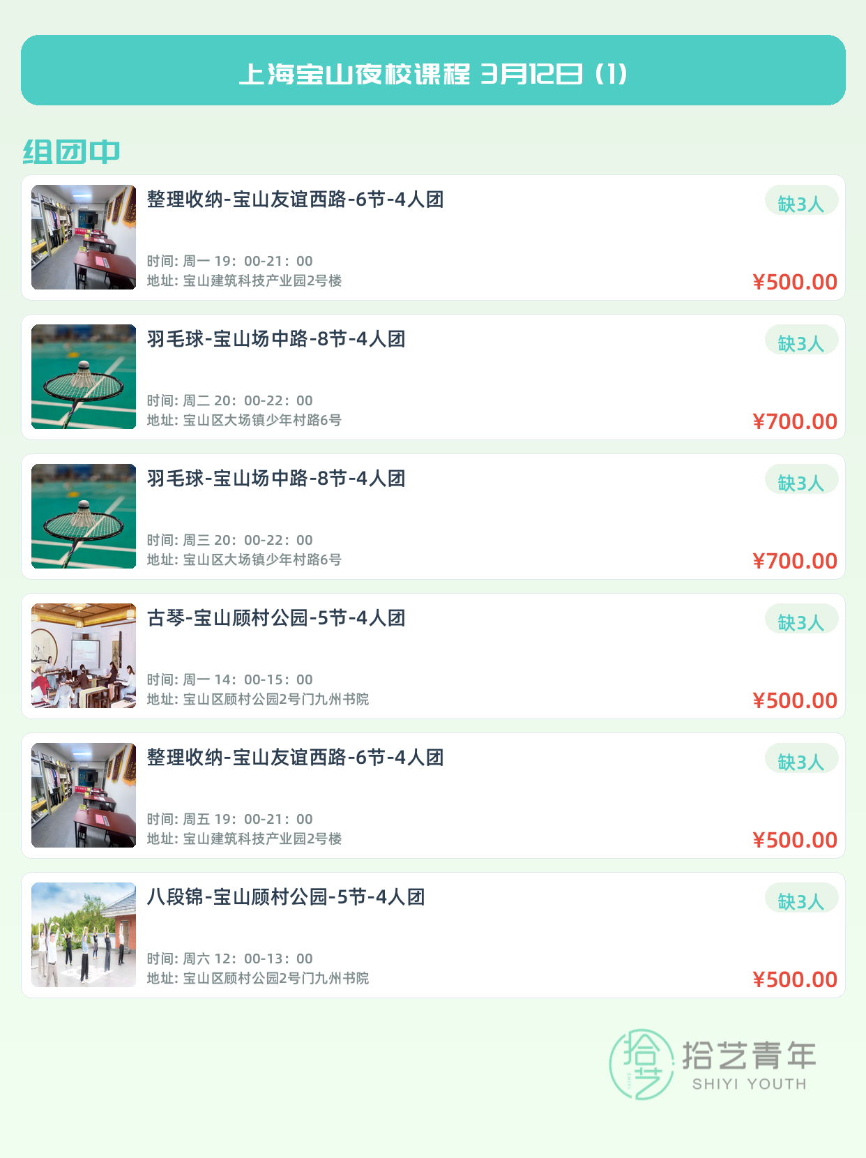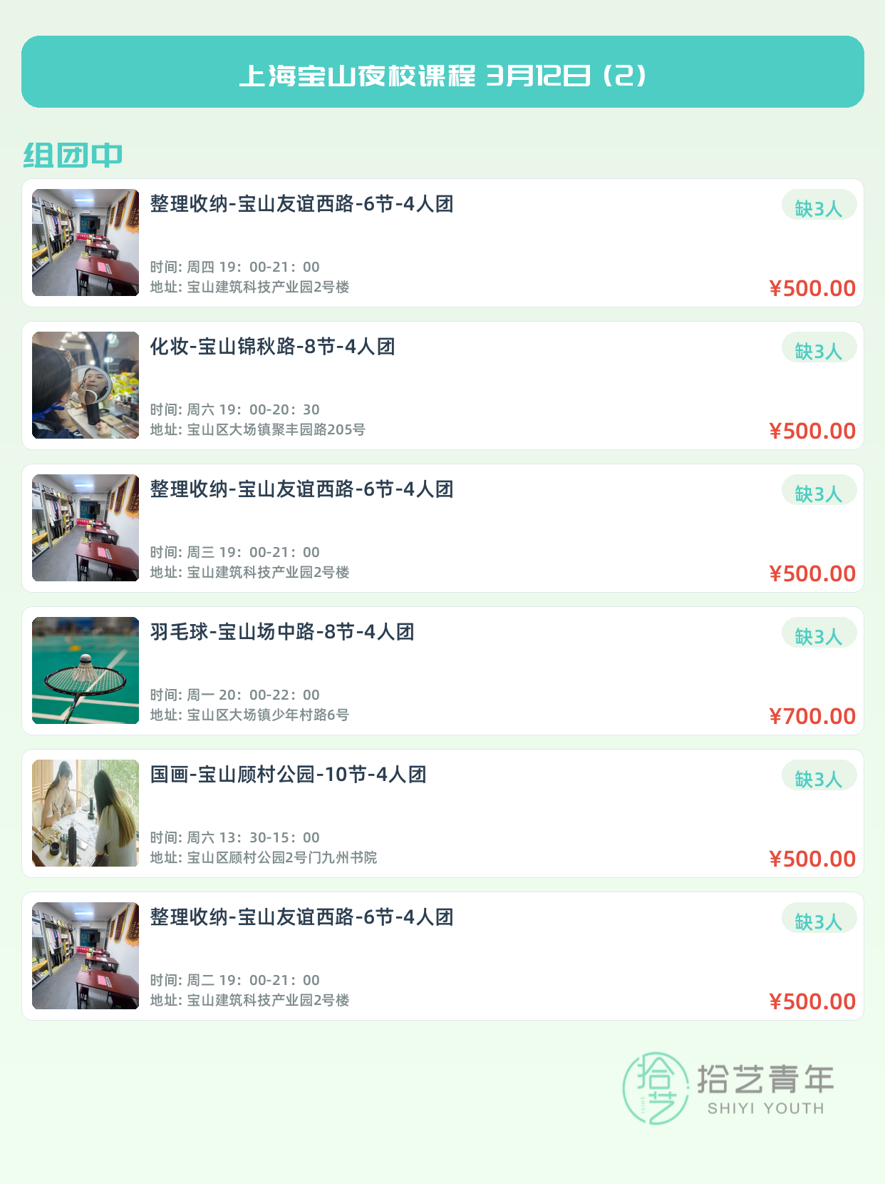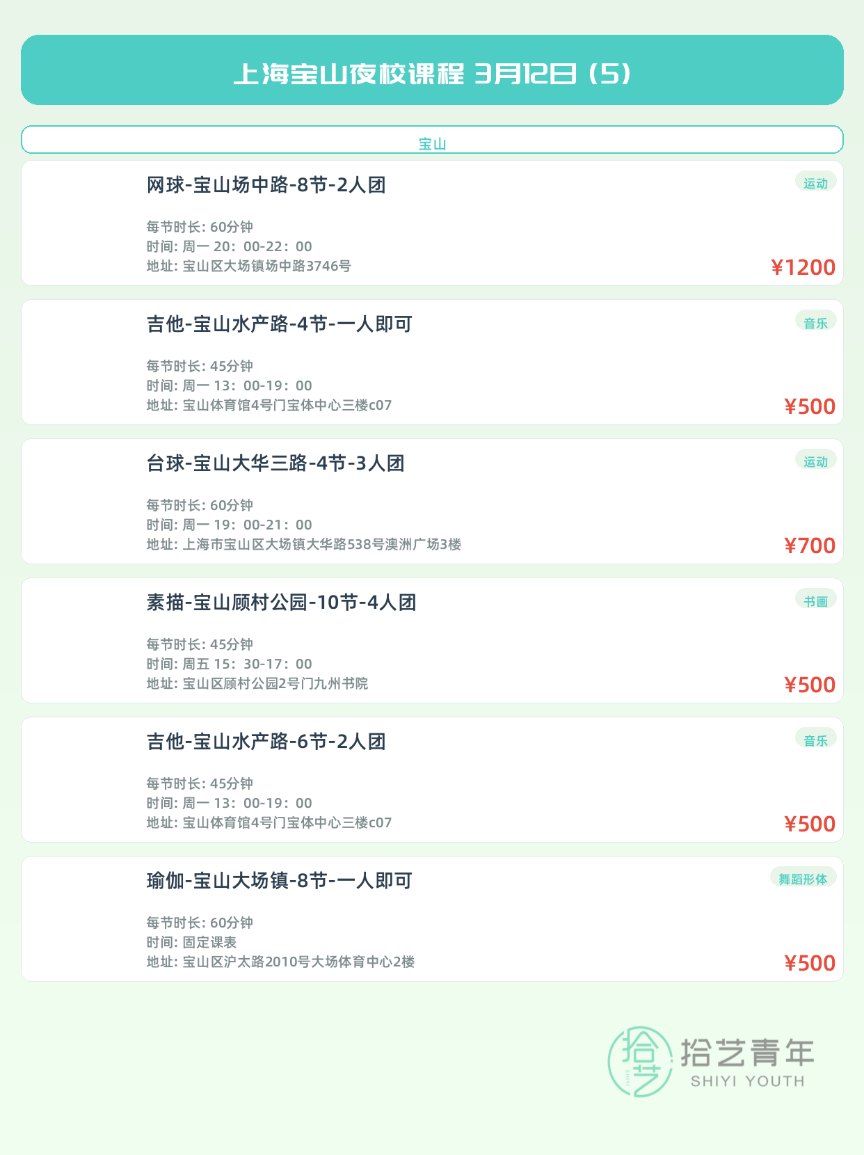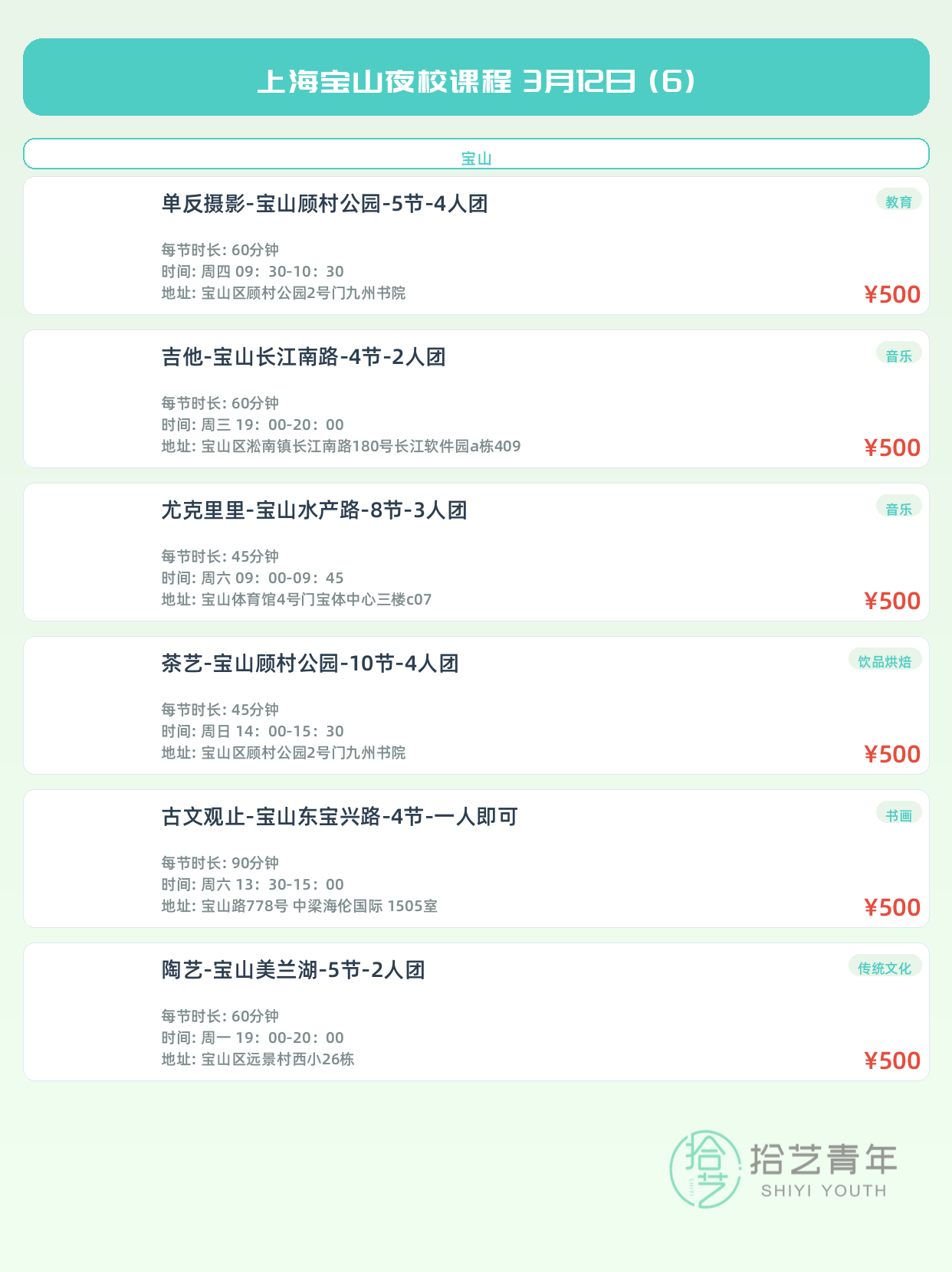 💡 提示:以上课程信息来自拾艺青年小程序,课程可能随报名动态变化,具体以小程序实时信息为准。