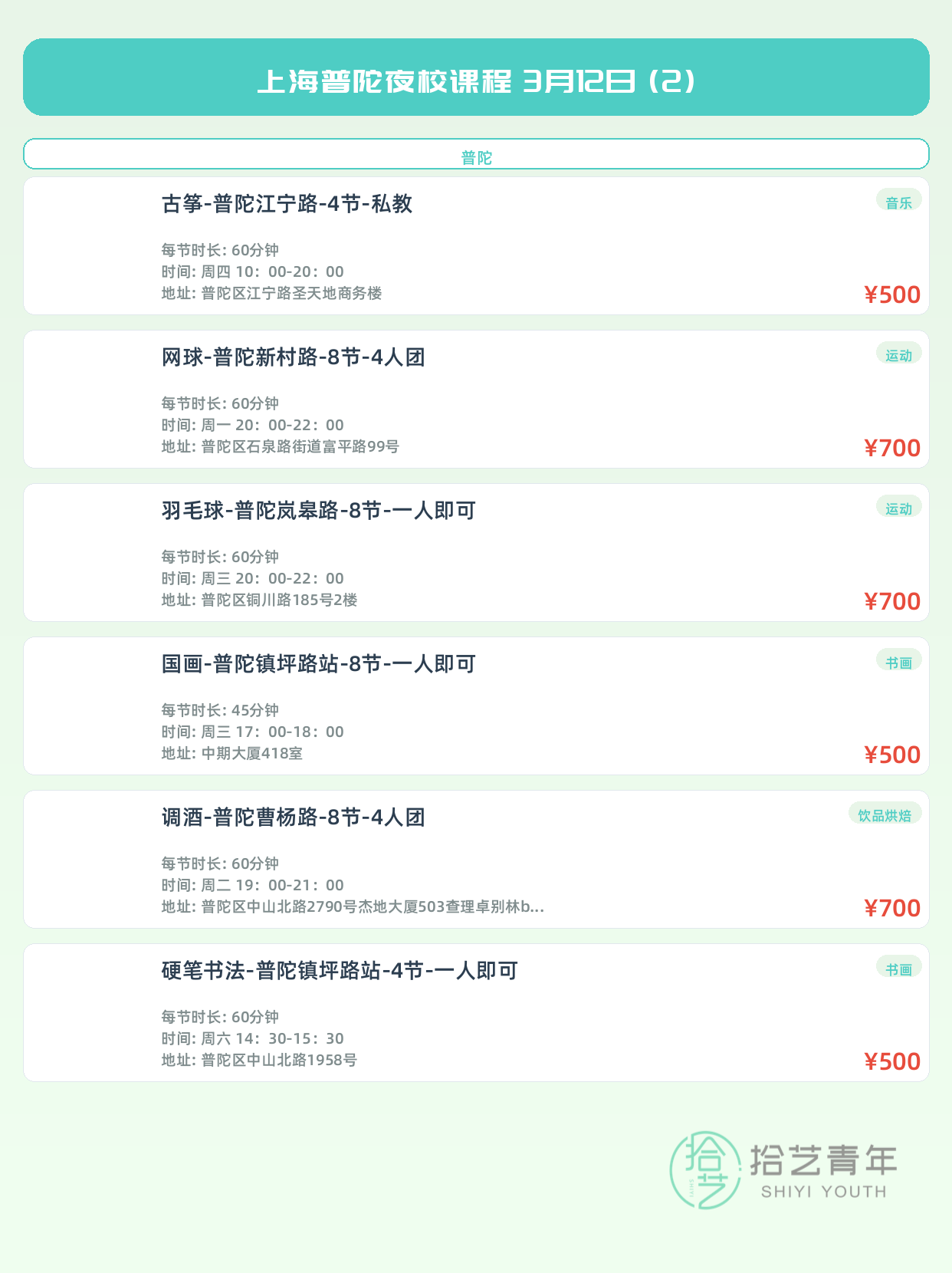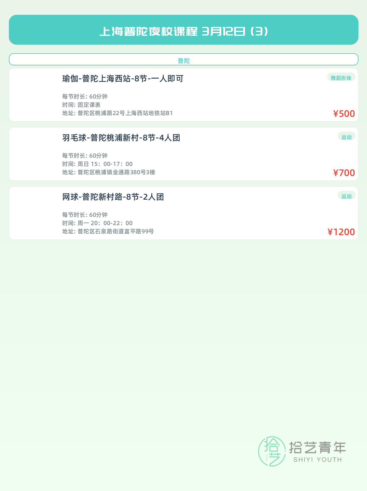 💡 提示:以上课程信息来自拾艺青年小程序,课程可能随报名动态变化,具体以小程序实时信息为准。
