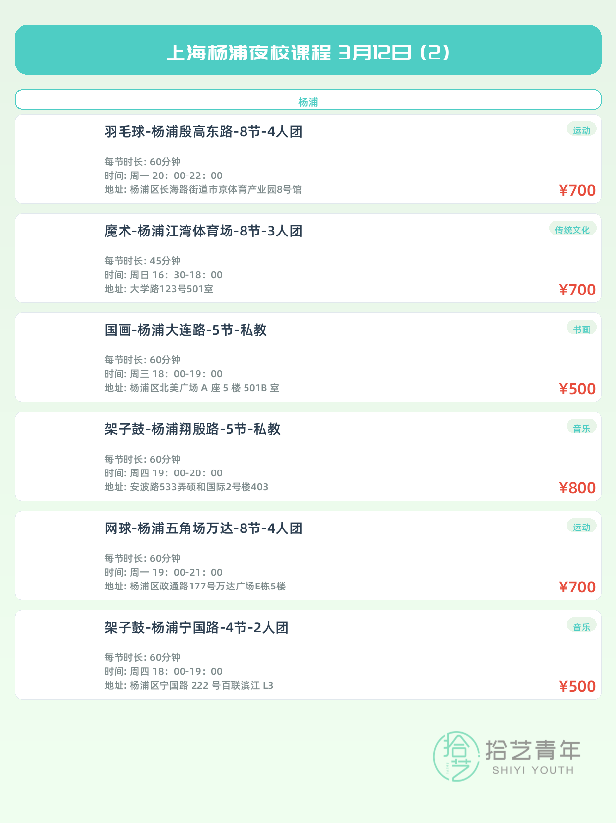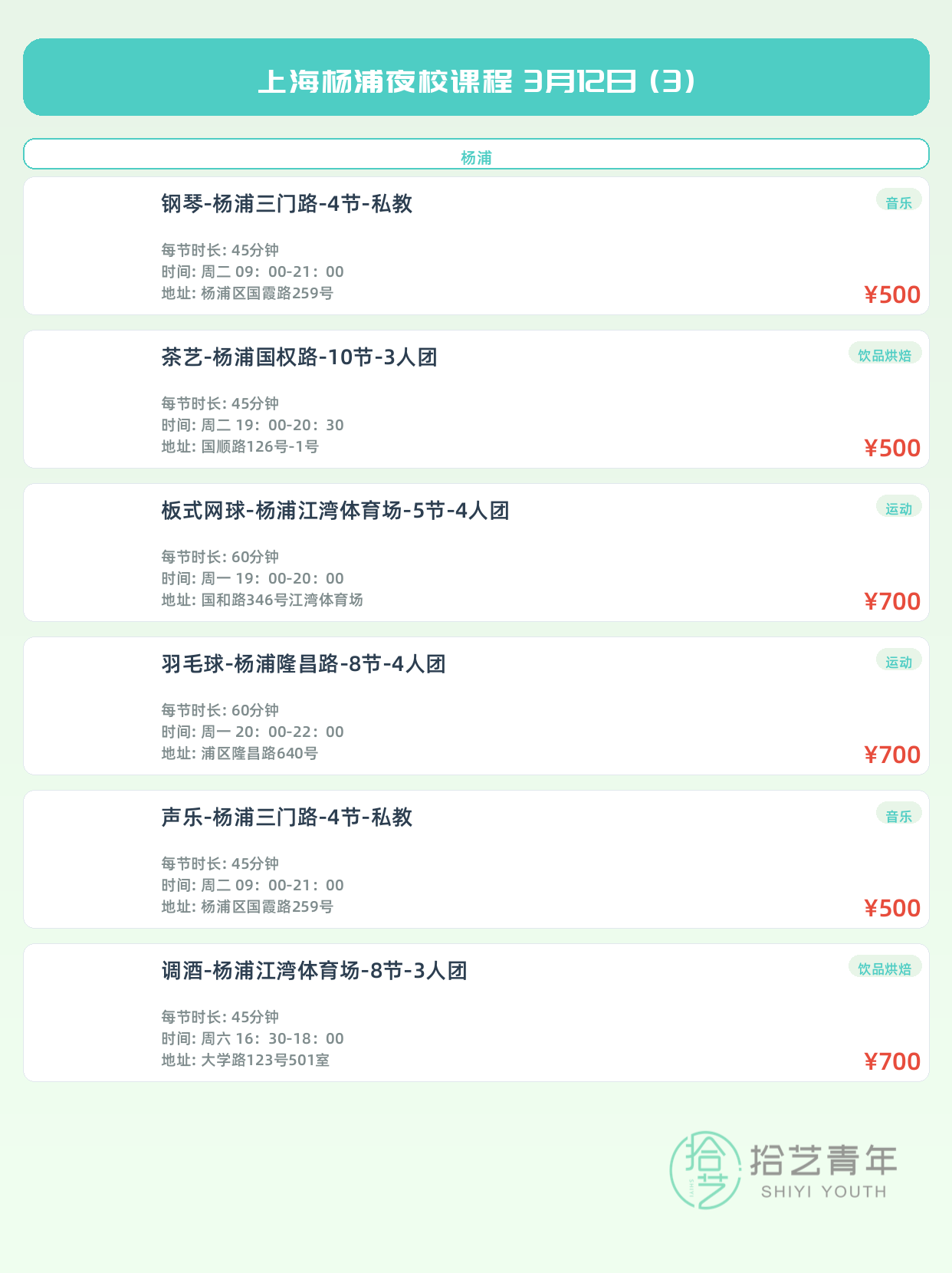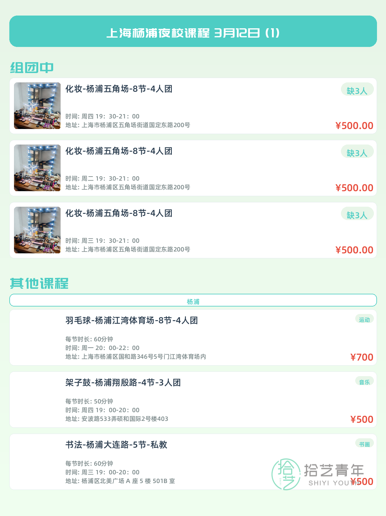 3月12日上海杨浦夜校课程合集 - 拾艺青年夜校