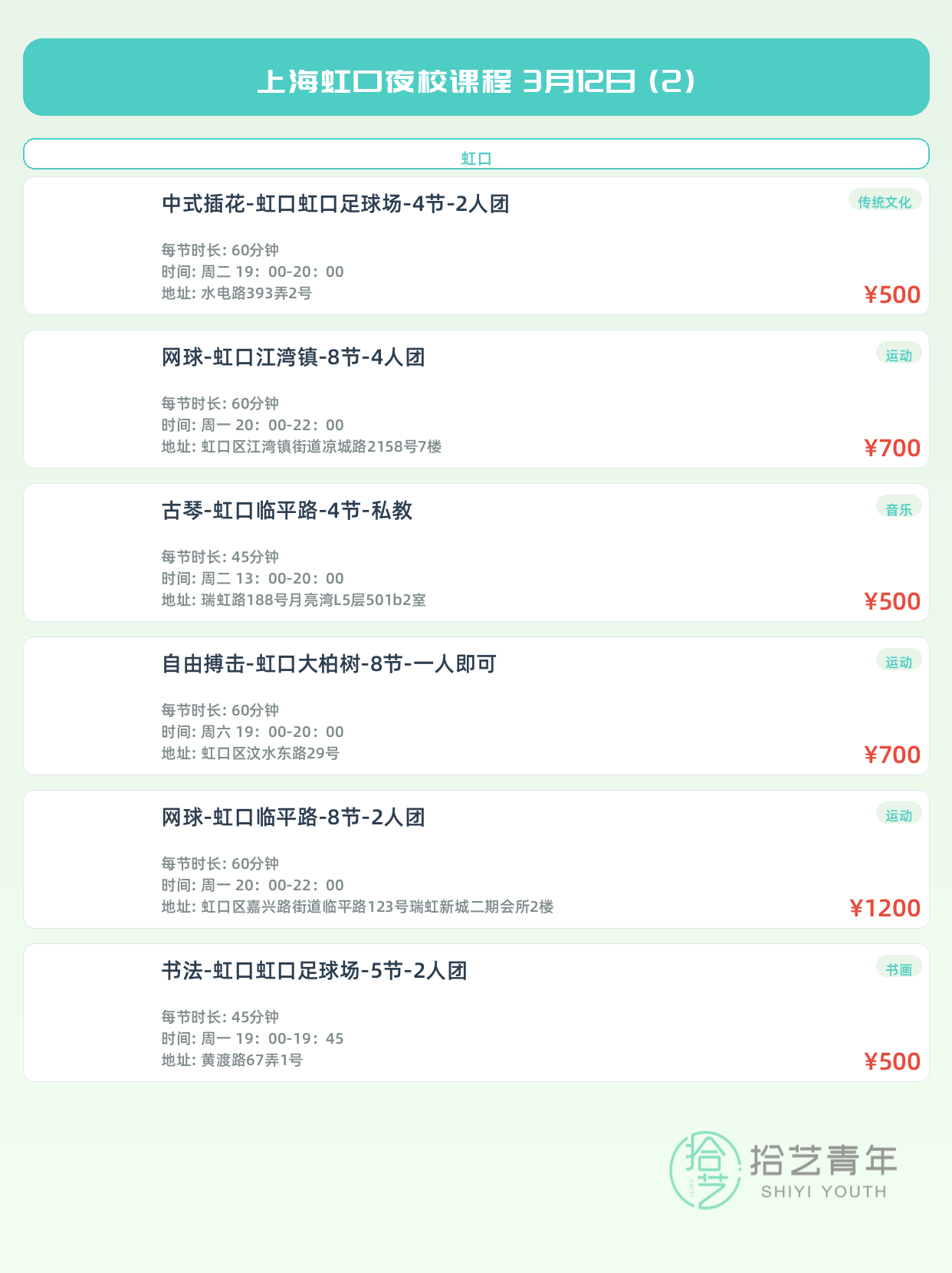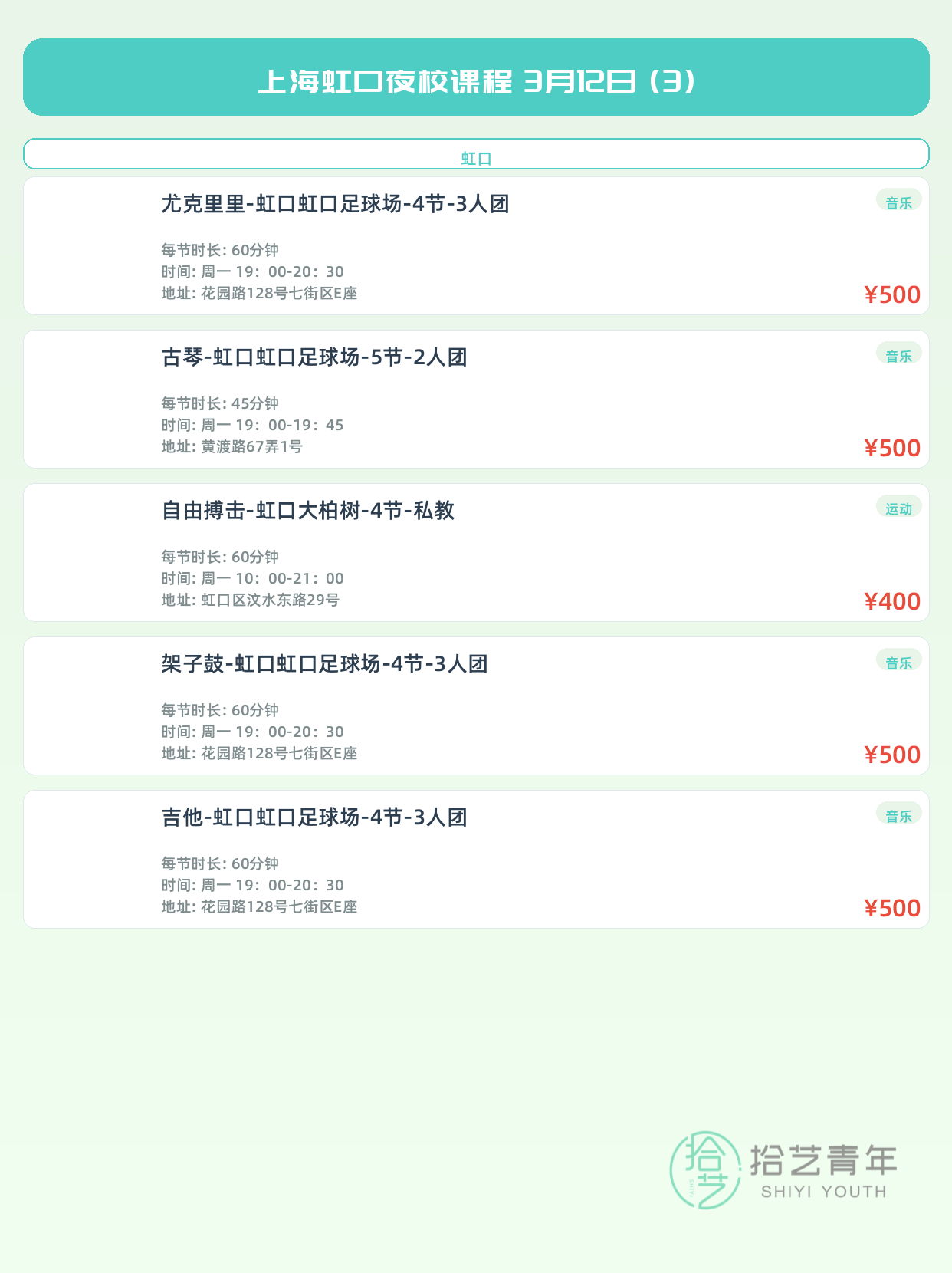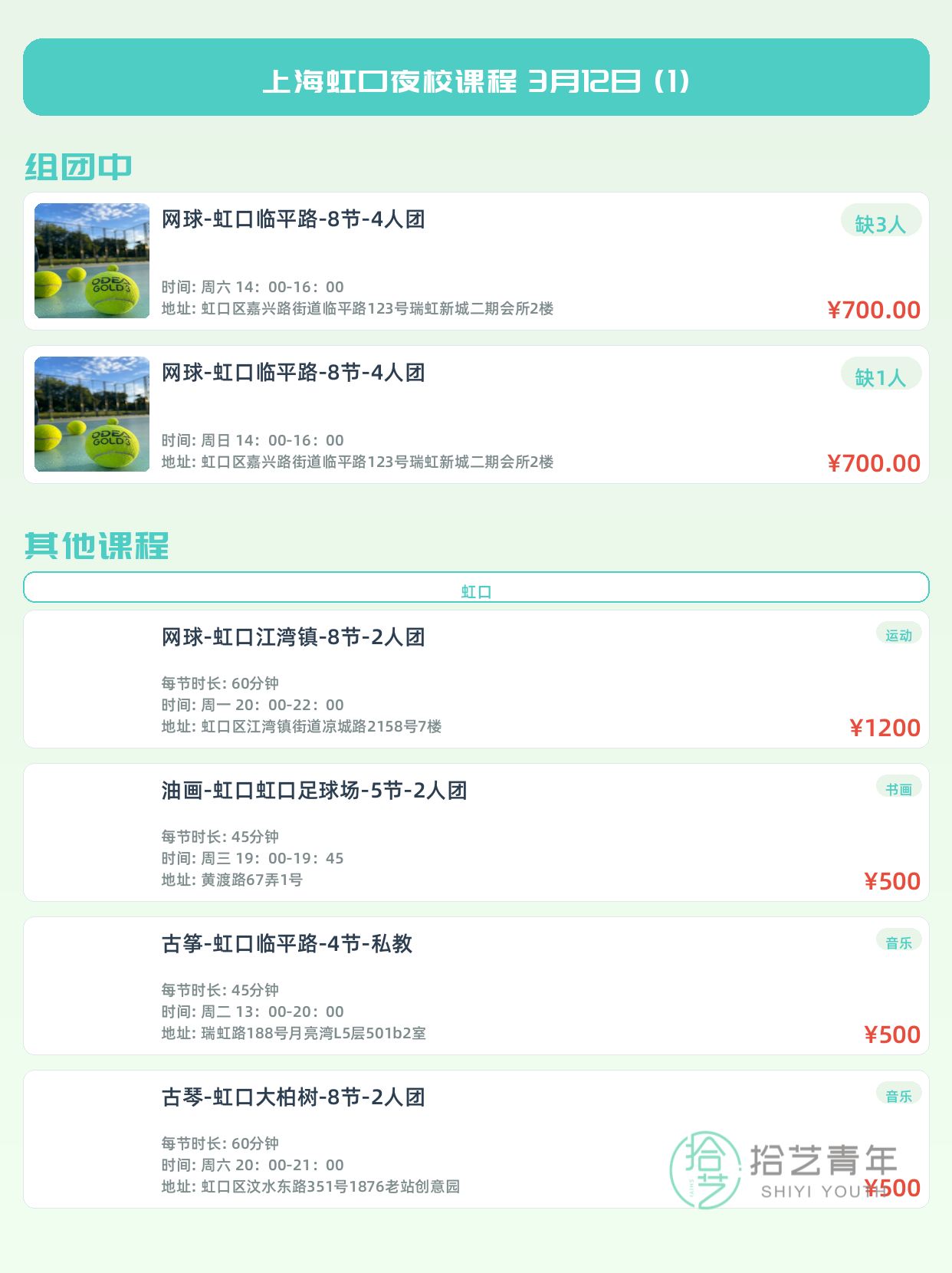 💡 提示:以上课程信息来自拾艺青年小程序,课程可能随报名动态变化,具体以小程序实时信息为准。