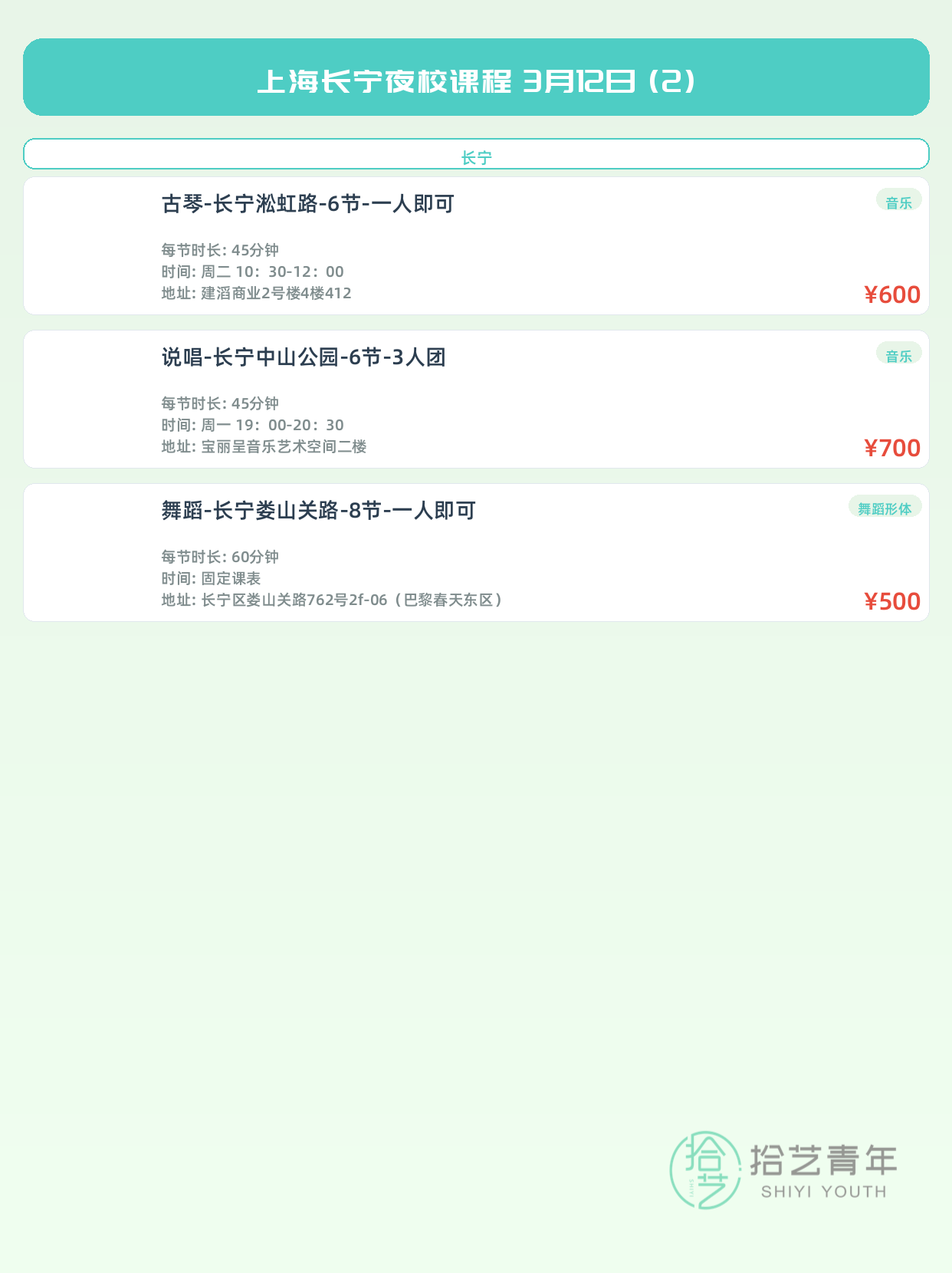 3月12日上海长宁夜校课程合集 - 拾艺青年夜校