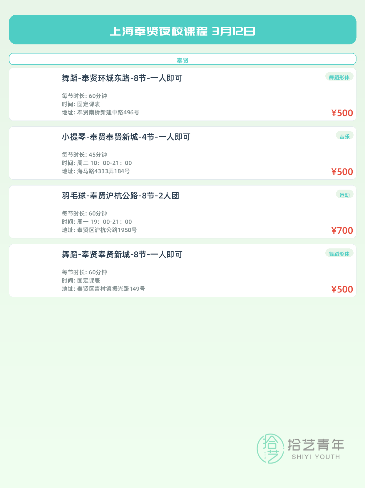 资讯>综合>正文3月12日上海奉贤夜校课程合集拾艺青年2026-03-121 / 2【其他课程】📌 舞蹈-奉贤奉贤新城-8节-一人即可📌 舞蹈-奉贤环城东路-8节-一人即可📌 小提琴-奉贤奉贤新城-4节-一人即可📌 羽毛球-奉贤沪杭公路-8节-2人团详见图片,欢迎奉贤的小伙伴报名。💡 提示:以上课程信息来自拾艺青年小程序,课程可能随报名动态变化,具体以小程序实时信息为准。👉 微信小程序链接:#小程序://拾艺青年/WmfwH22mnQUxZwb