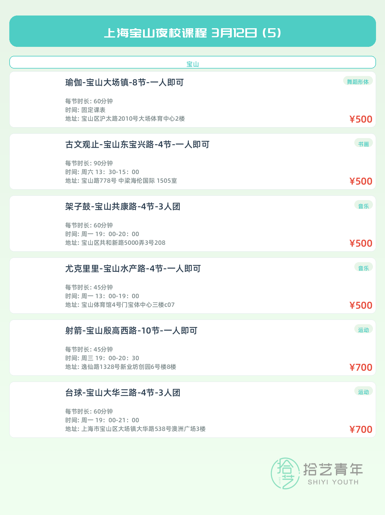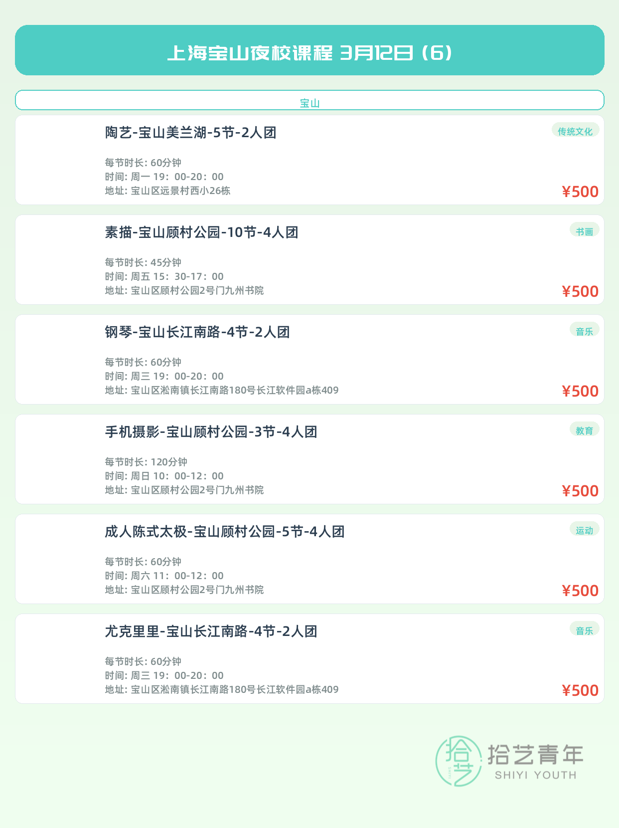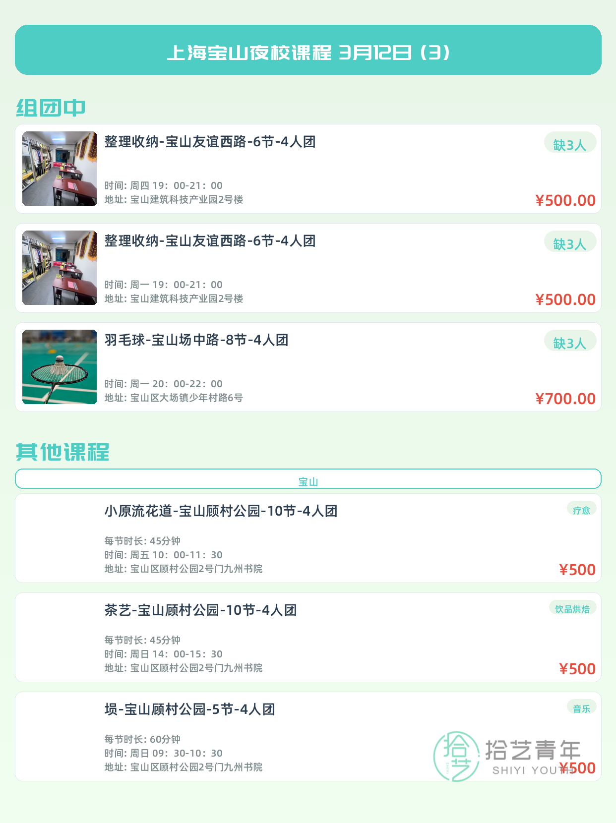 💡 提示:以上课程信息来自拾艺青年小程序,课程可能随报名动态变化,具体以小程序实时信息为准。