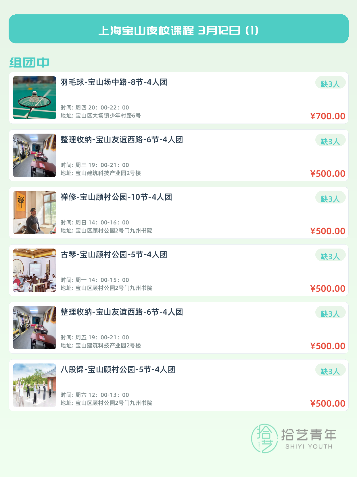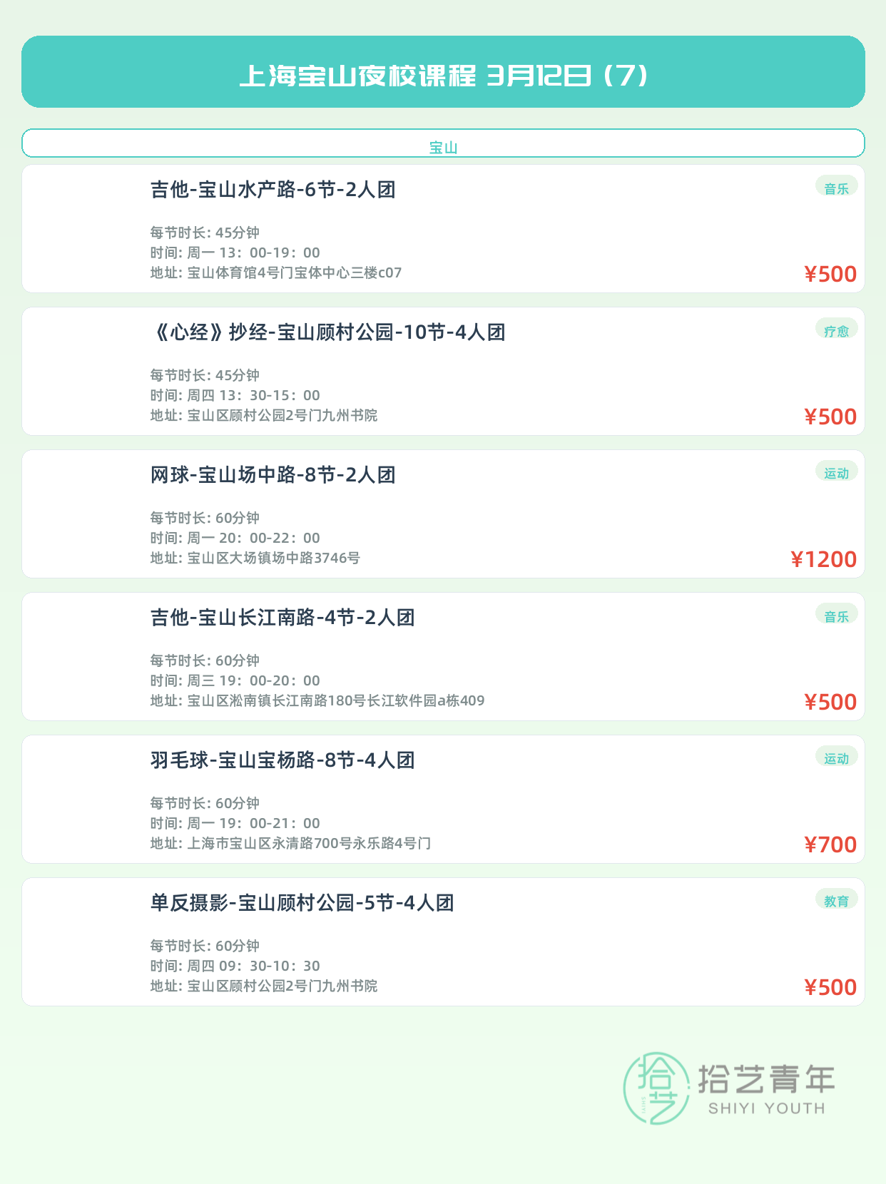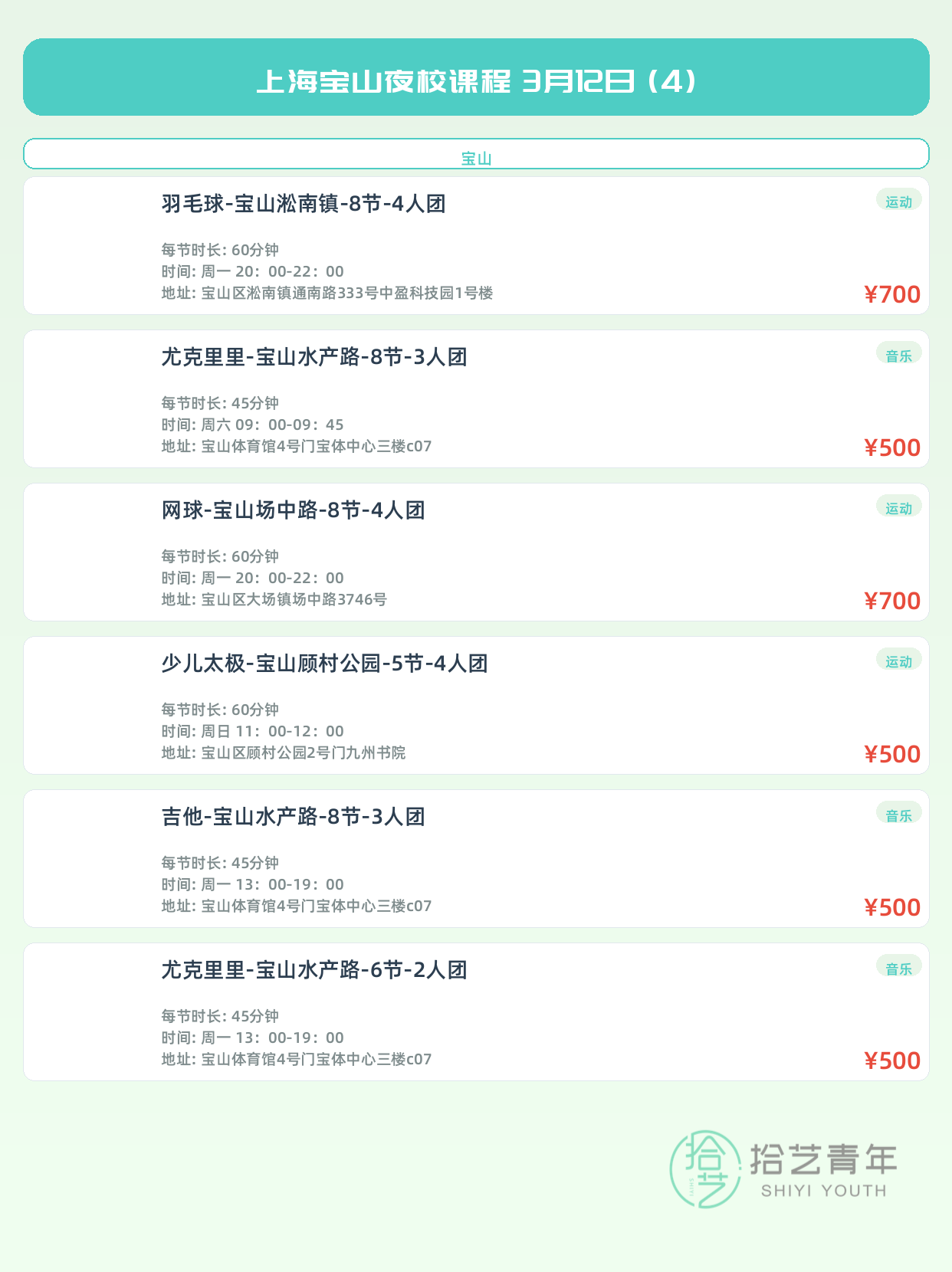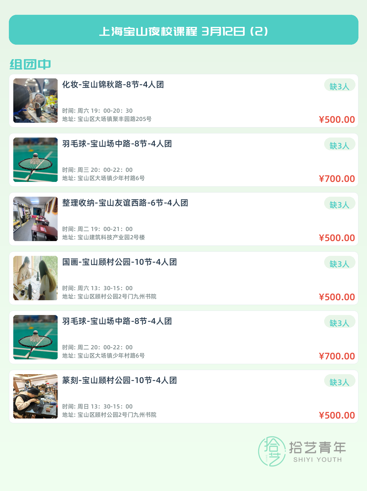 💡 提示:以上课程信息来自拾艺青年小程序,课程可能随报名动态变化,具体以小程序实时信息为准。