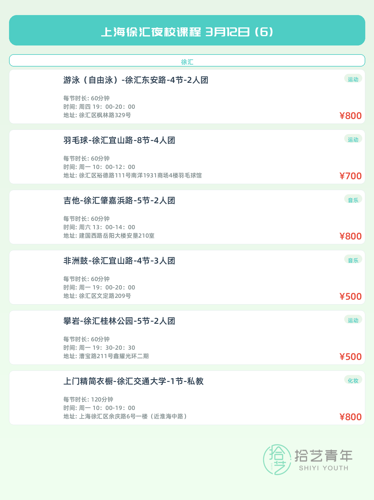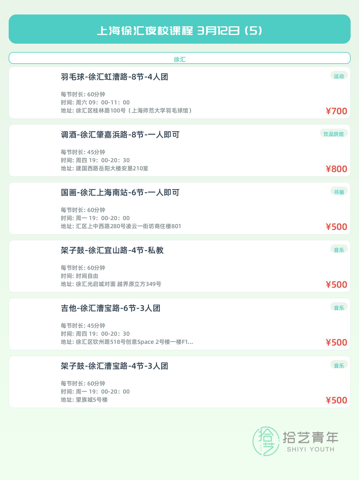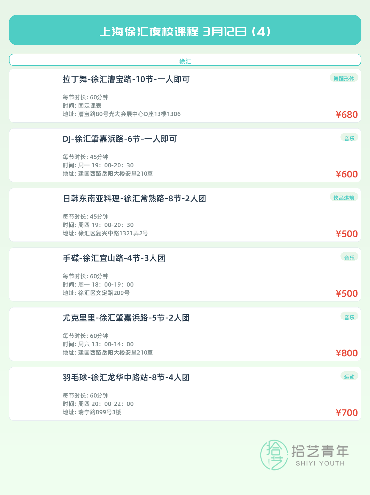 💡 提示:以上课程信息来自拾艺青年小程序,课程可能随报名动态变化,具体以小程序实时信息为准。