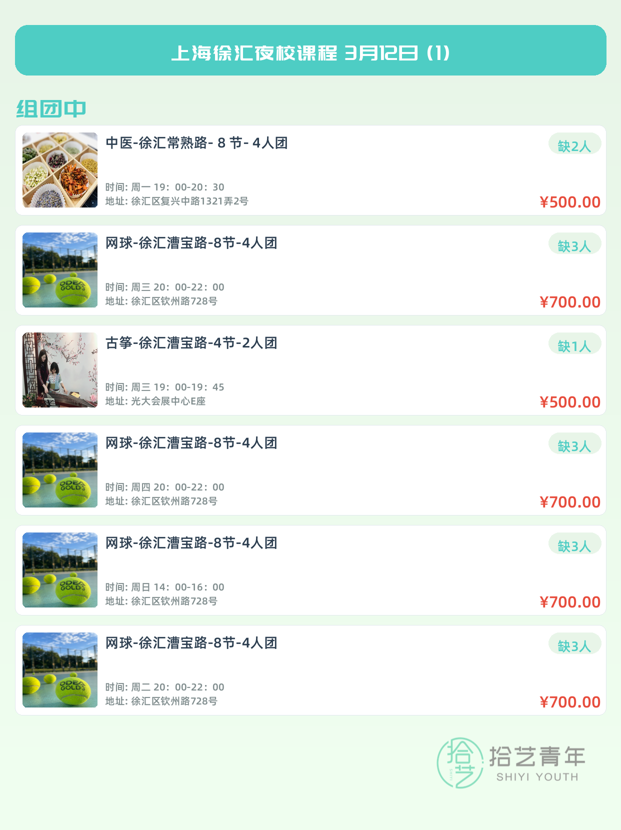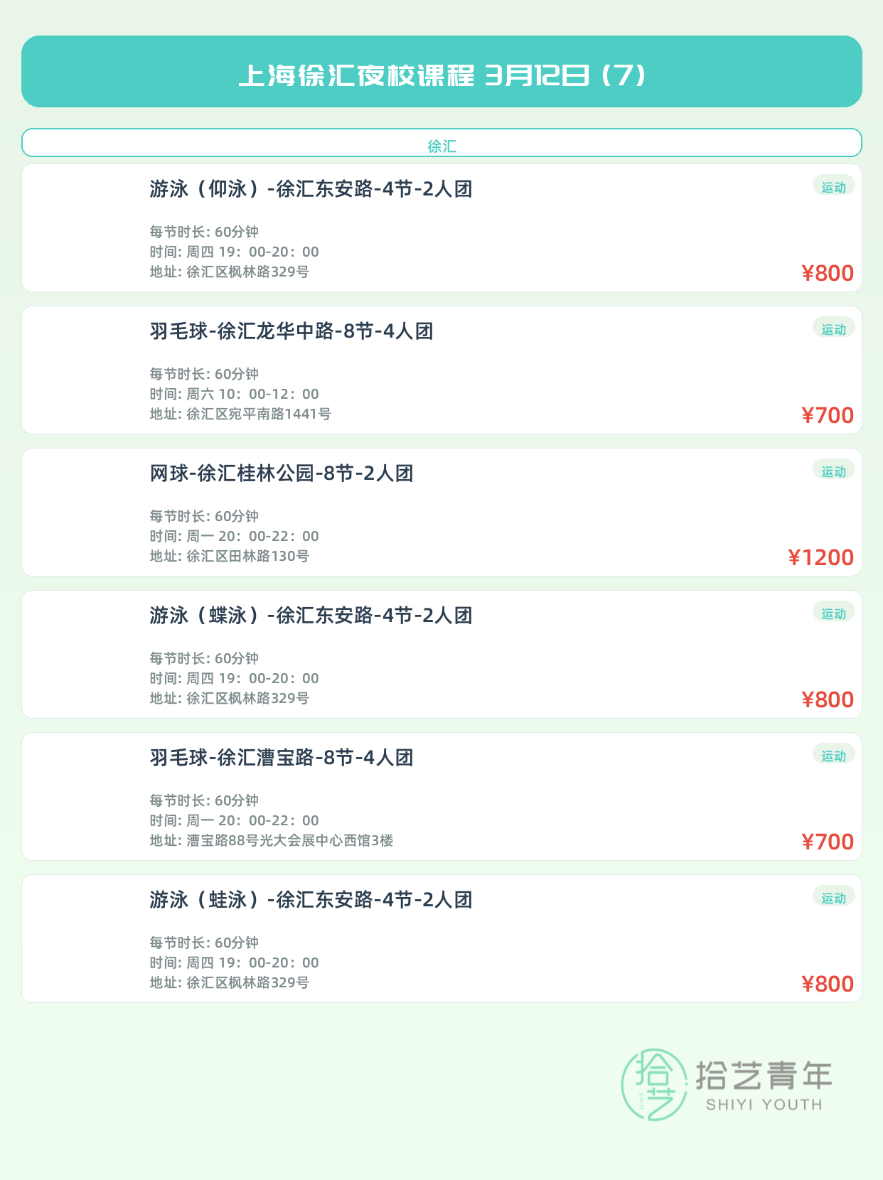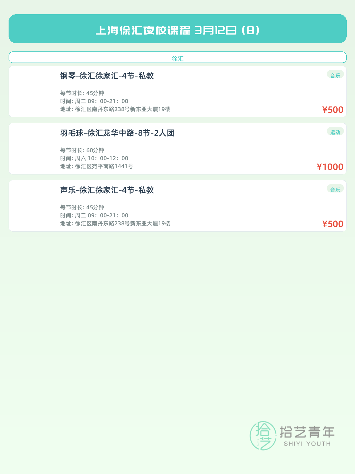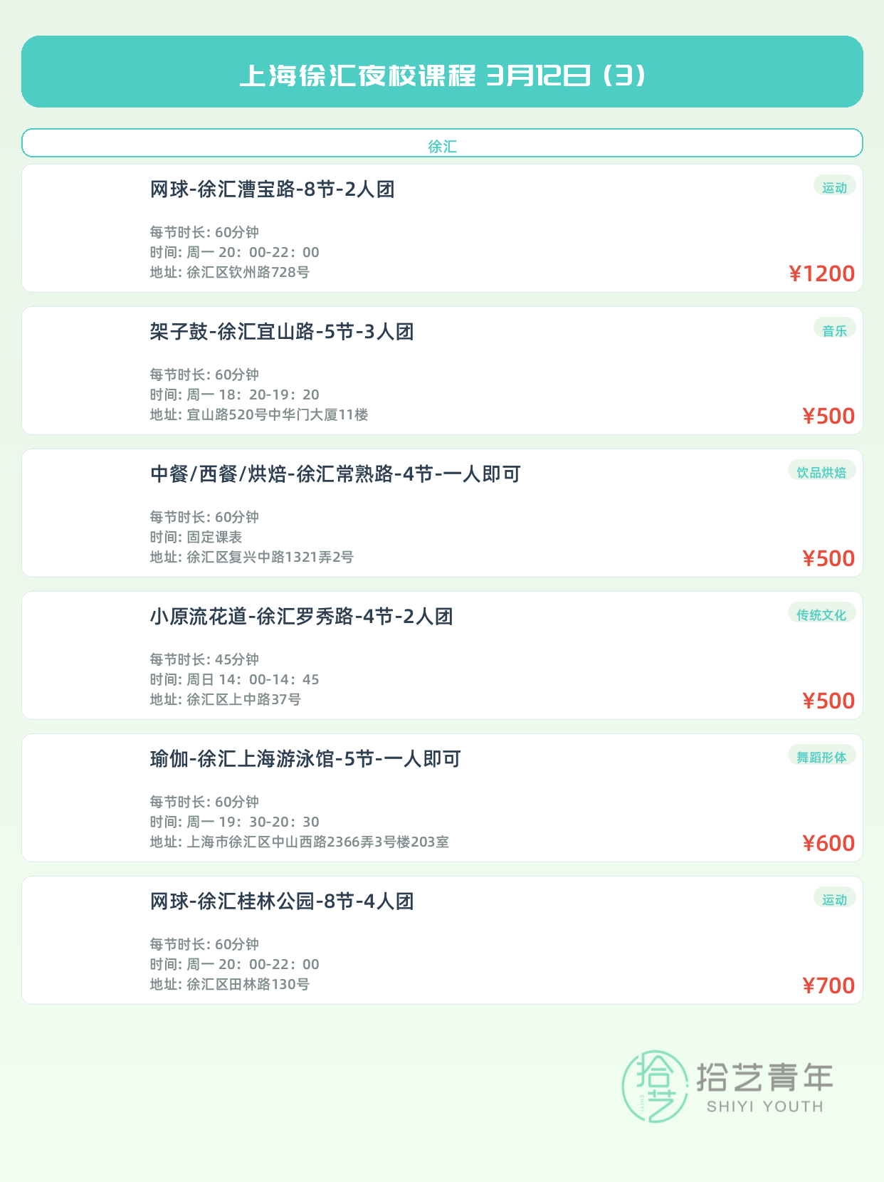 💡 提示:以上课程信息来自拾艺青年小程序,课程可能随报名动态变化,具体以小程序实时信息为准。