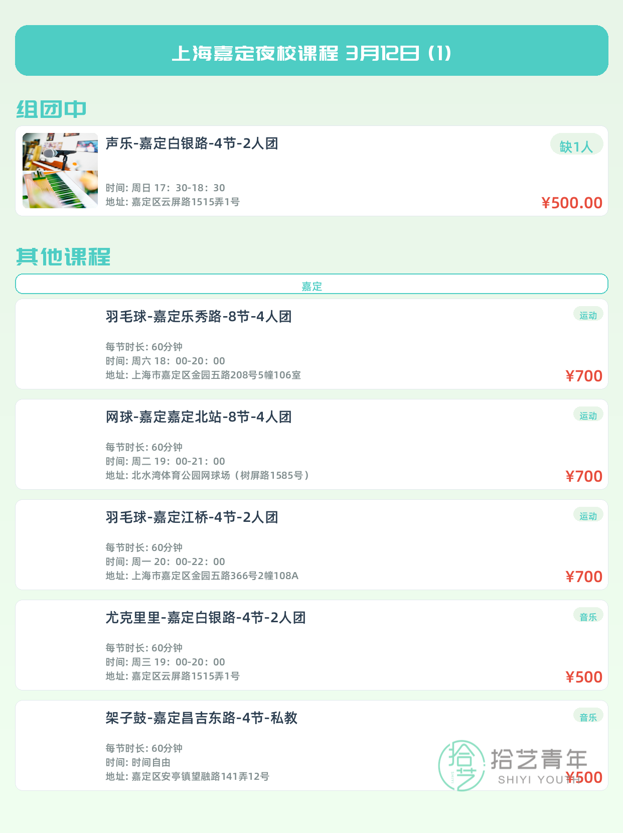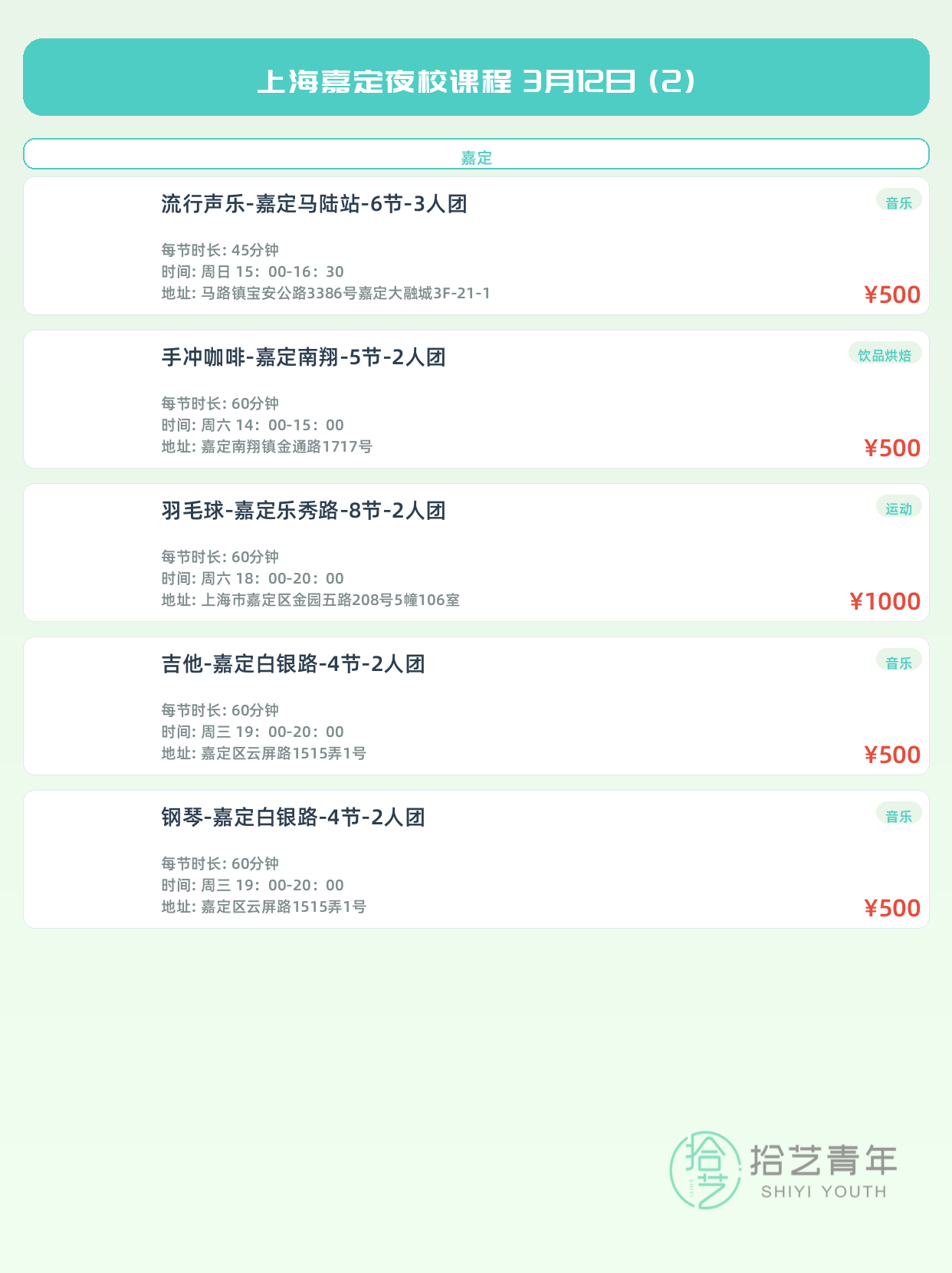 💡 提示:以上课程信息来自拾艺青年小程序,课程可能随报名动态变化,具体以小程序实时信息为准。