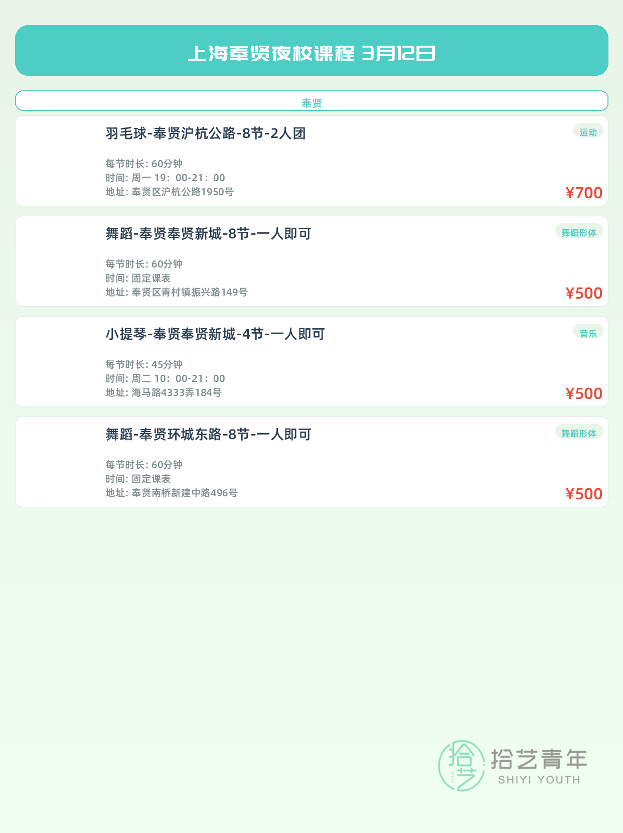 💡 提示:以上课程信息来自拾艺青年小程序,课程可能随报名动态变化,具体以小程序实时信息为准。