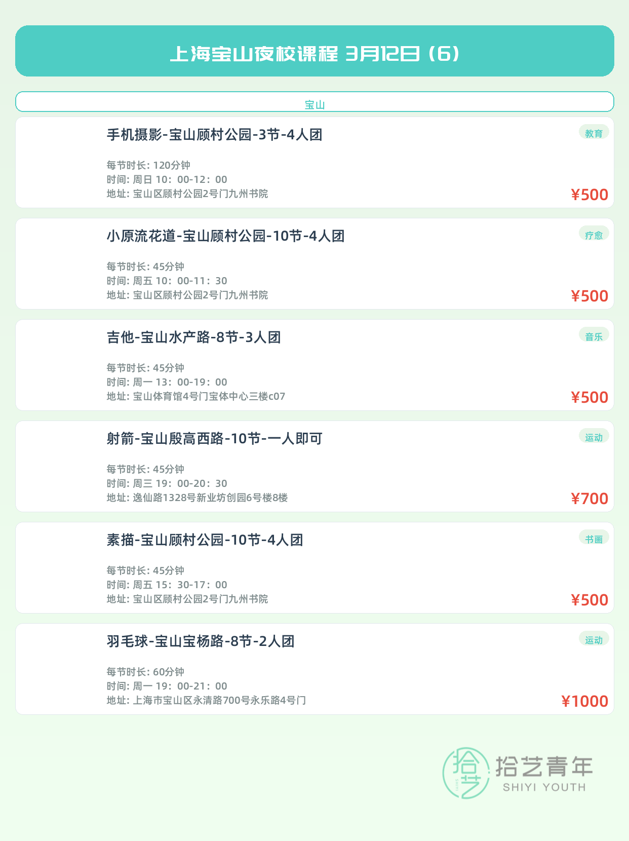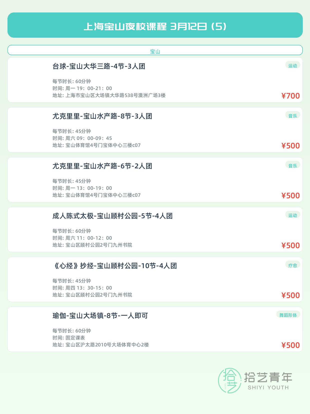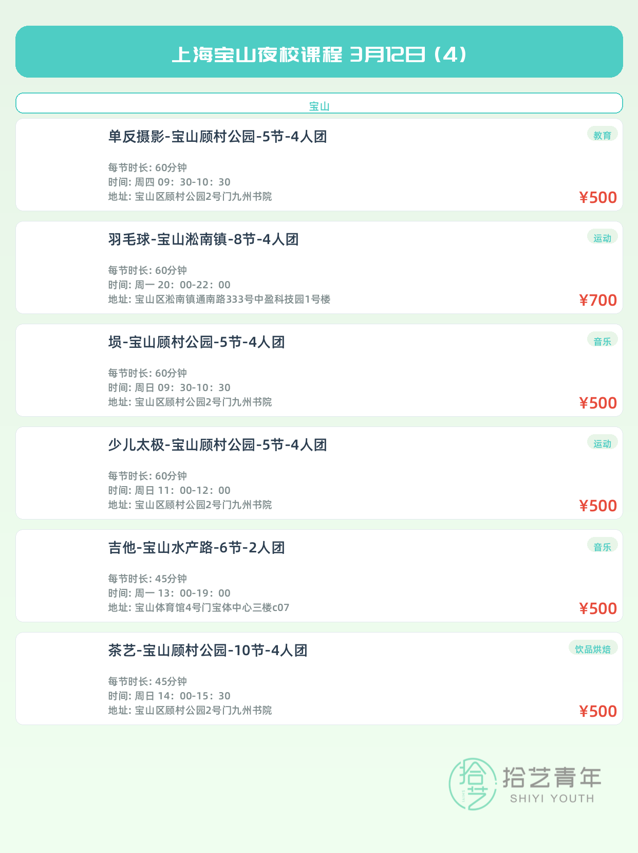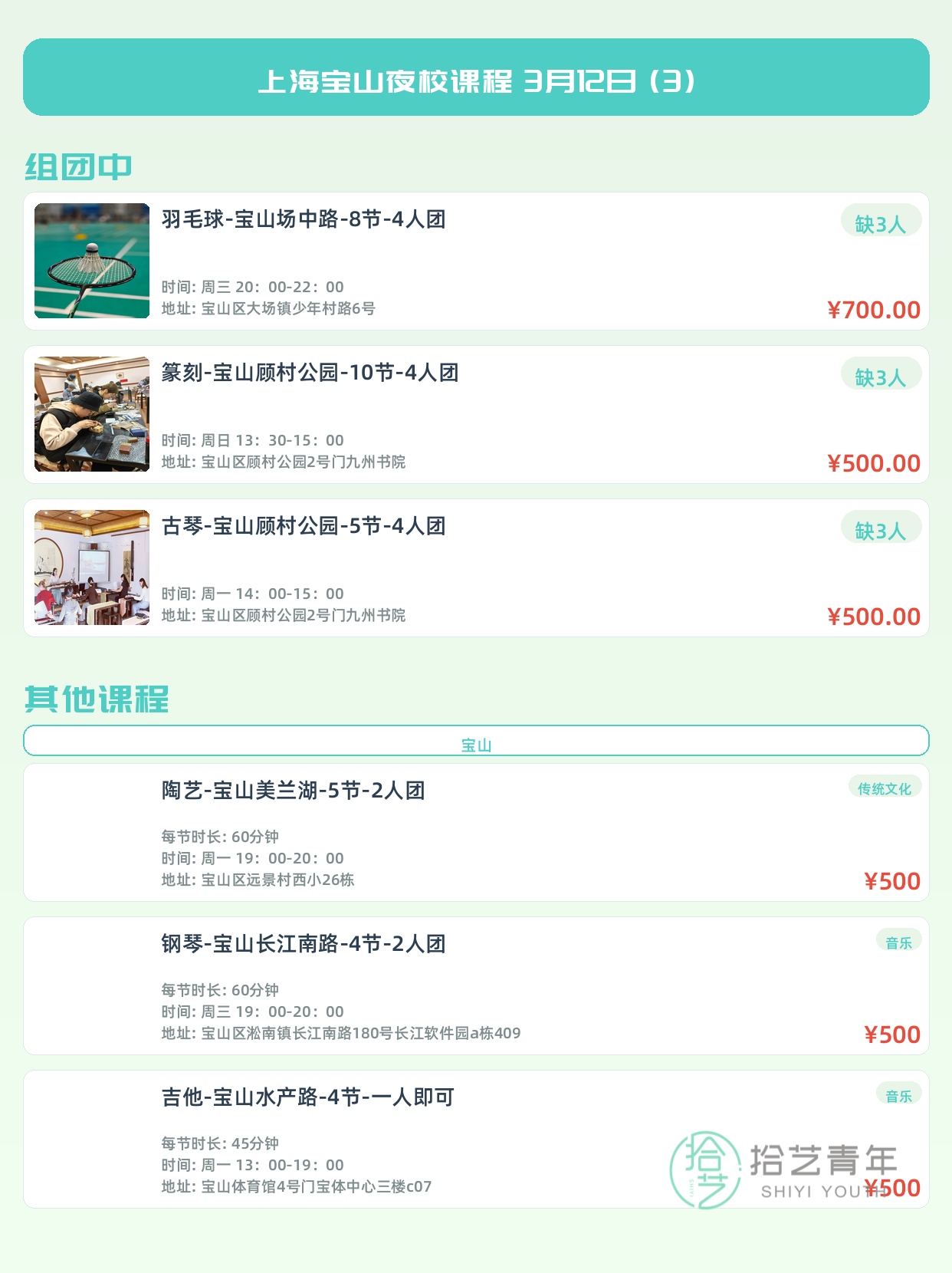 💡 提示:以上课程信息来自拾艺青年小程序,课程可能随报名动态变化,具体以小程序实时信息为准。