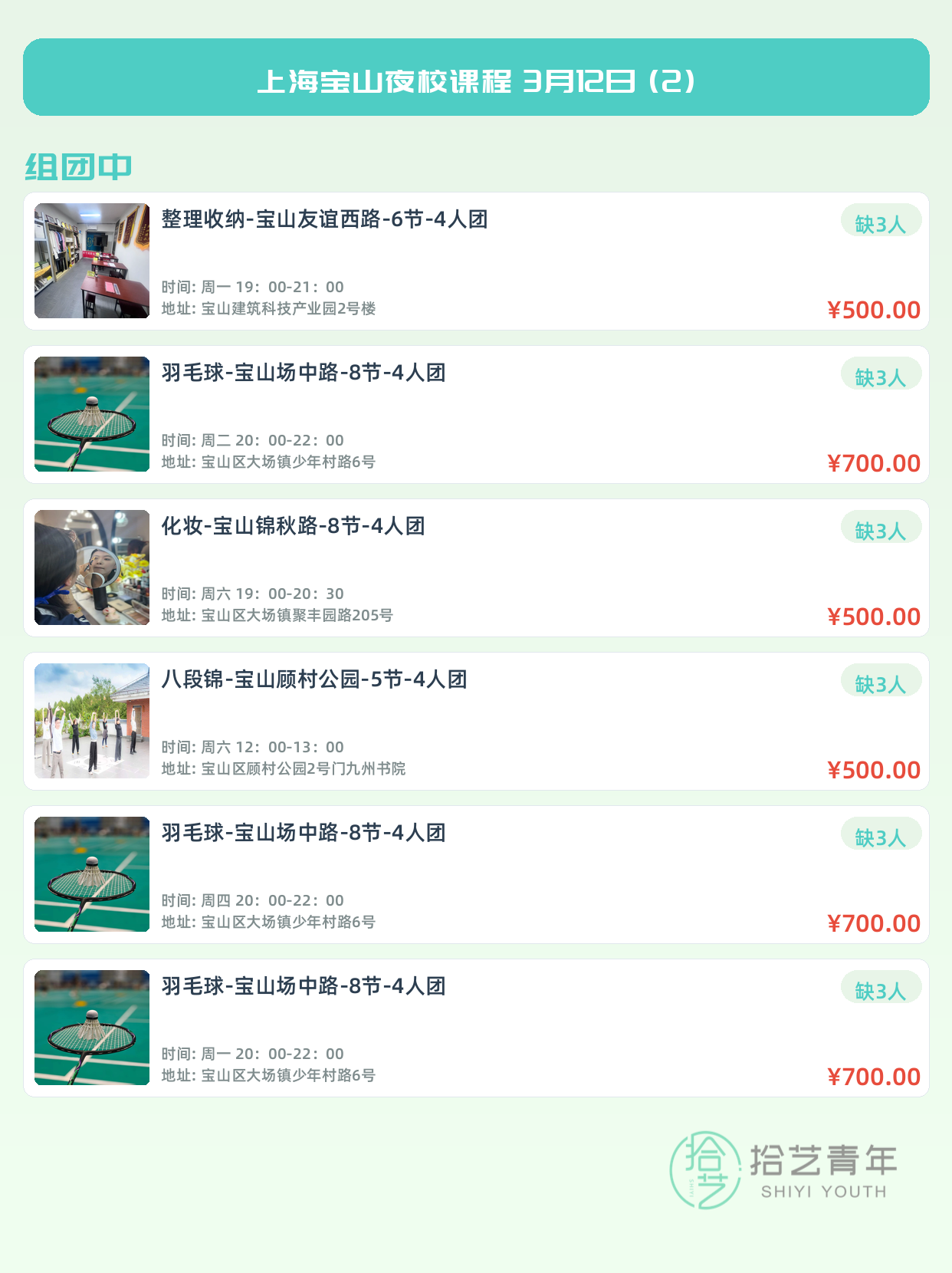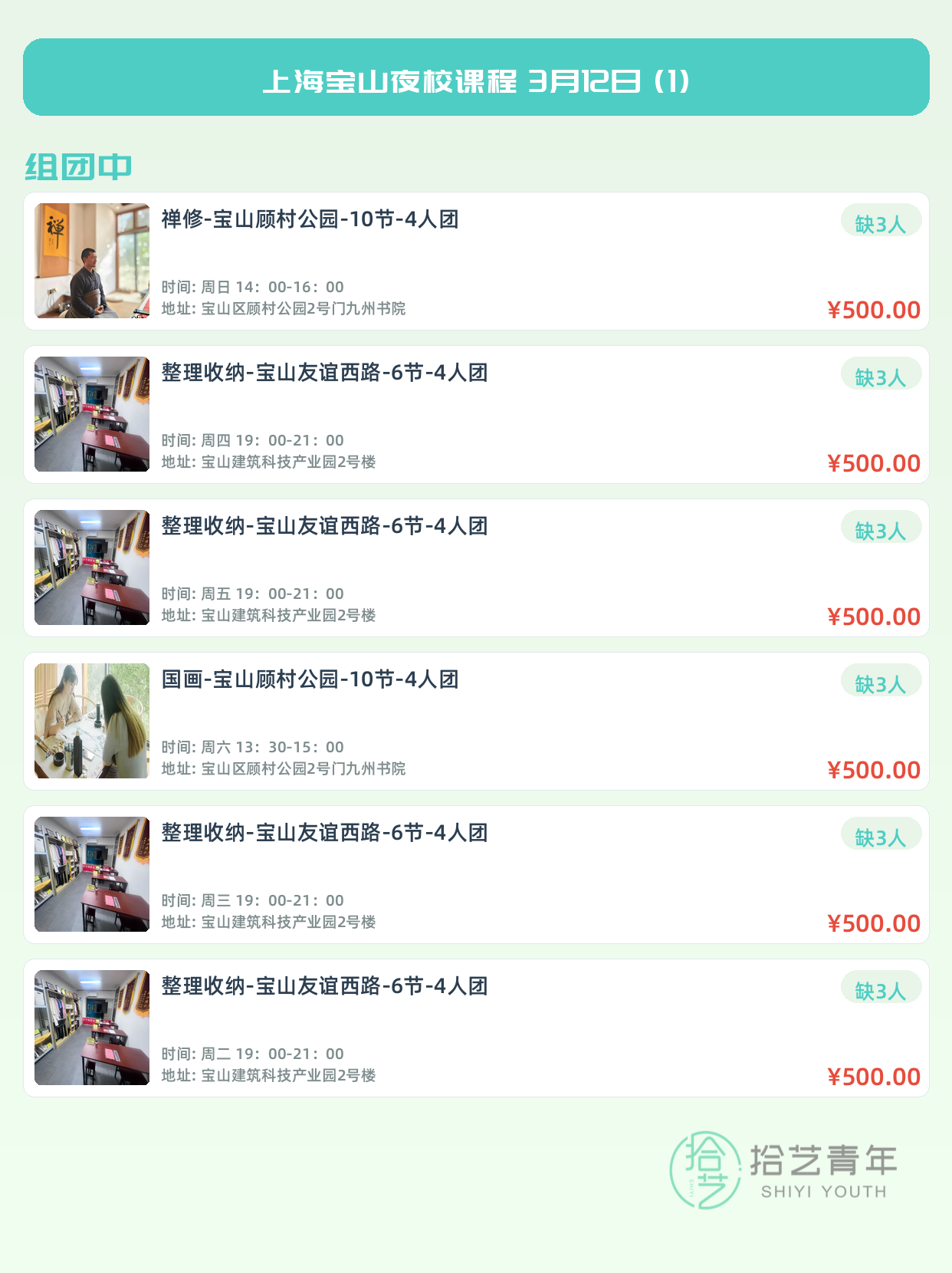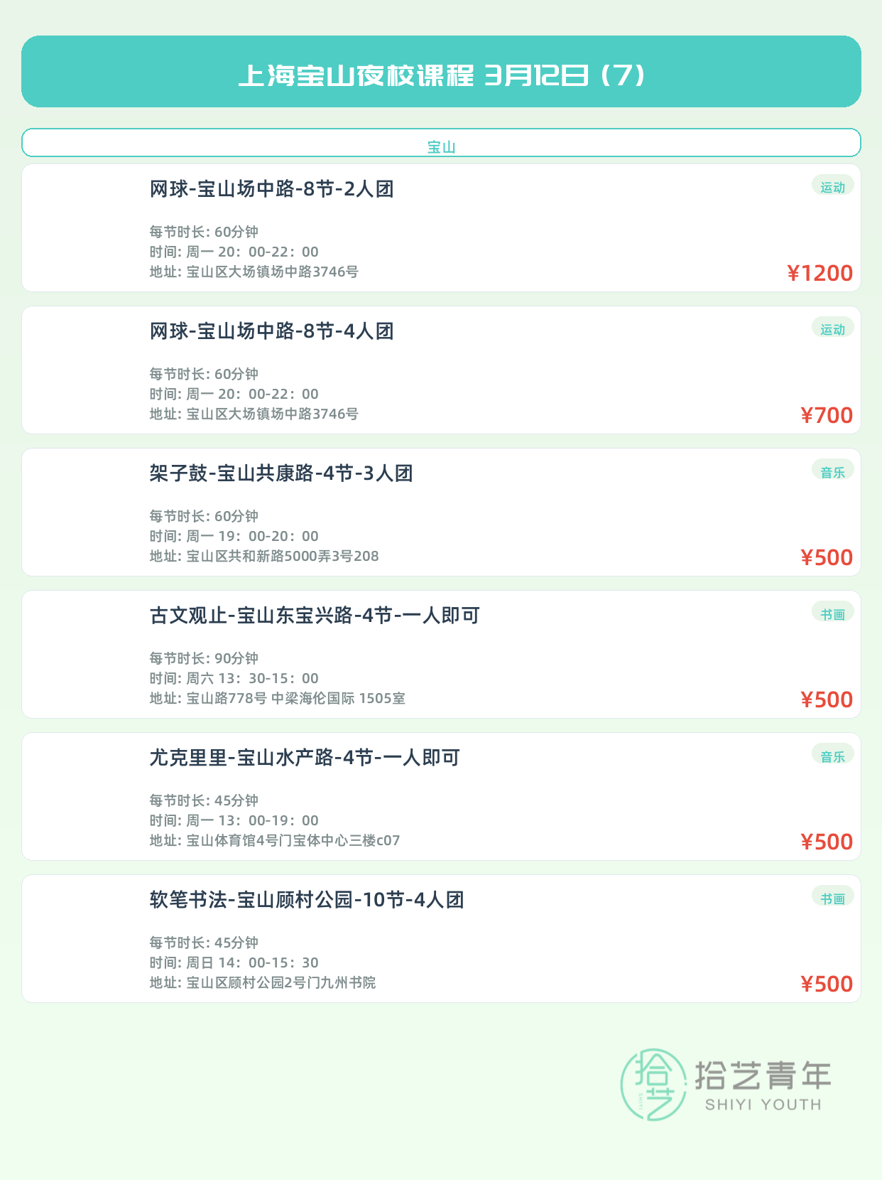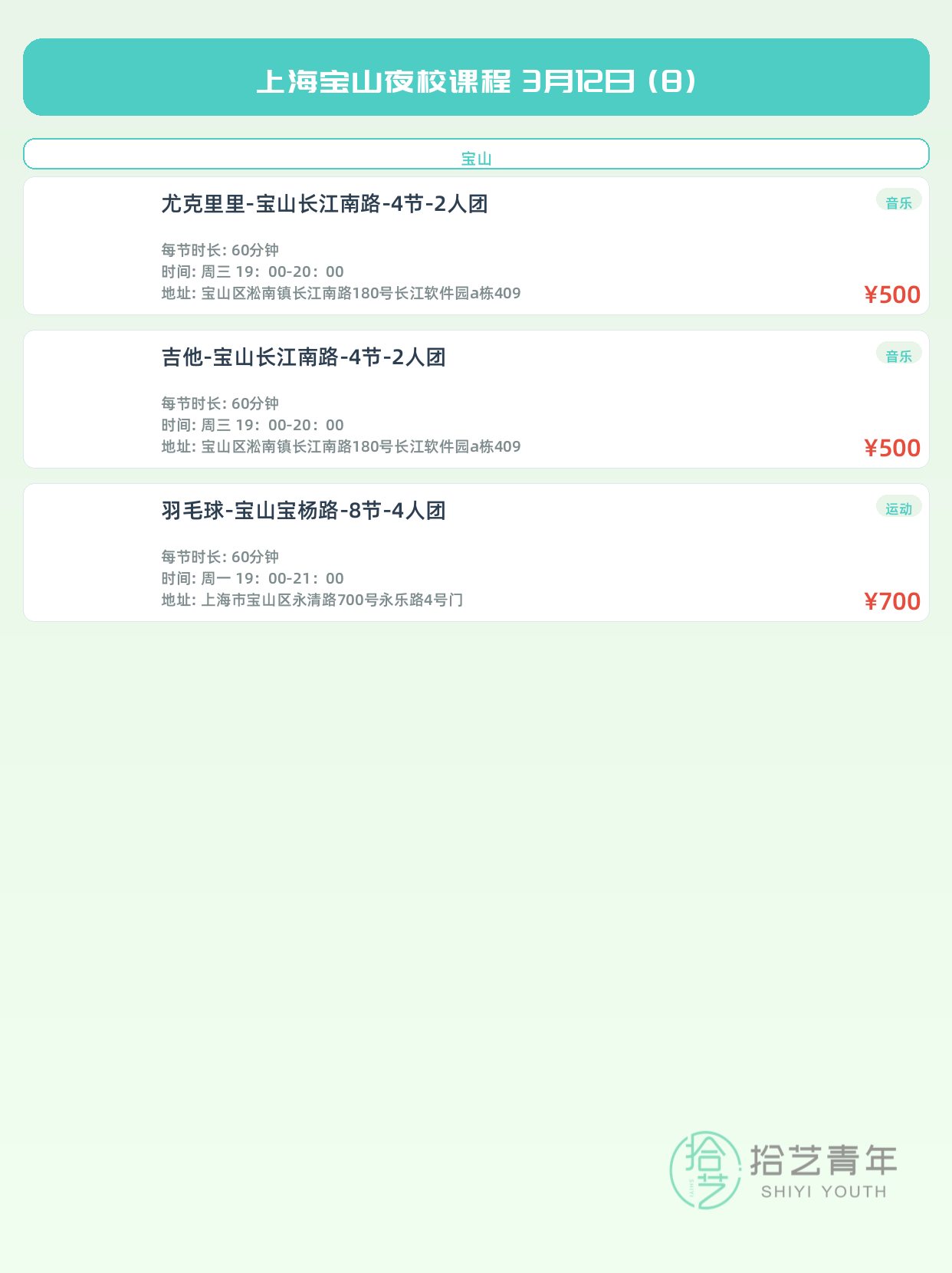 💡 提示:以上课程信息来自拾艺青年小程序,课程可能随报名动态变化,具体以小程序实时信息为准。
