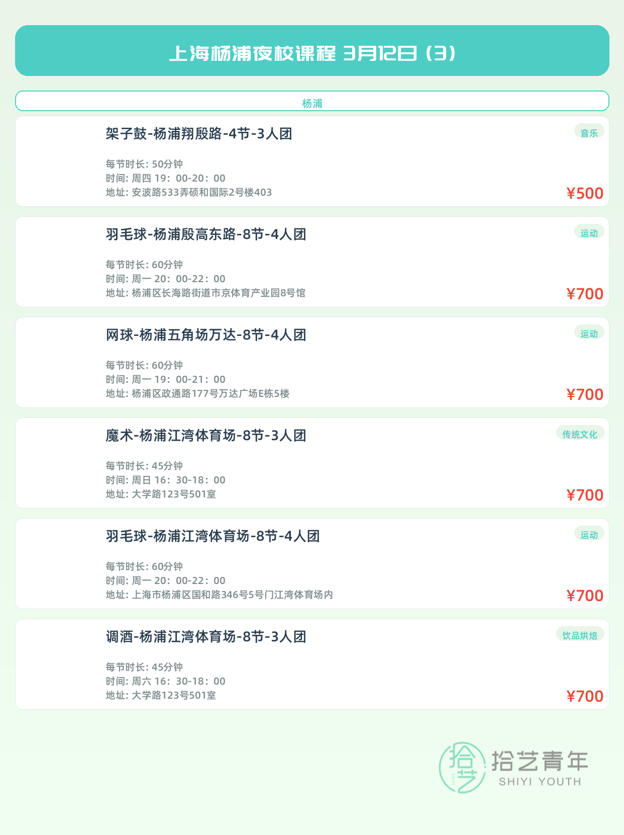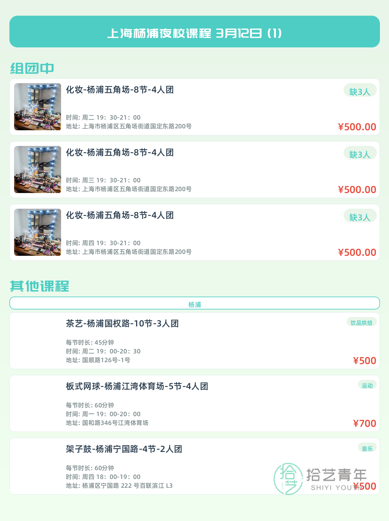 💡 提示:以上课程信息来自拾艺青年小程序,课程可能随报名动态变化,具体以小程序实时信息为准。