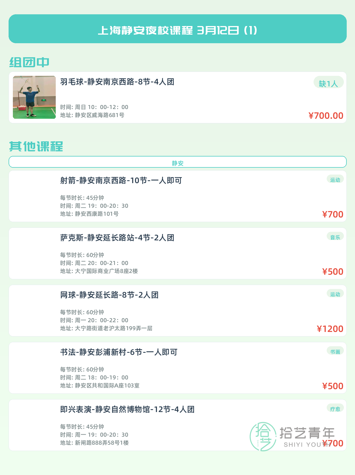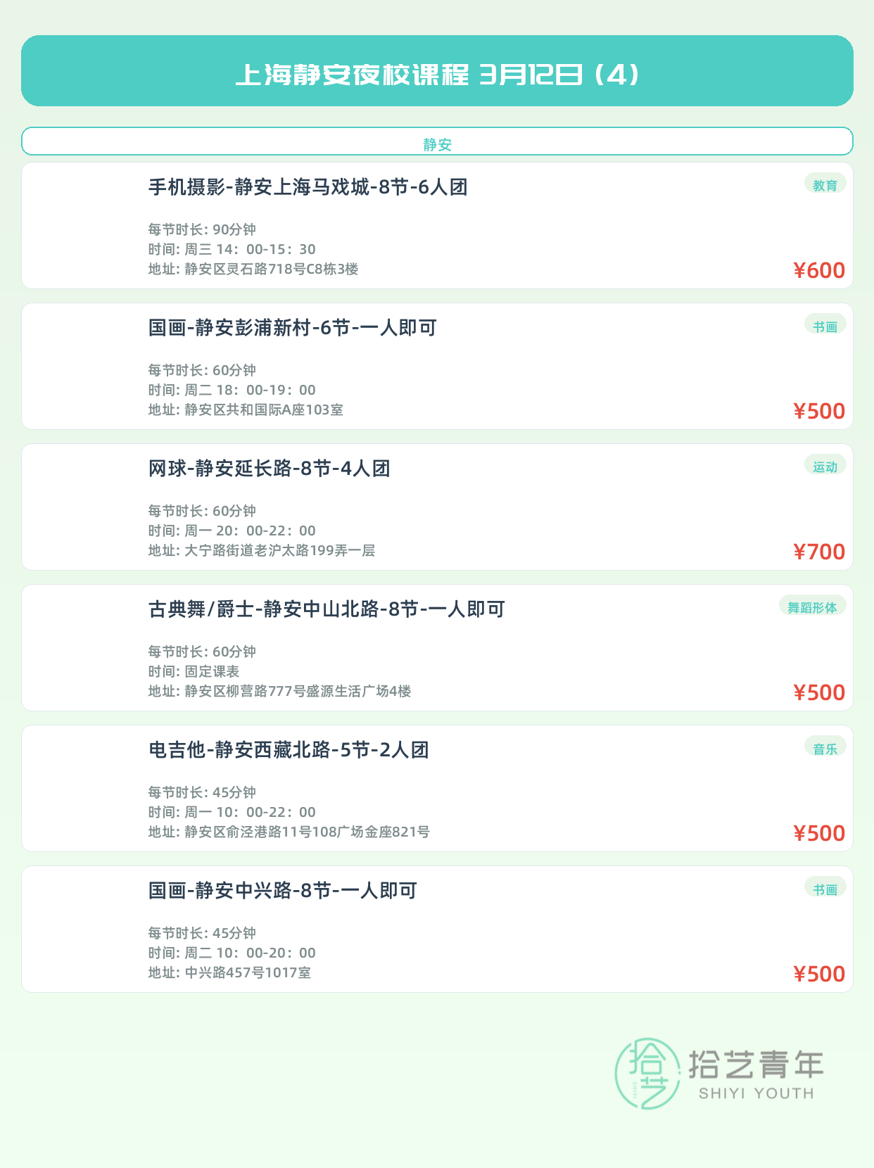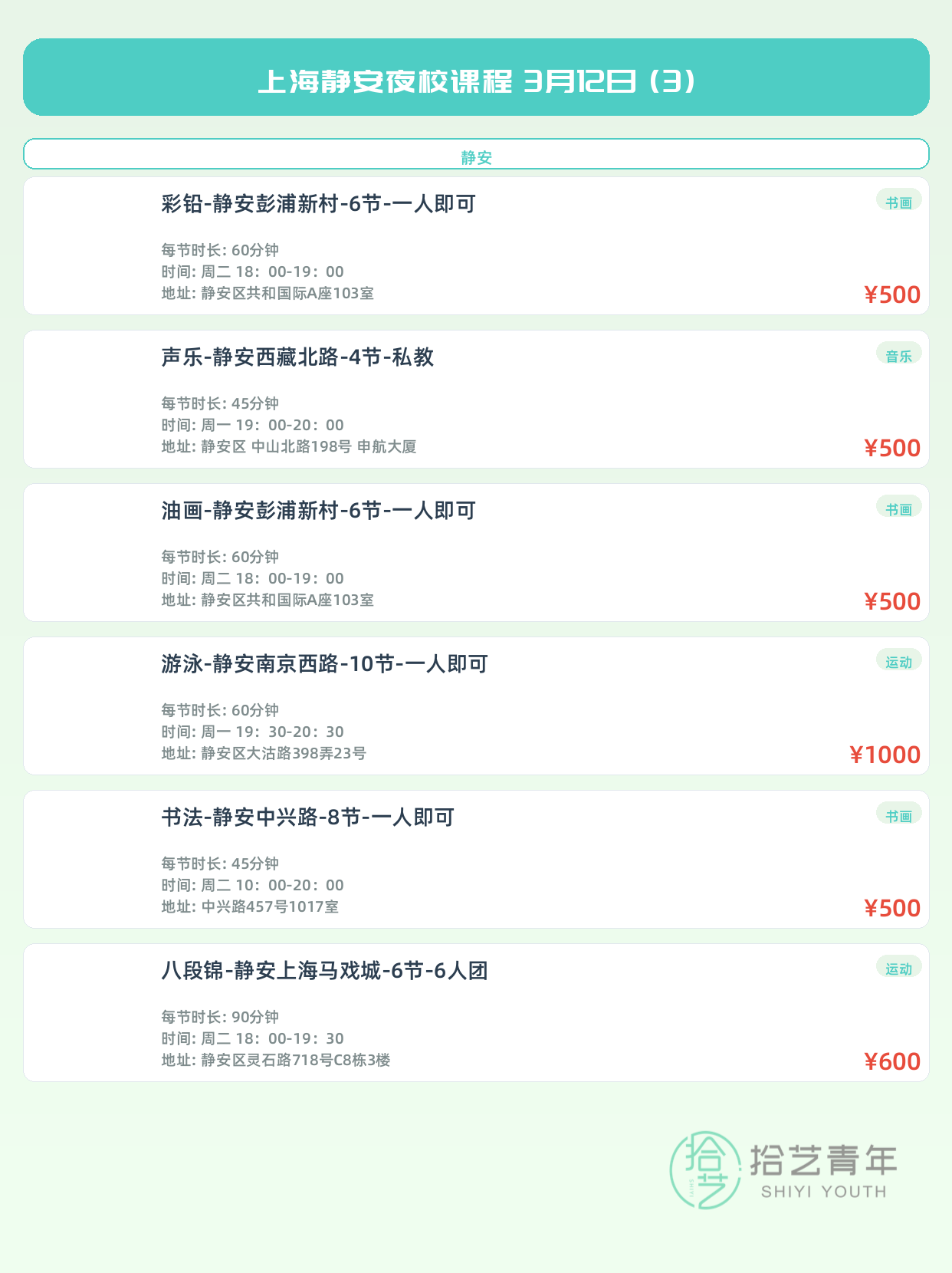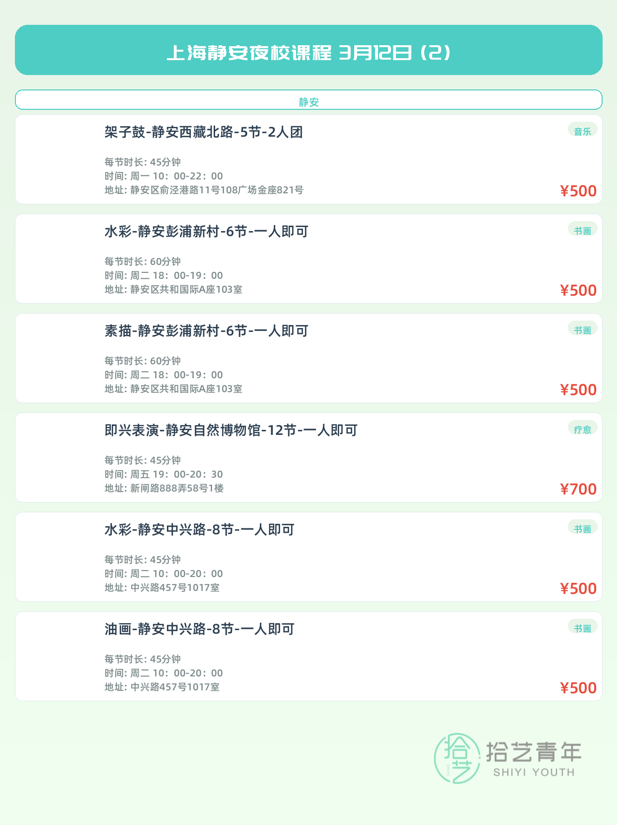 💡 提示:以上课程信息来自拾艺青年小程序,课程可能随报名动态变化,具体以小程序实时信息为准。