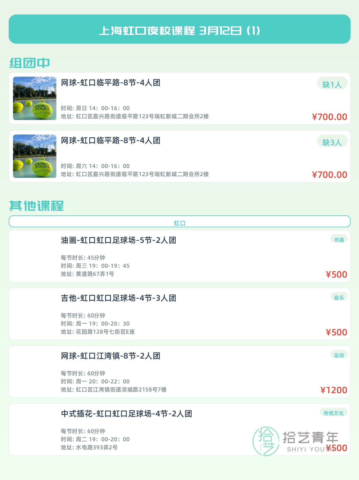 💡 提示:以上课程信息来自拾艺青年小程序,课程可能随报名动态变化,具体以小程序实时信息为准。