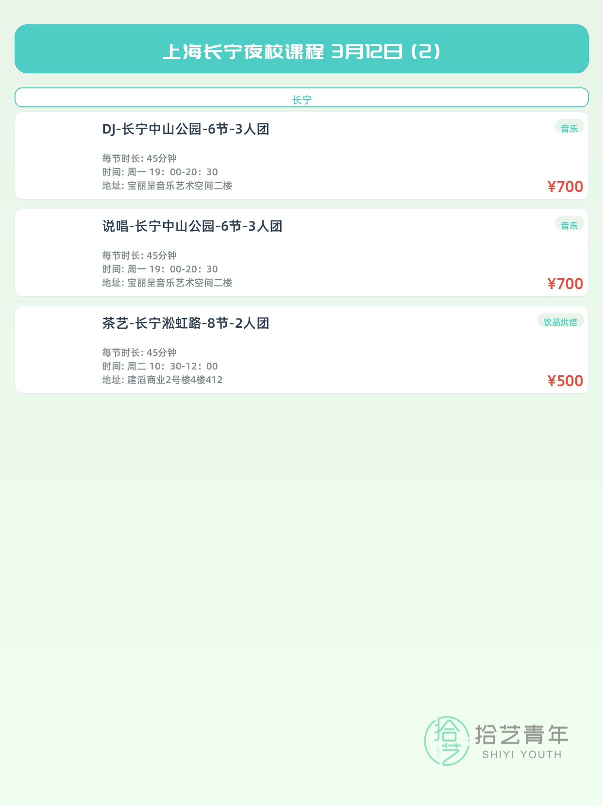 💡 提示:以上课程信息来自拾艺青年小程序,课程可能随报名动态变化,具体以小程序实时信息为准。