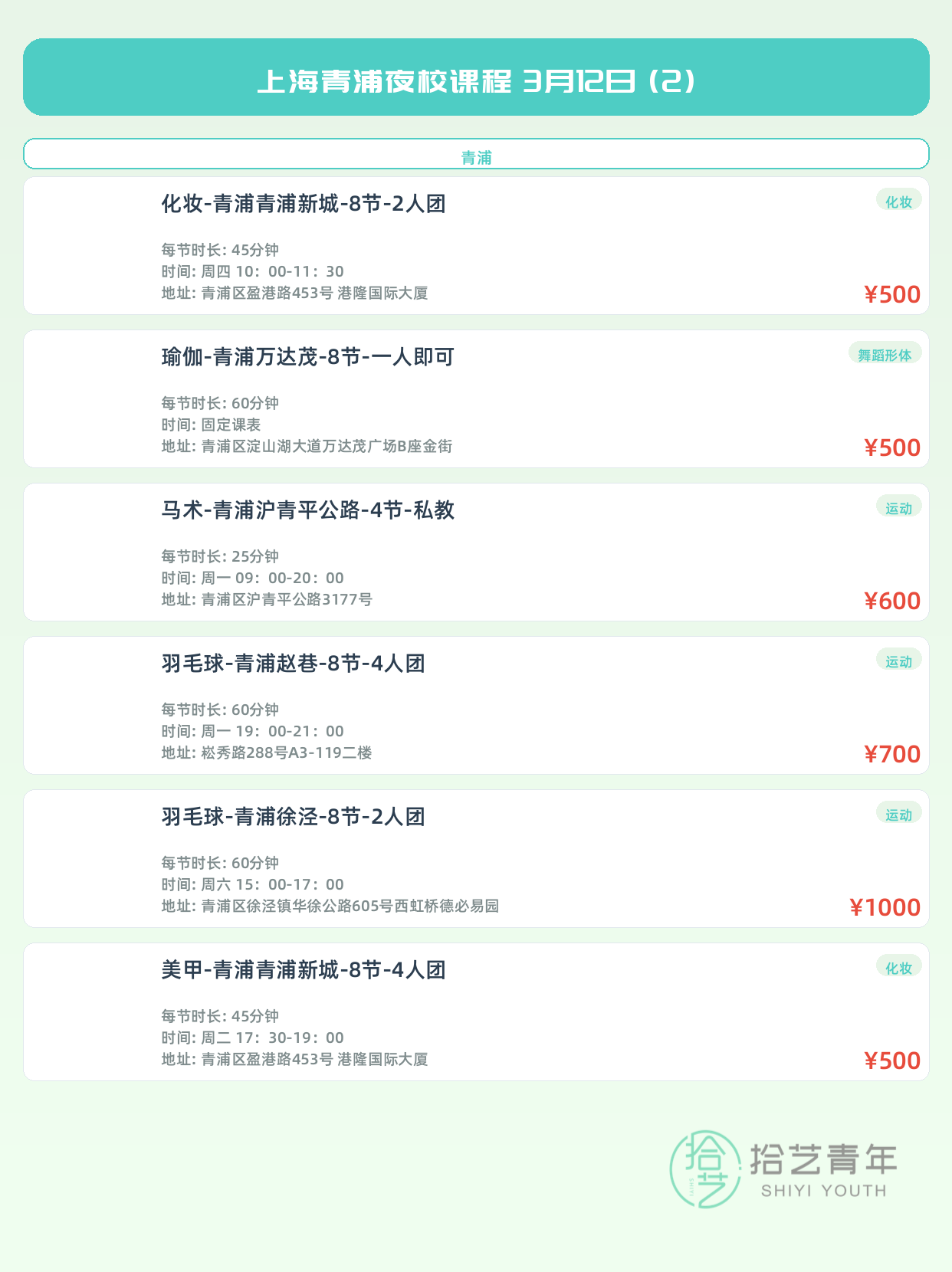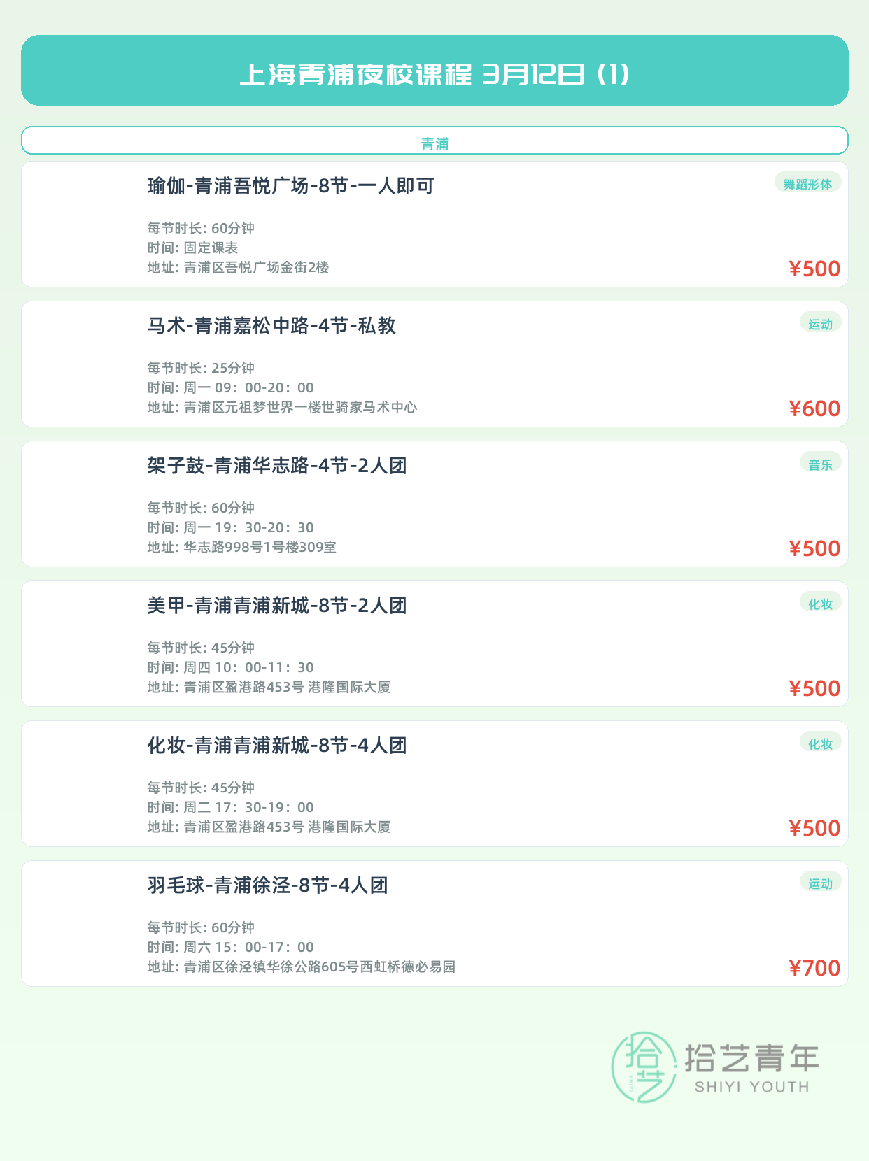 💡 提示:以上课程信息来自拾艺青年小程序,课程可能随报名动态变化,具体以小程序实时信息为准。