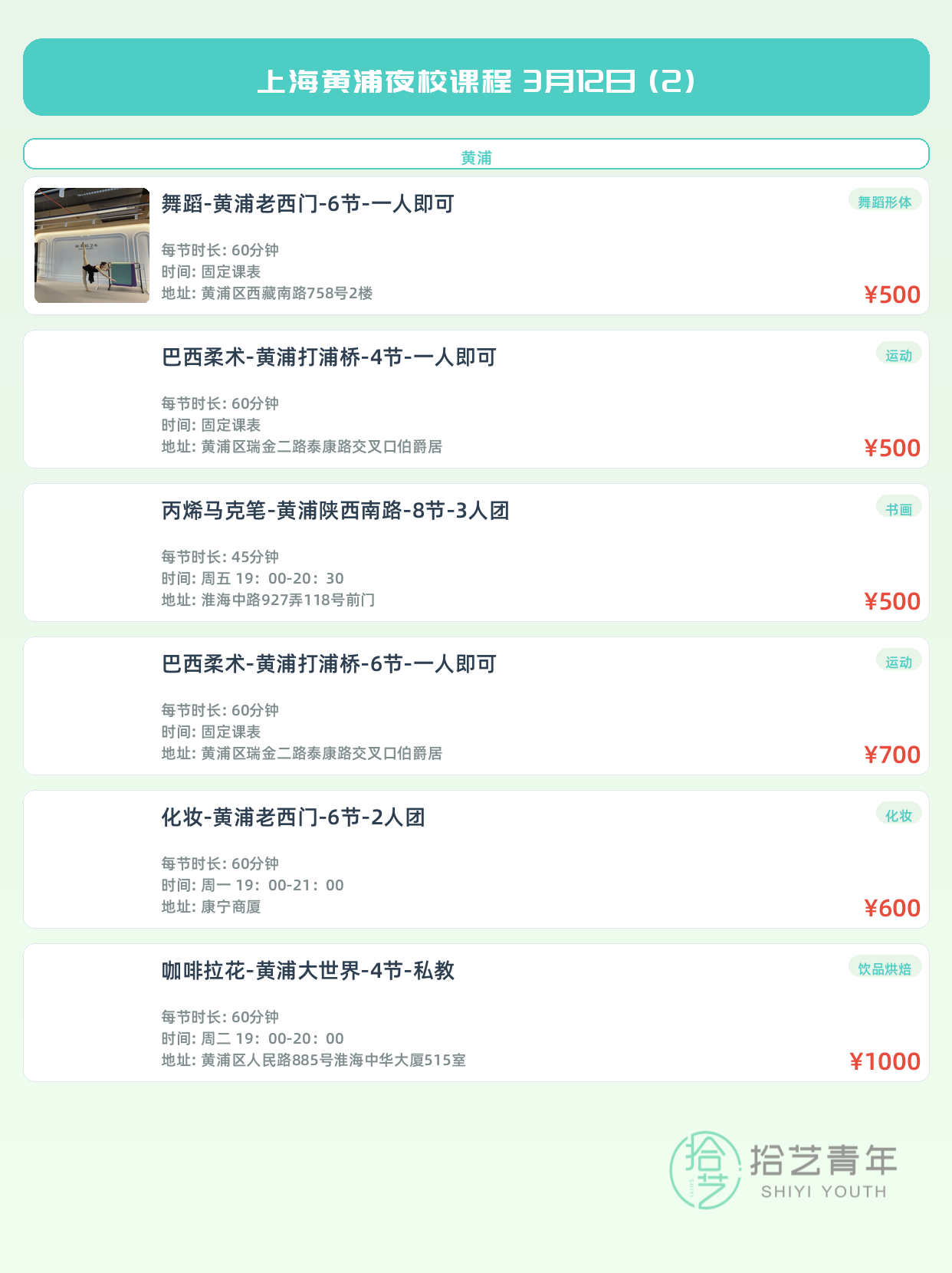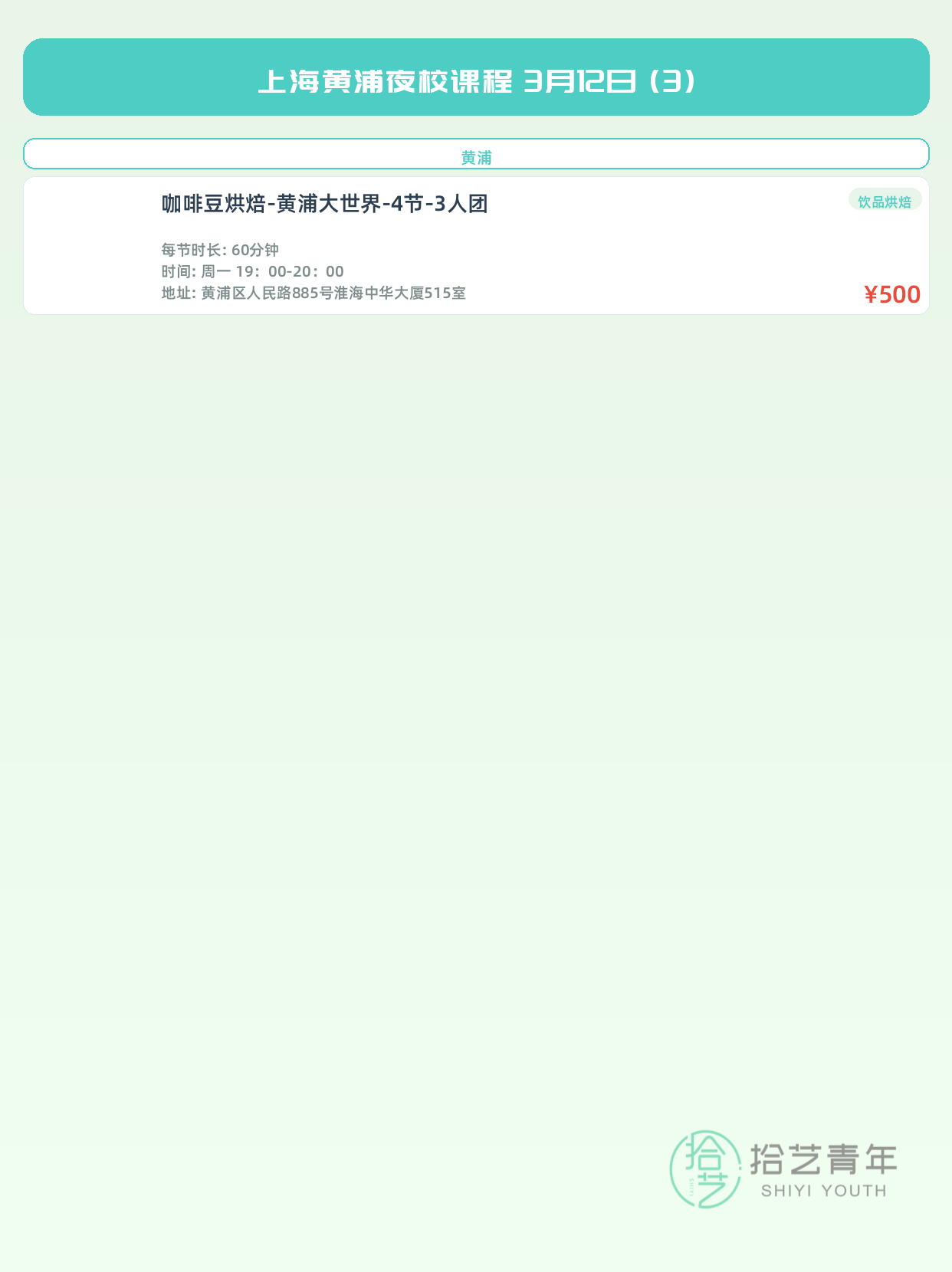 💡 提示:以上课程信息来自拾艺青年小程序,课程可能随报名动态变化,具体以小程序实时信息为准。