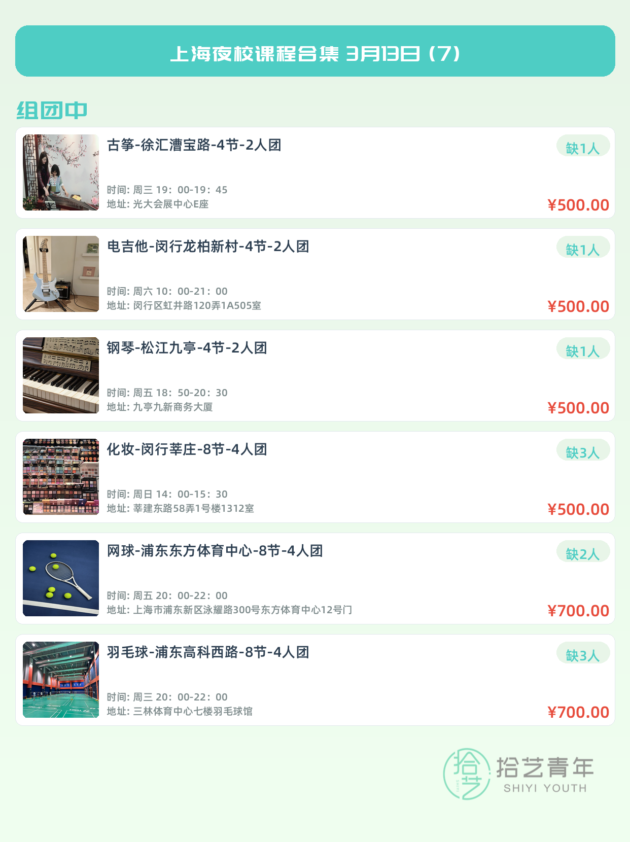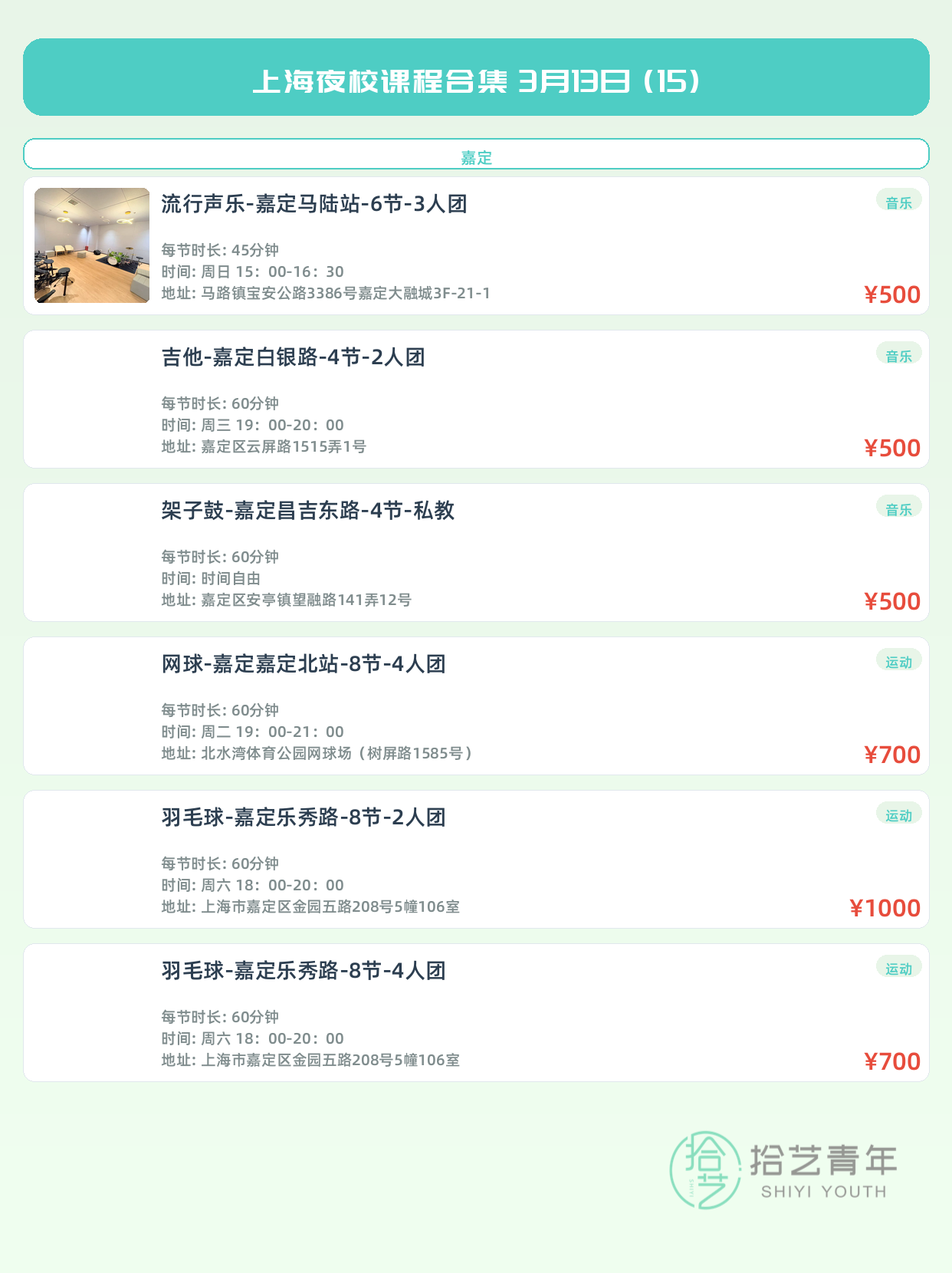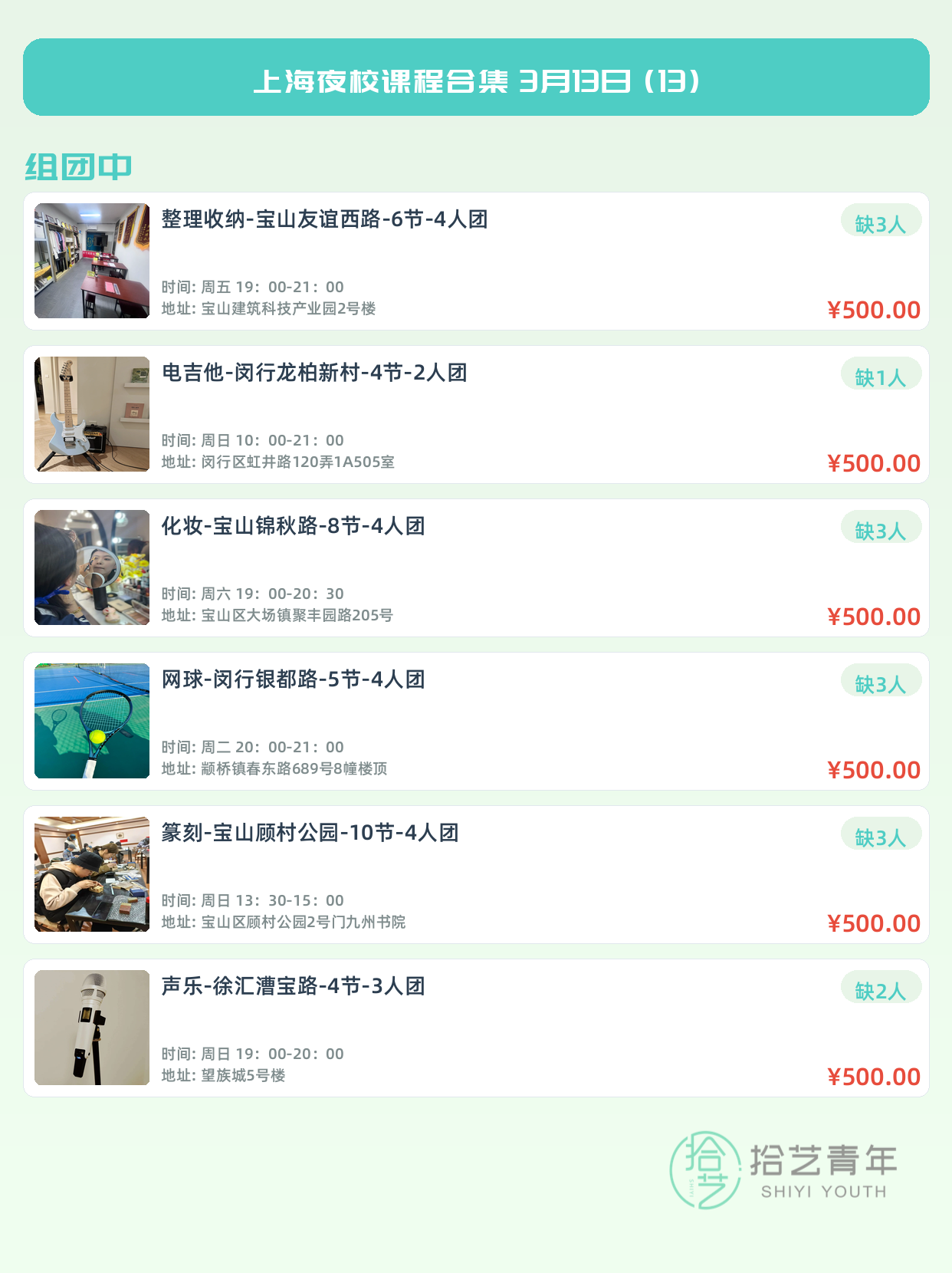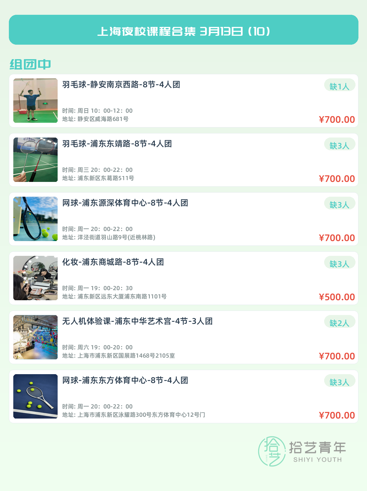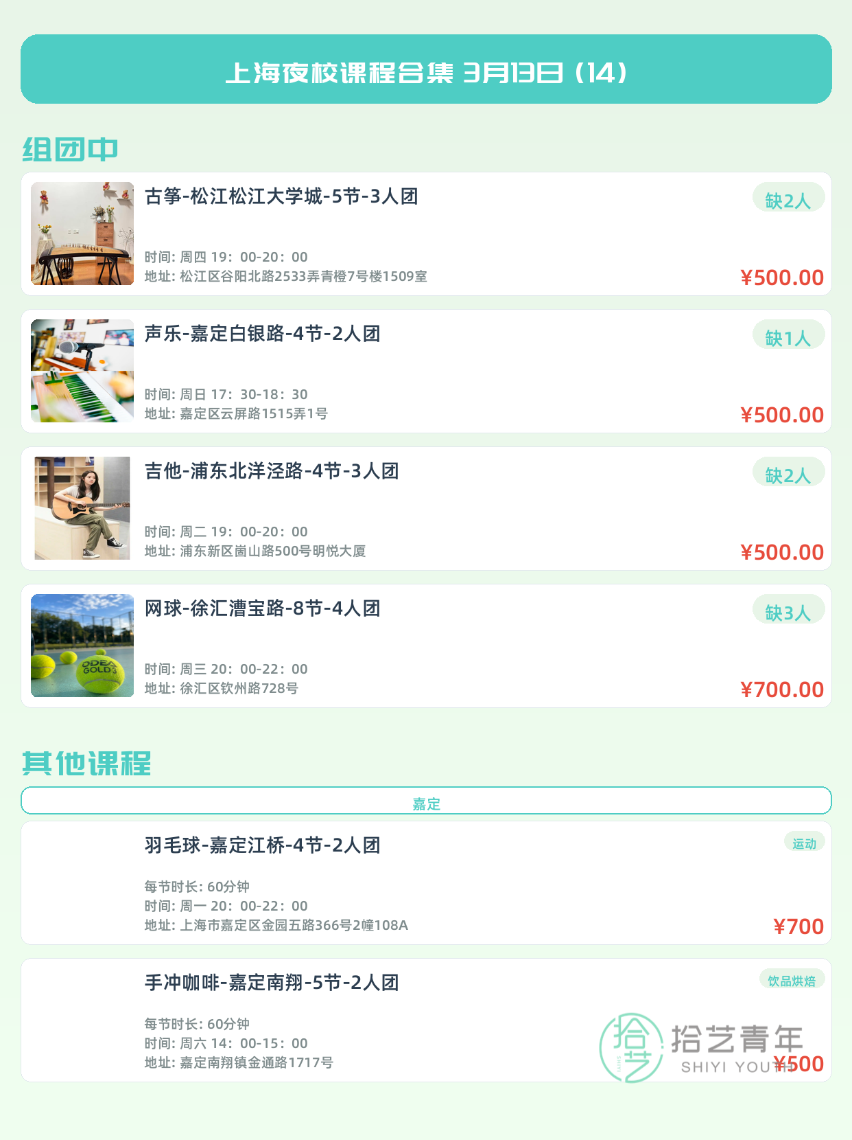 💡 提示:以上课程信息来自拾艺青年小程序,课程可能随报名动态变化,具体以小程序实时信息为准。