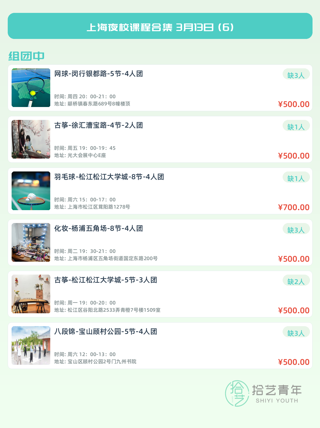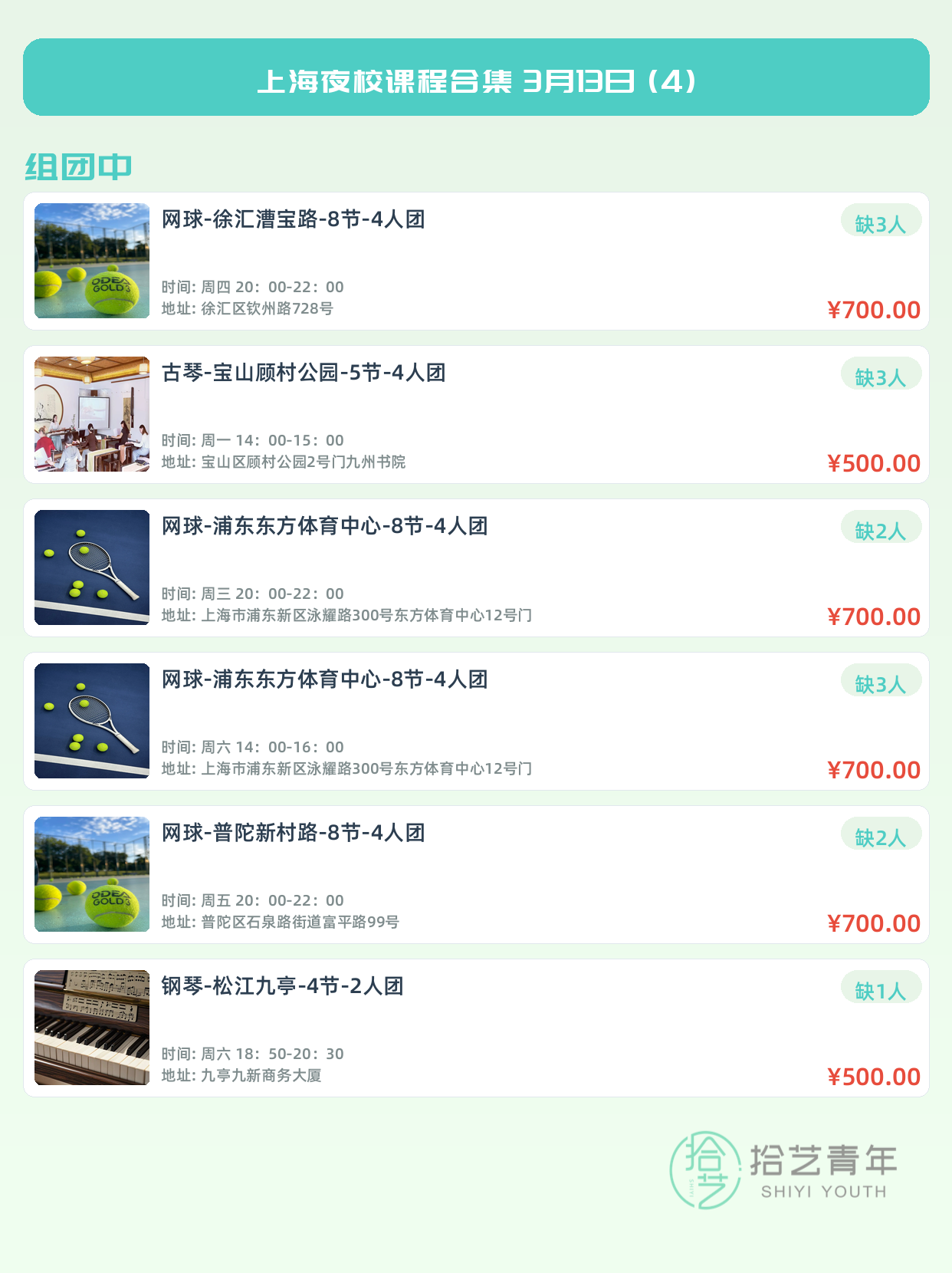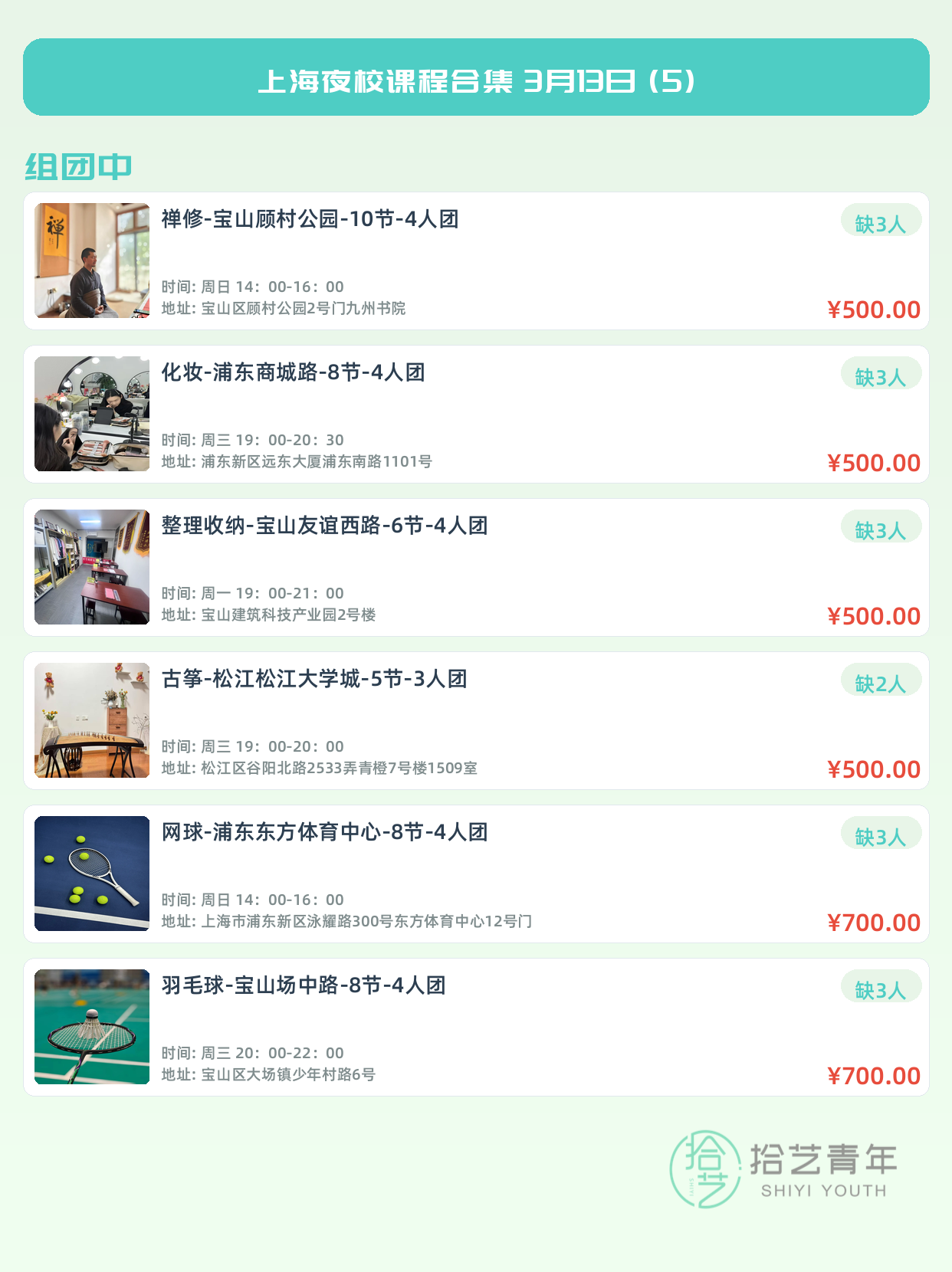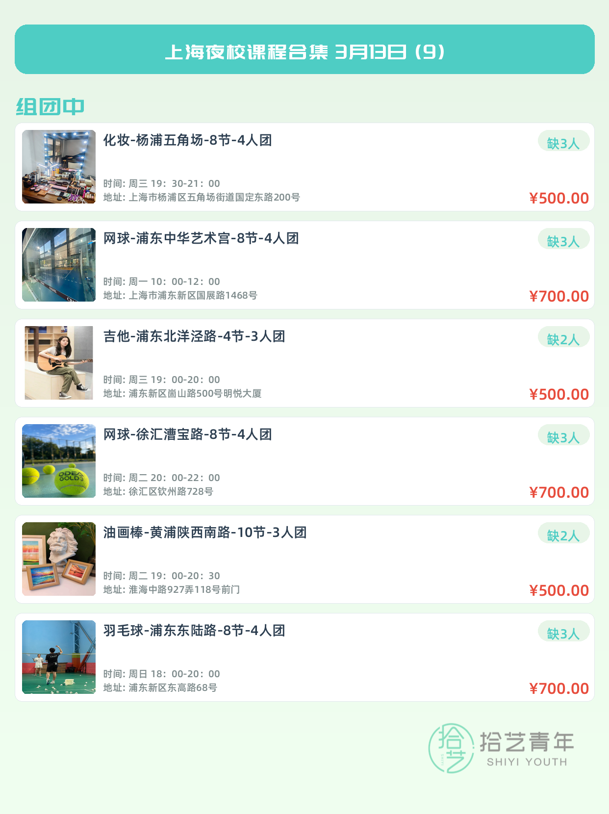 💡 提示:以上课程信息来自拾艺青年小程序,课程可能随报名动态变化,具体以小程序实时信息为准。