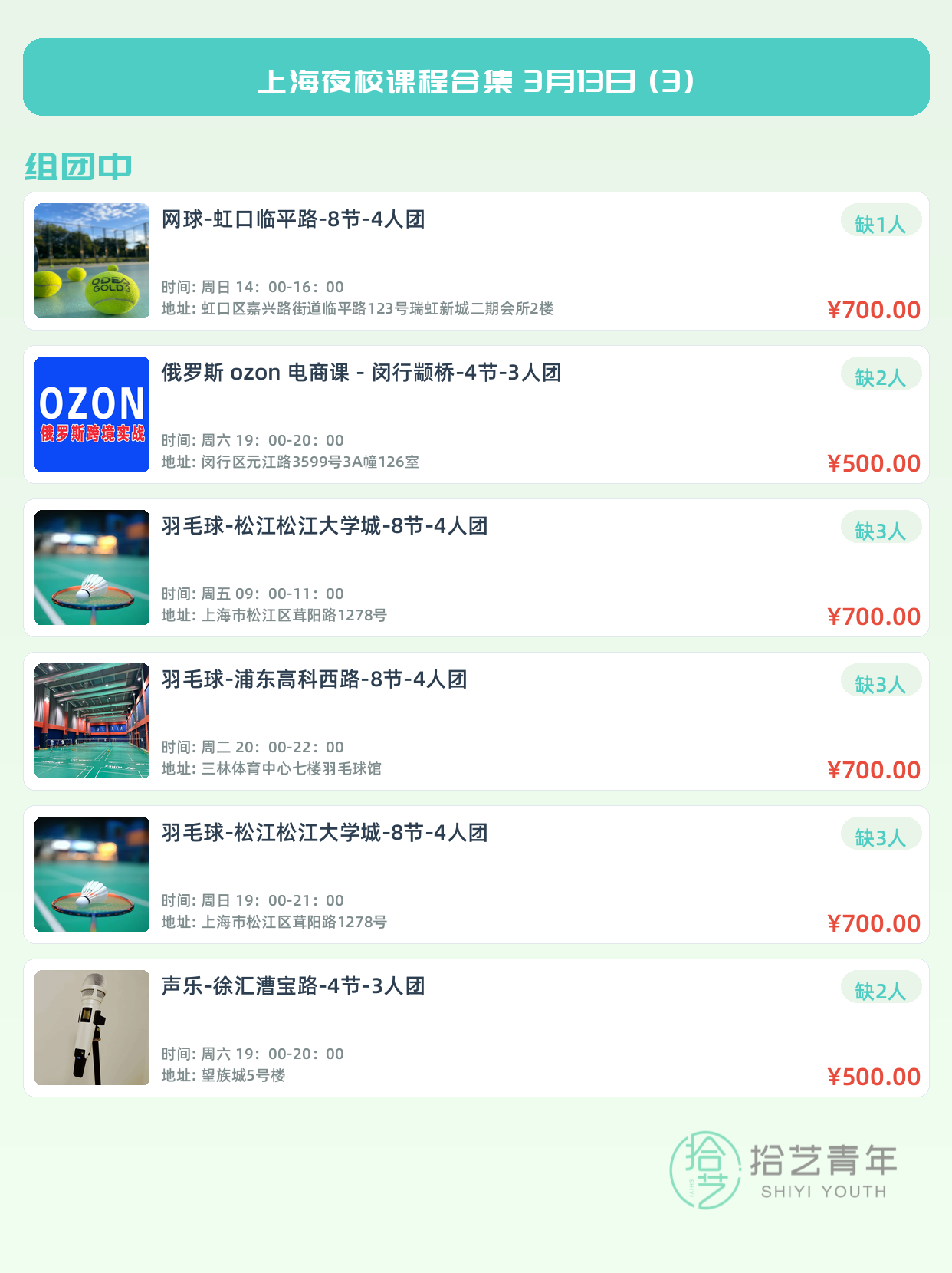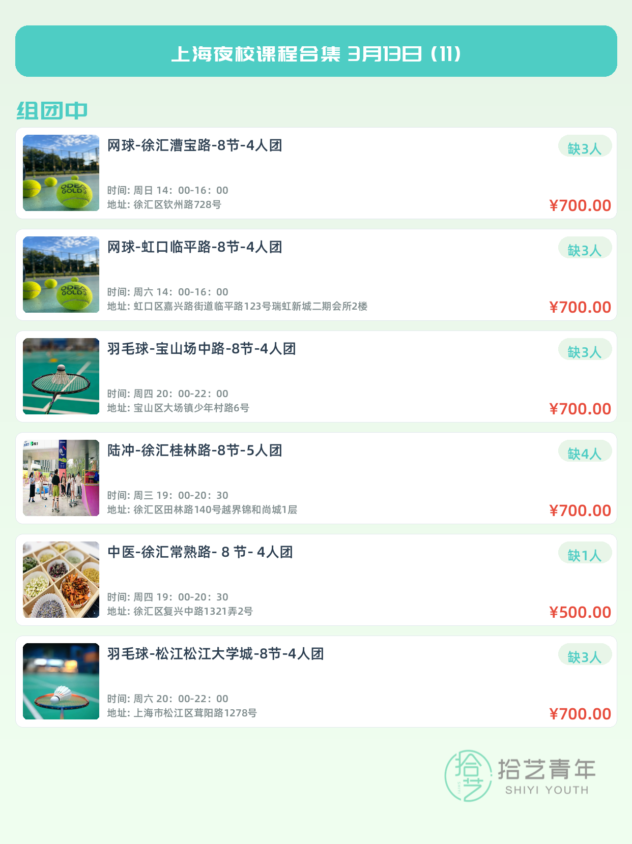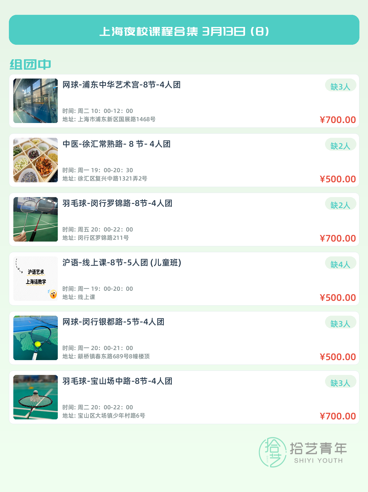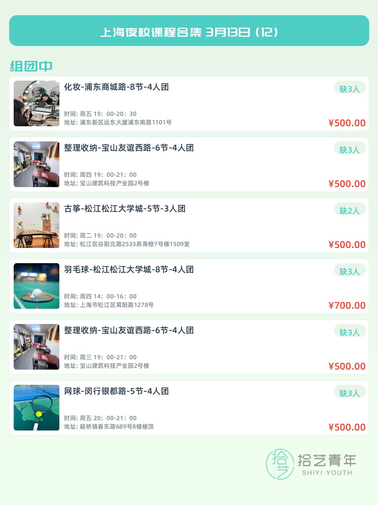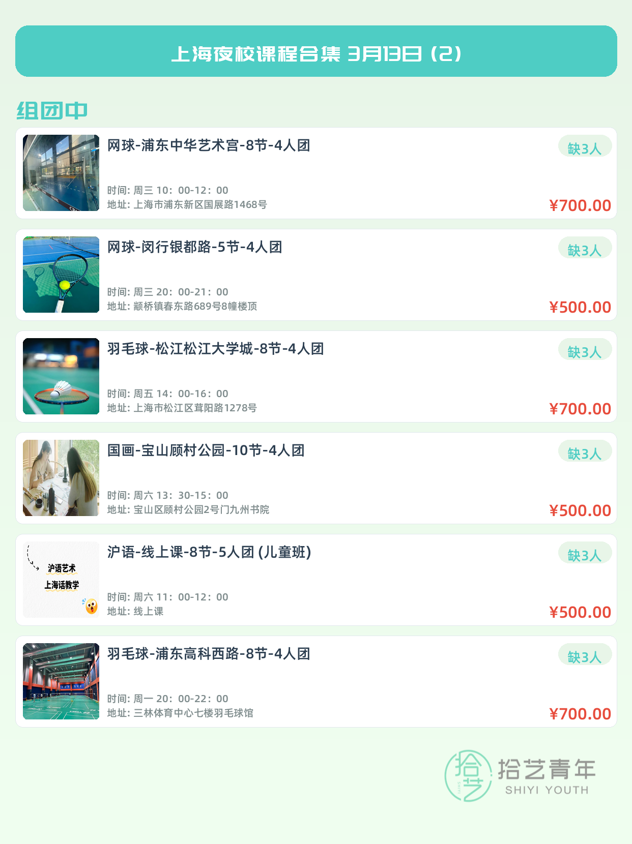 💡 提示:以上课程信息来自拾艺青年小程序,课程可能随报名动态变化,具体以小程序实时信息为准。