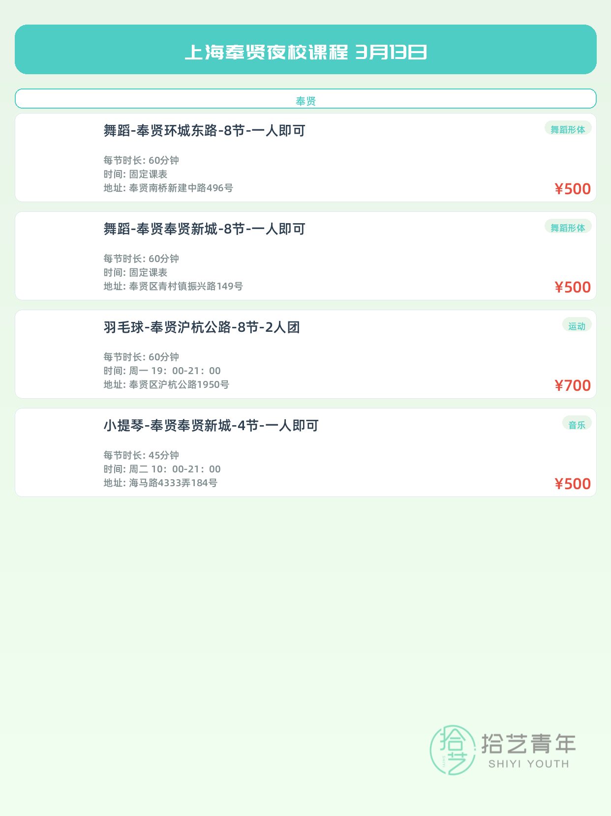 资讯>综合>正文3月13日上海奉贤夜校课程合集拾艺青年2026-03-131 / 2【其他课程】📌 舞蹈-奉贤奉贤新城-8节-一人即可📌 舞蹈-奉贤环城东路-8节-一人即可📌 小提琴-奉贤奉贤新城-4节-一人即可📌 羽毛球-奉贤沪杭公路-8节-2人团详见图片,欢迎奉贤的小伙伴报名。💡 提示:以上课程信息来自拾艺青年小程序,课程可能随报名动态变化,具体以小程序实时信息为准。👉 微信小程序链接:#小程序://拾艺青年/WmfwH22mnQUxZwb