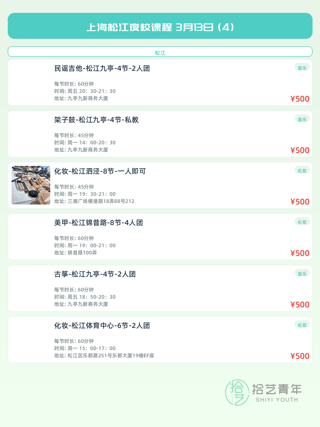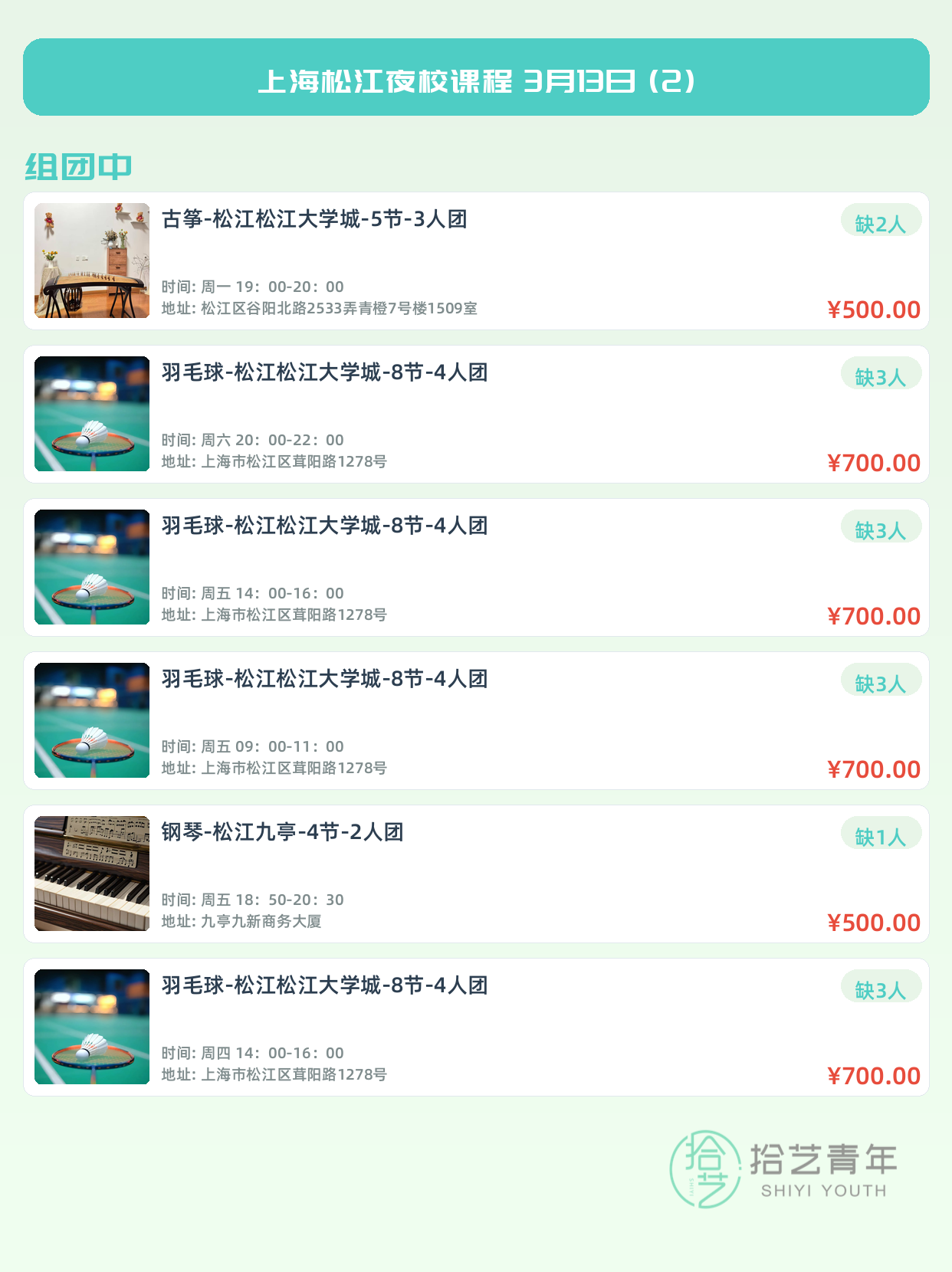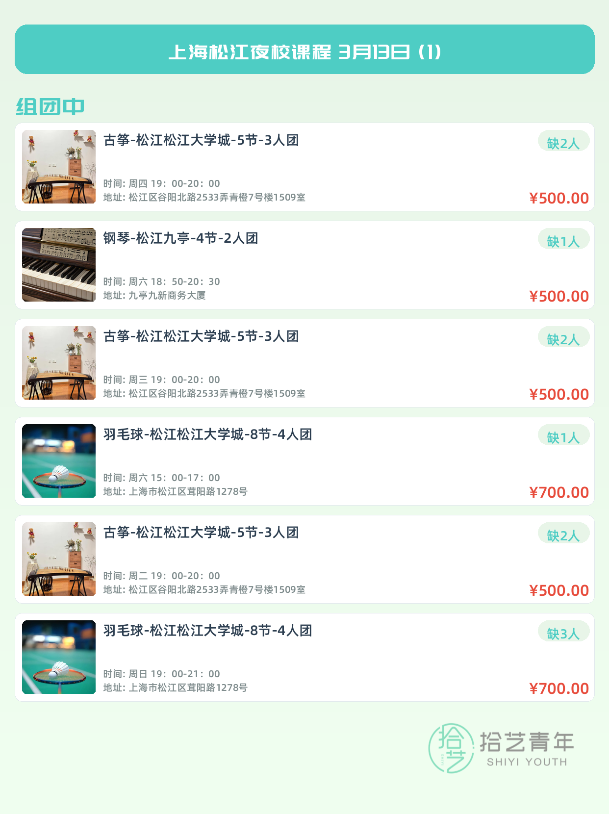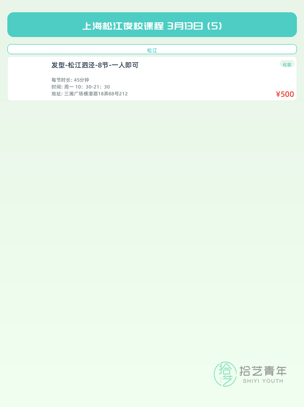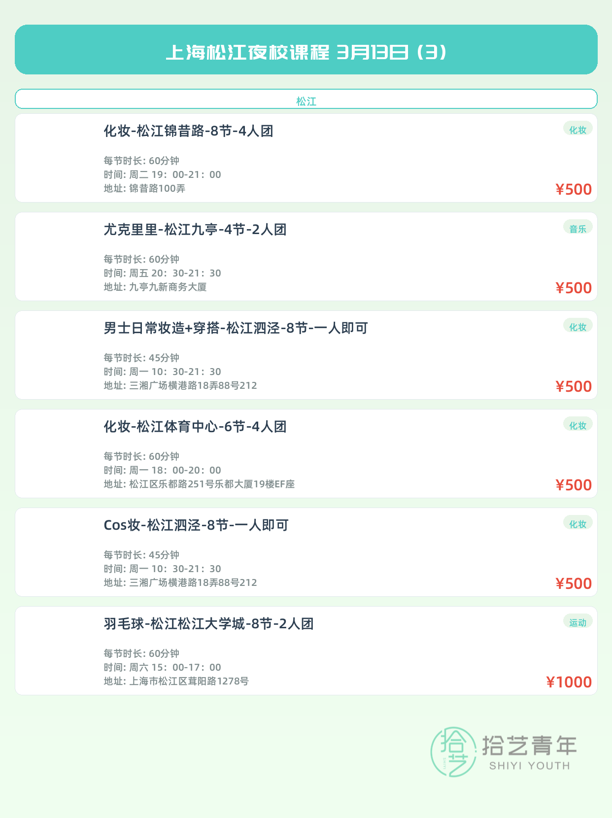 💡 提示:以上课程信息来自拾艺青年小程序,课程可能随报名动态变化,具体以小程序实时信息为准。