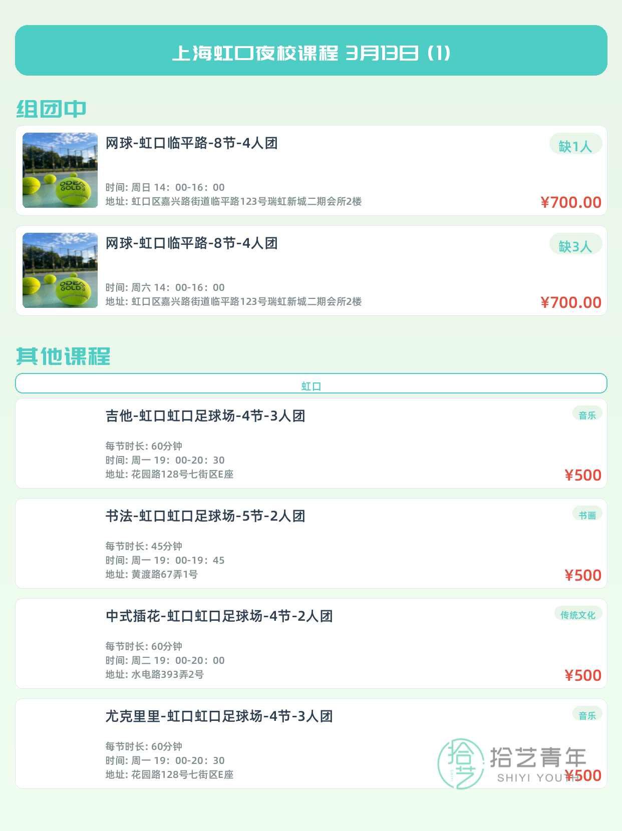 💡 提示:以上课程信息来自拾艺青年小程序,课程可能随报名动态变化,具体以小程序实时信息为准。