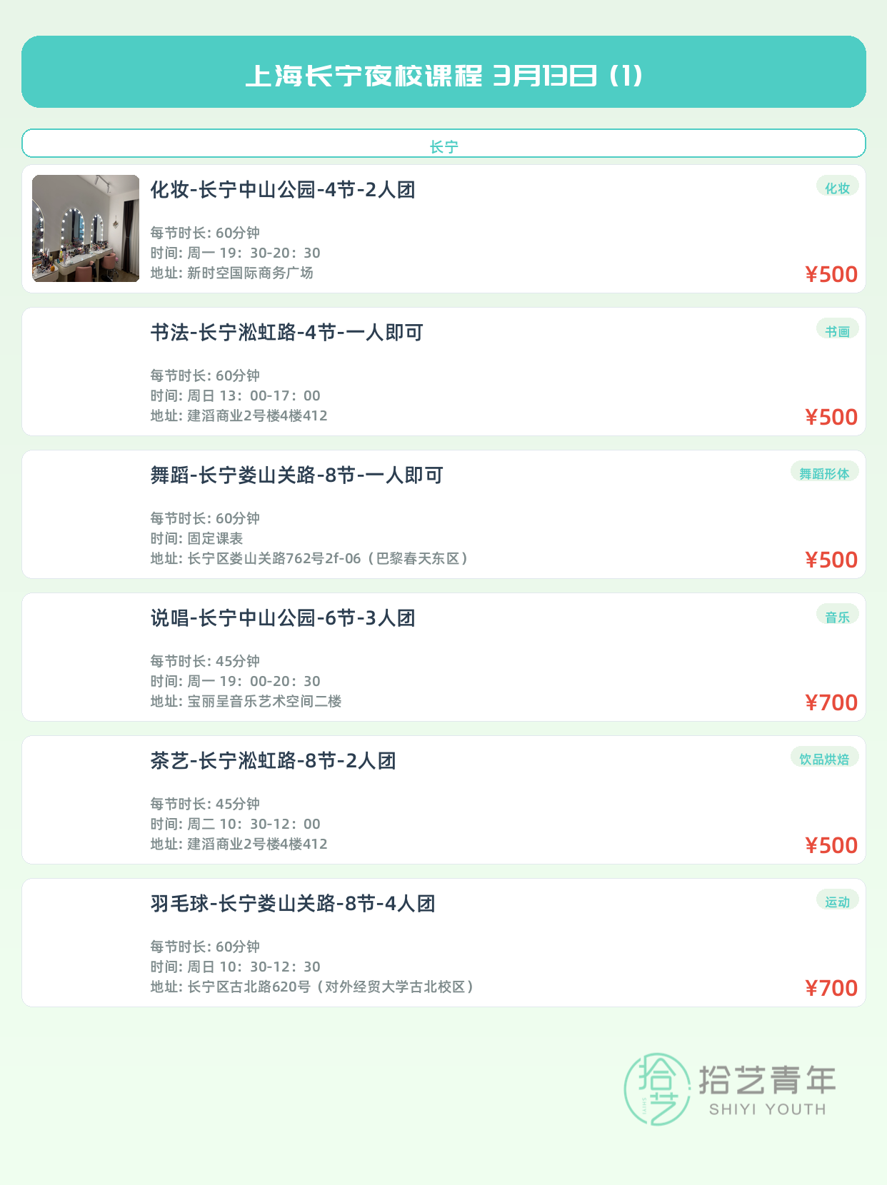 💡 提示:以上课程信息来自拾艺青年小程序,课程可能随报名动态变化,具体以小程序实时信息为准。