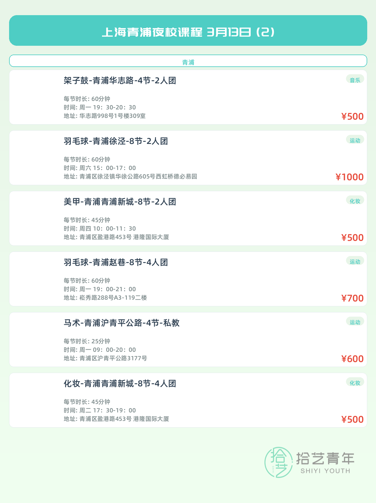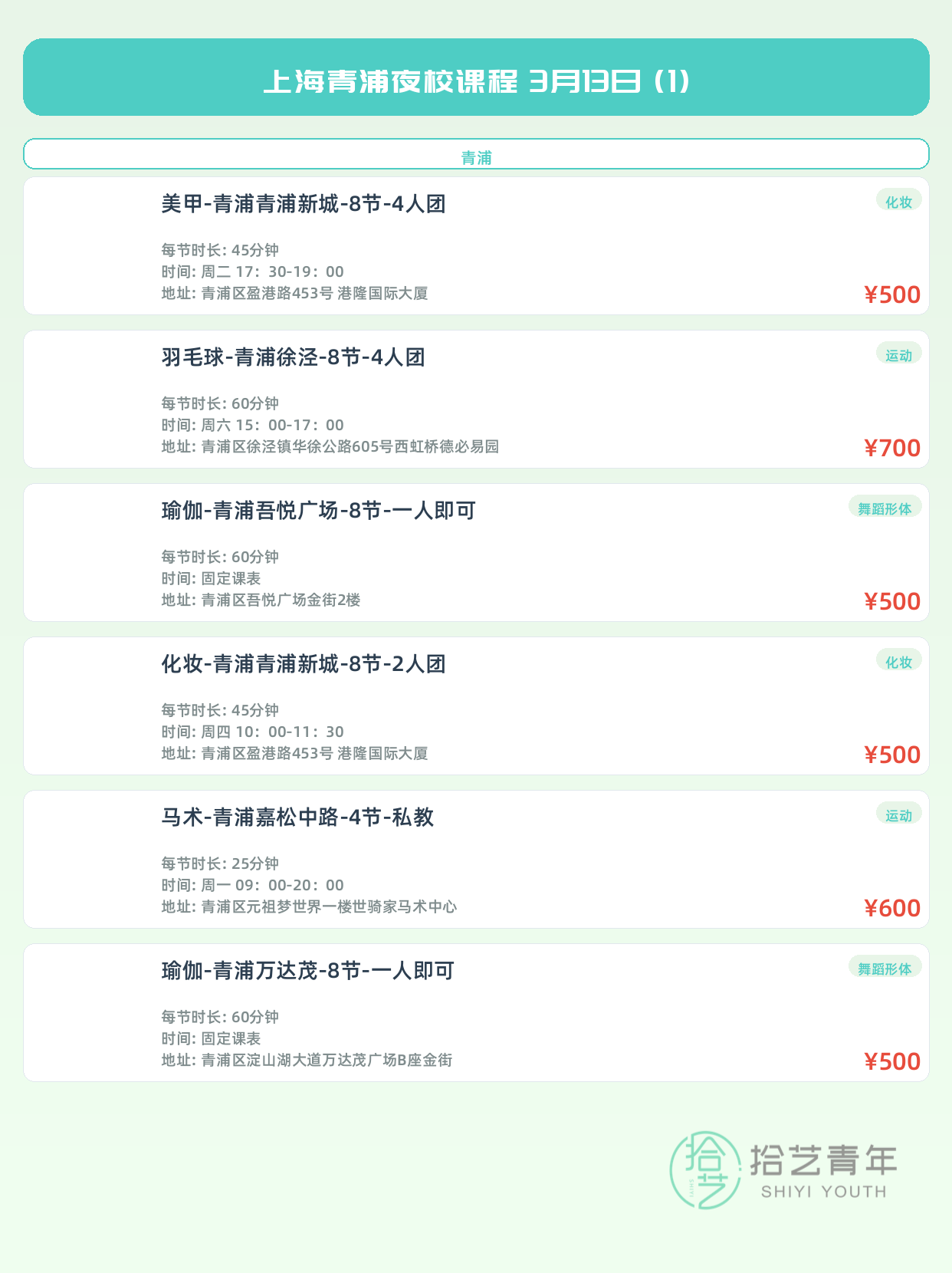 💡 提示:以上课程信息来自拾艺青年小程序,课程可能随报名动态变化,具体以小程序实时信息为准。