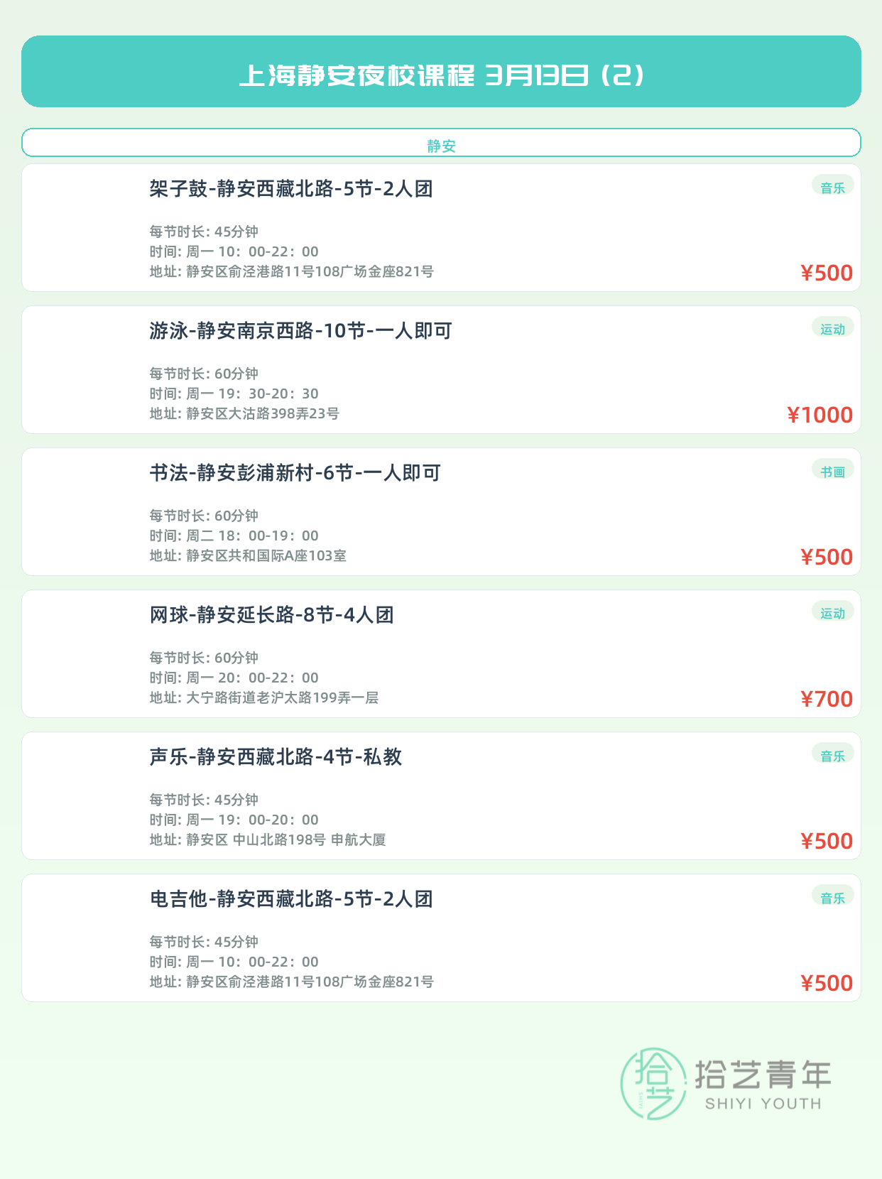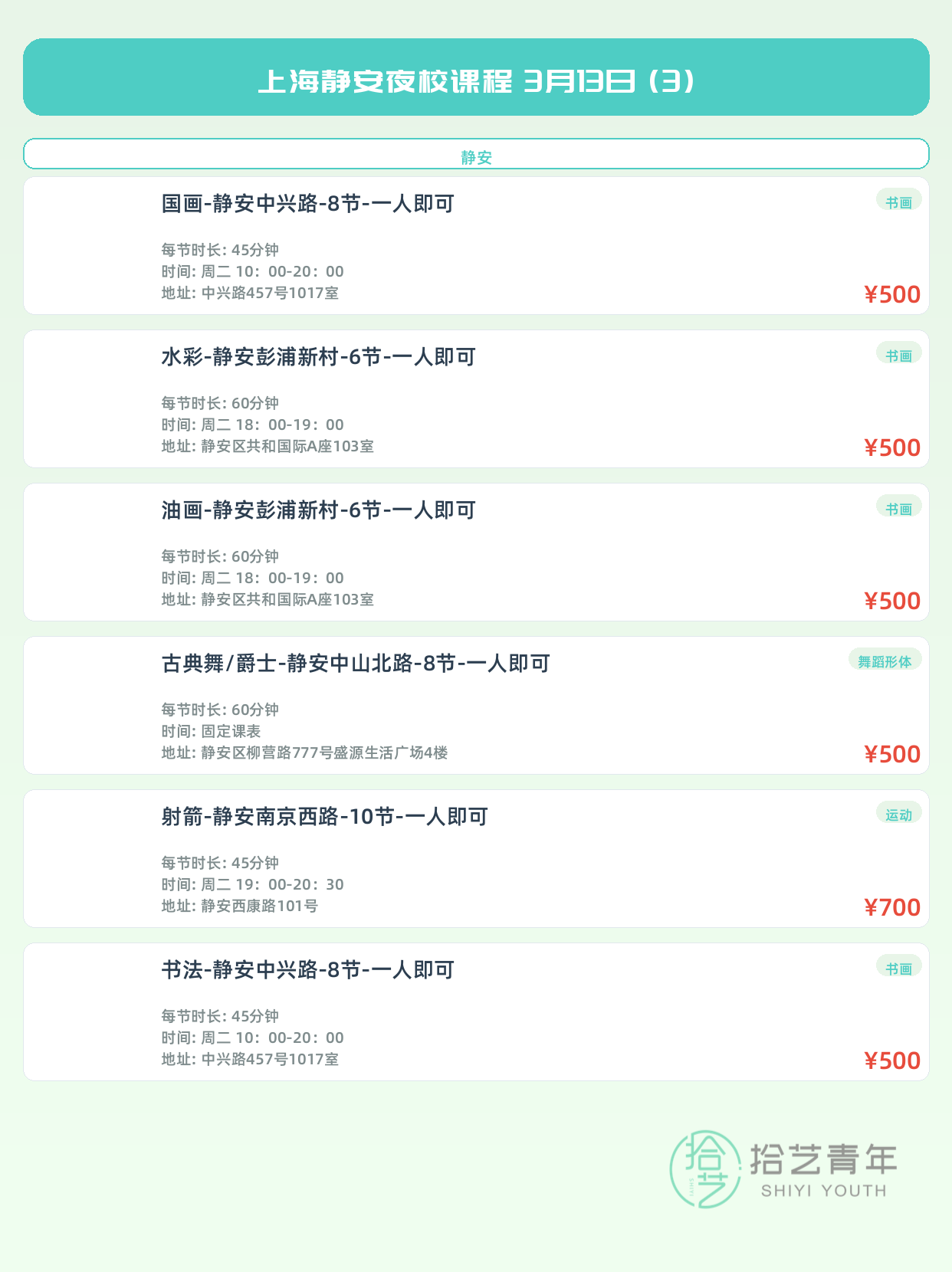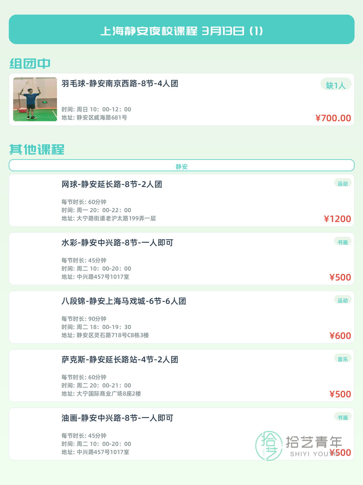 💡 提示:以上课程信息来自拾艺青年小程序,课程可能随报名动态变化,具体以小程序实时信息为准。
